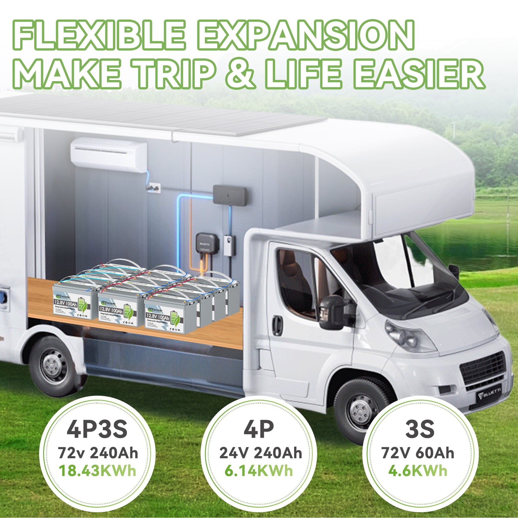 • 【FLEXIBLE EXPANSION MAX. 2S4P】This 24 volt 60ah lithium battery can be flexibly expanded to 2 in series and 4 in parallel for higher voltage (up to 48V) and higher capacity (up to 240Ah), reaching a 51.2V 240Ah battery system with a maximum capacity of 12.28KWh. You can easily upgrade your battery system as needed, and it is ideally suitable for both solar home storage and off-grid living.