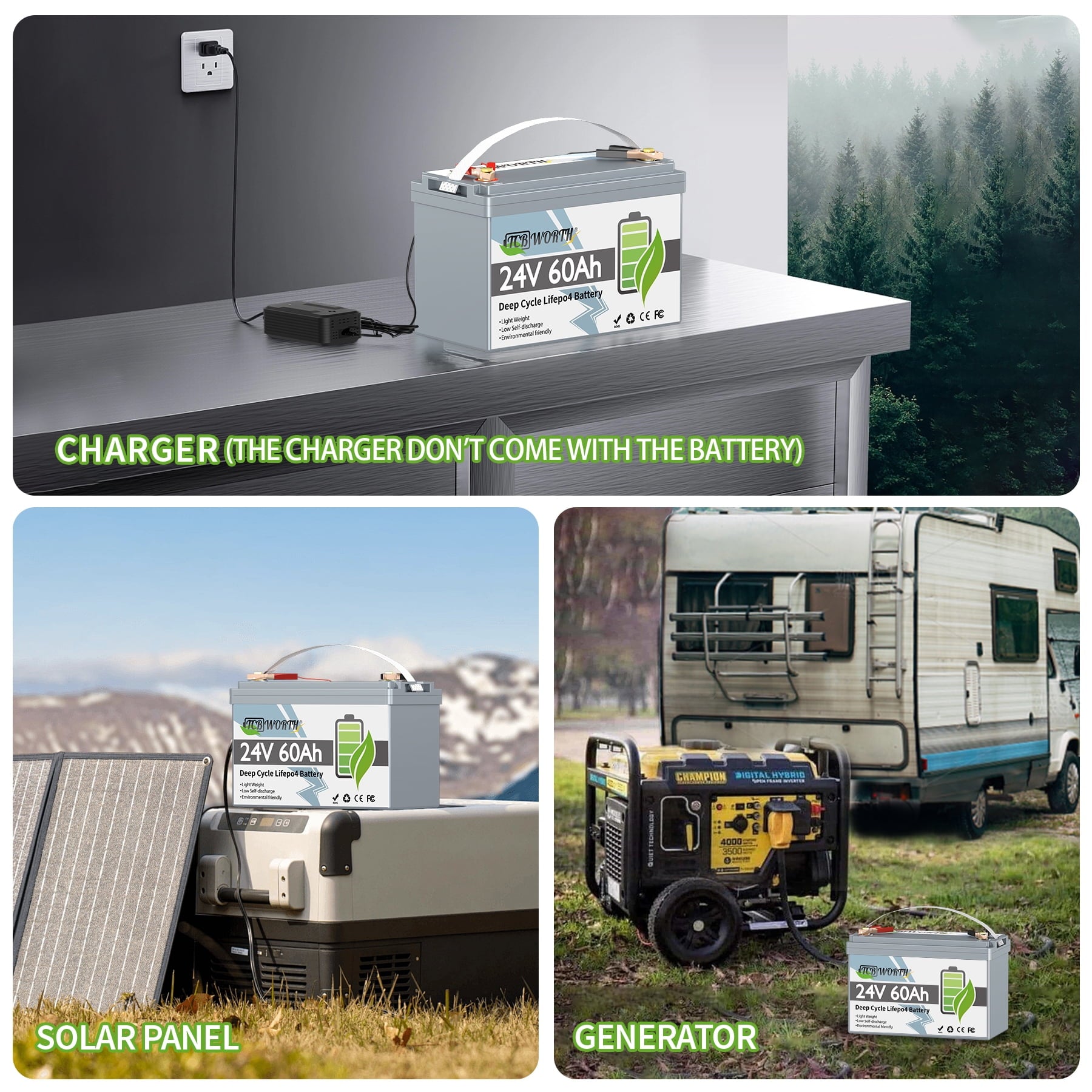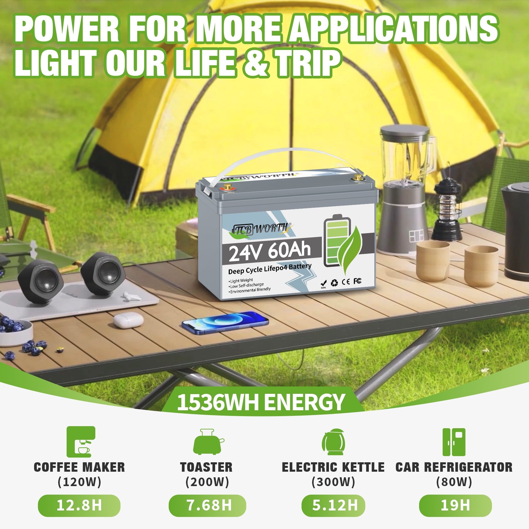 • 【Automotive Grade A LiFePO4 Battery Cells】TCBWORTH adopt Automotive Grade A Lithium iron phosphate battery Cells with higher energy density, more stable performance & greater power, and insist on providing customer with environmentally friendly green power solution.