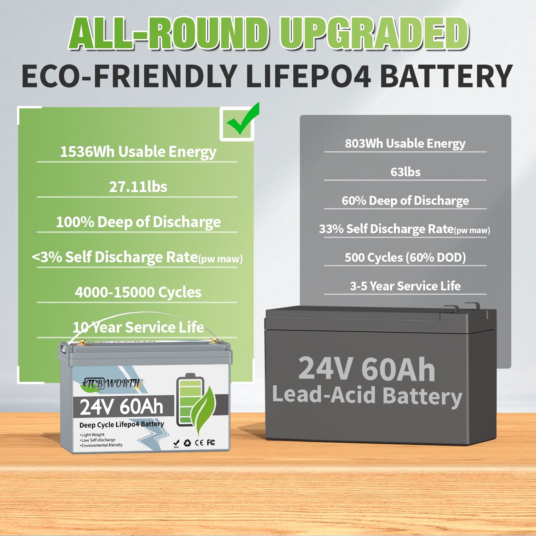 • 【Universal BCI GROUP 31 SIZE】TCBWORTH 24V 60Ah Group 31 lifepo4 battery was built based on the most applicable size of the BCI battery size standard “Group 31”, allowing it to function effectively in a variety of applications. It is globally compatible with the Group 24 battery box.(Please note that this is a storage battery, not a starter battery, and should not be used in golf carts.)