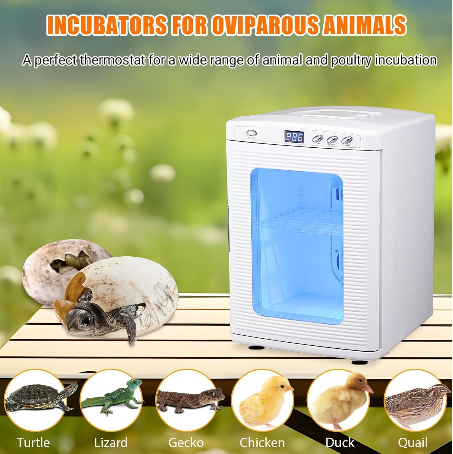 Our incubators can be widely used for hatching reptiles and poultry, such as turtles, lizards, geckos, chickens, ducks, quails and so on. The incubation period for poultry eggs is 20 days.