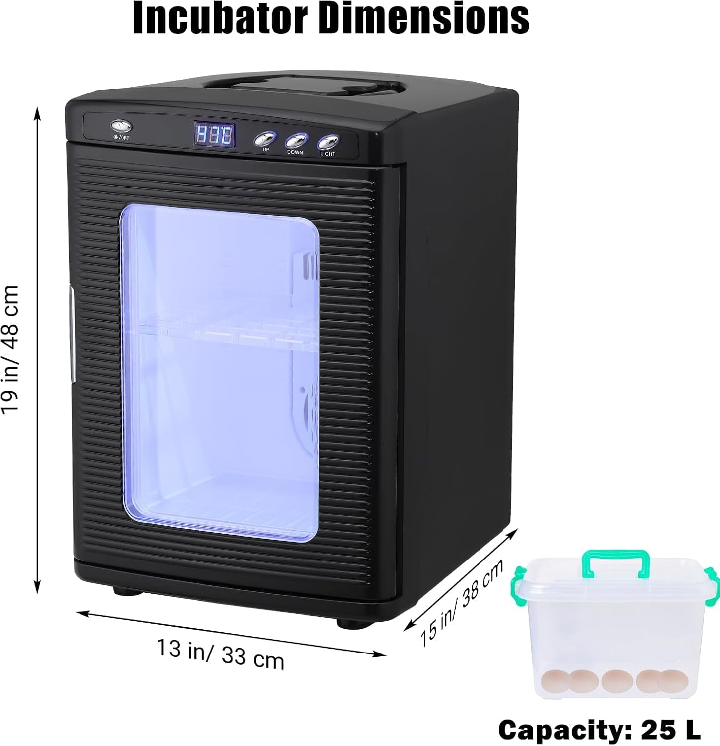 - Portable Designs: This 25 L eggs incubator is compact and has a top carry handle for easy access. The internal shelves can be adjusted in height and width to suit the size of the items to be placed.