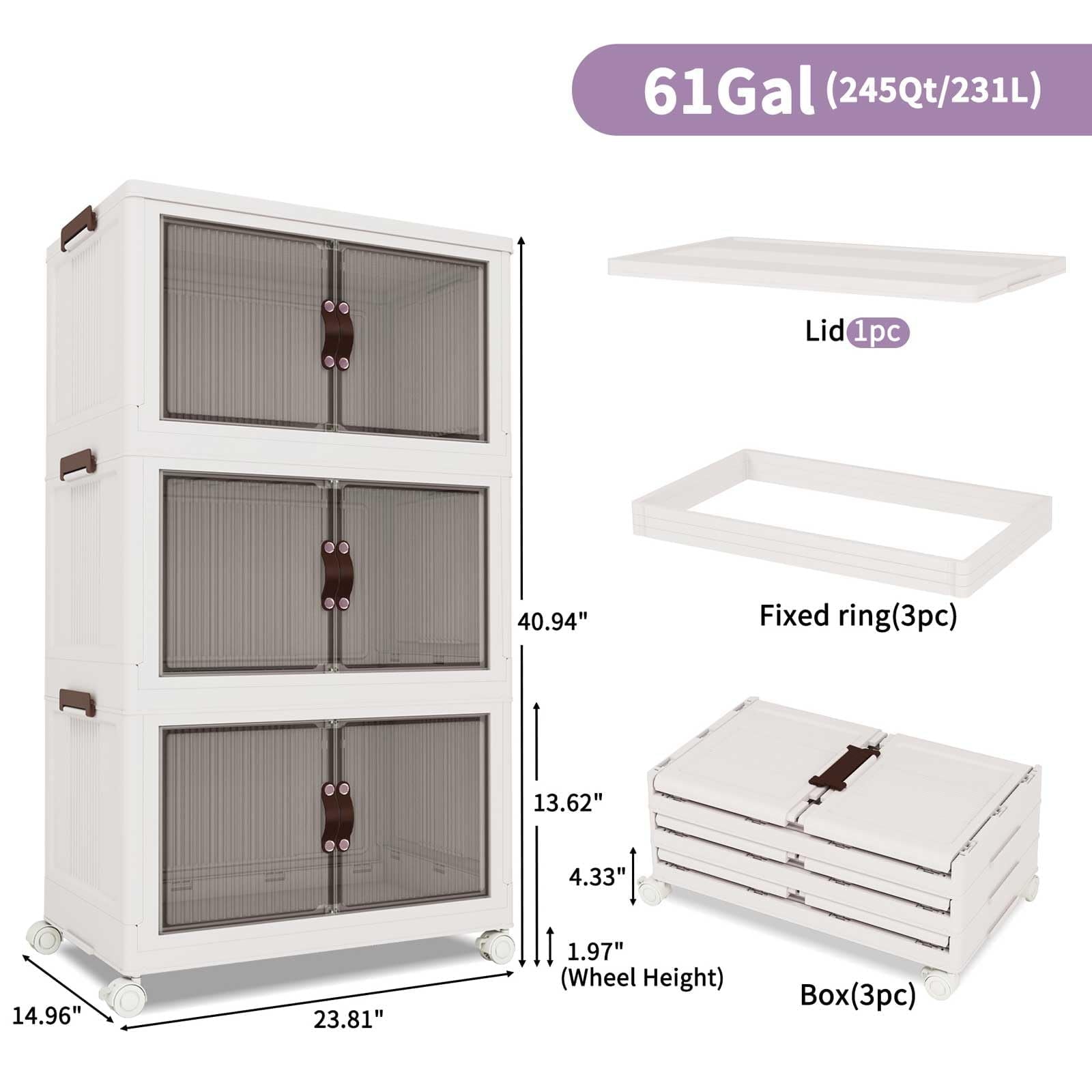 252Qt Storage Bins With Lids-Stackable Plastic Storage Bins on Wheels, Closet Organizers and Storage,Collapsible Storage Cabinet with Doors for Office Garage Kitchen Under Stairs,Larger 3Tier
