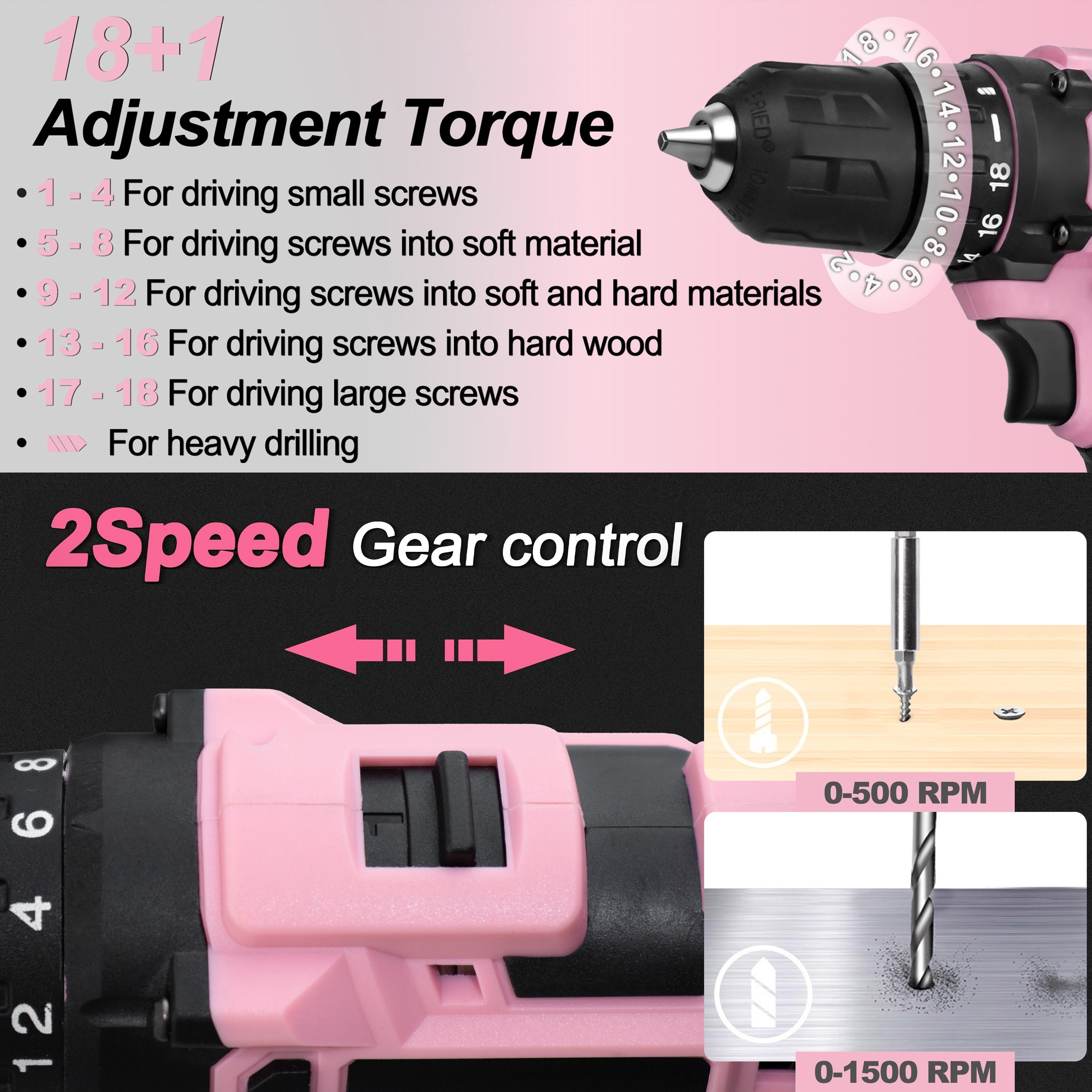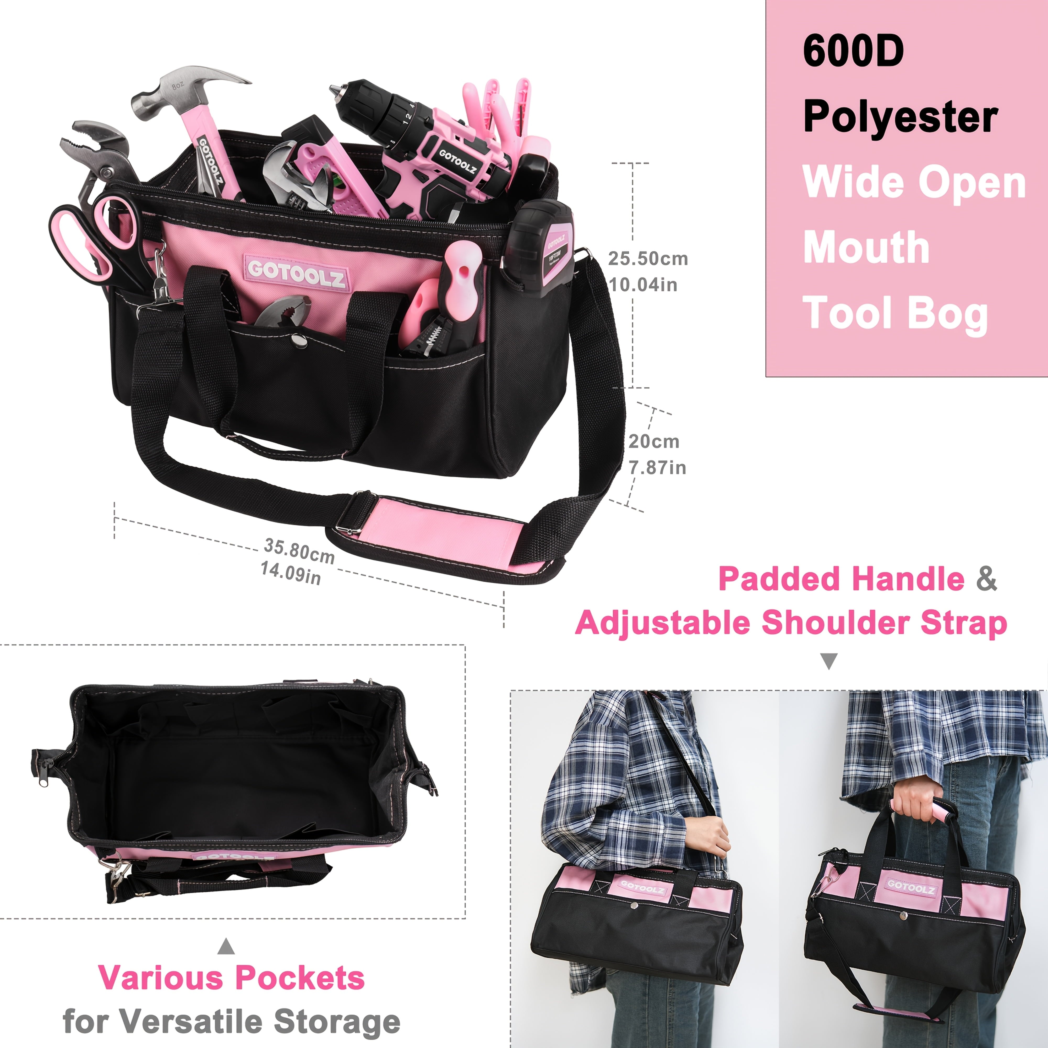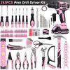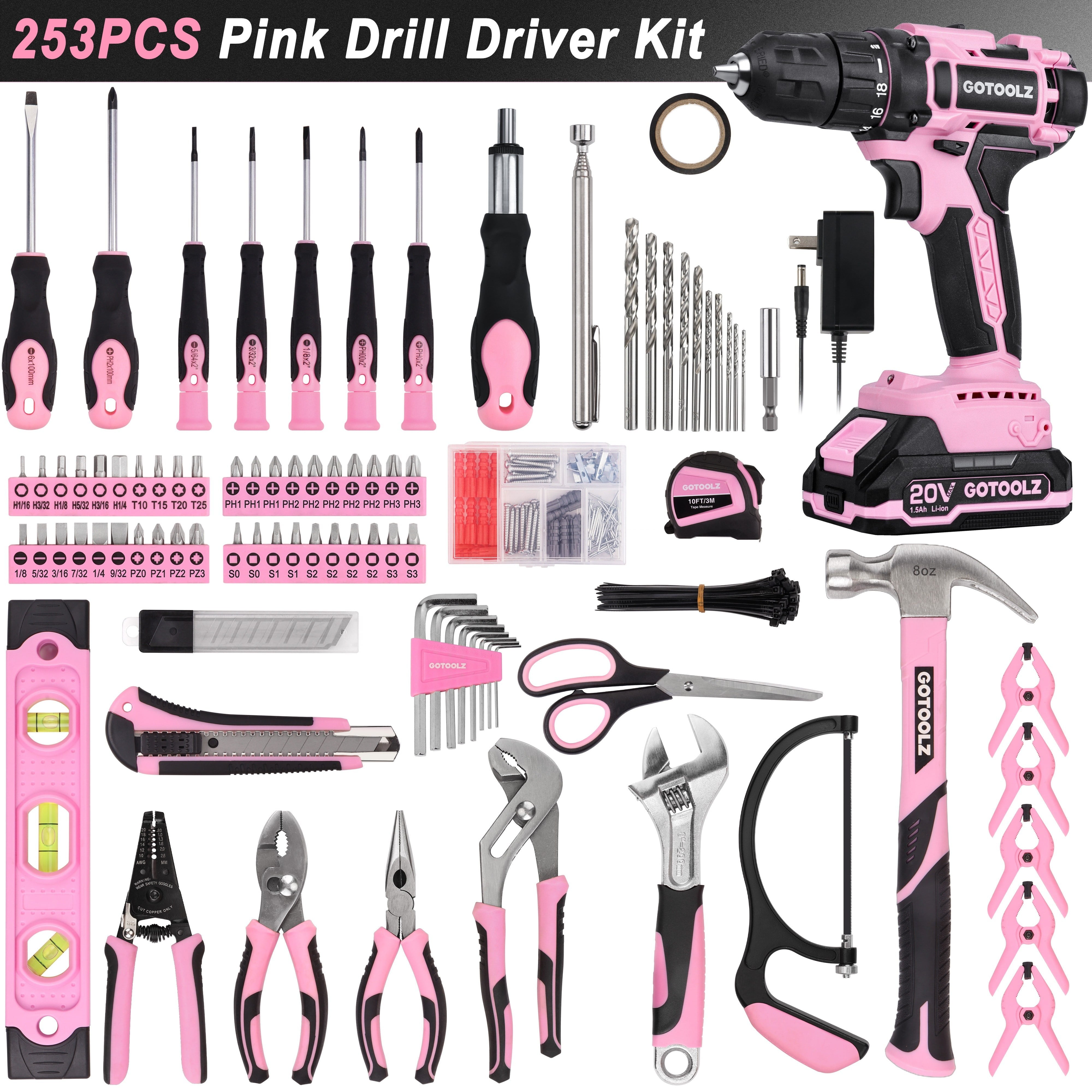 253-Piece 20V Pink Cordless Lithium-ion Drill Driver And Home Tool Set, Lady’s Repairing Kit With 12-Inch Wide Mouth Open Storage Bag