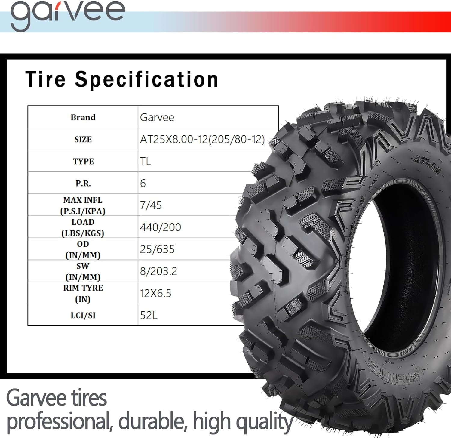 • Tire Size: 25×8-12,Tire QTY: 2