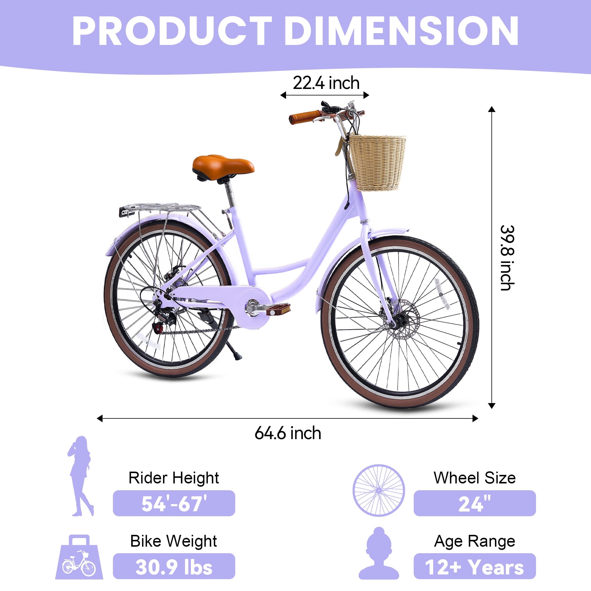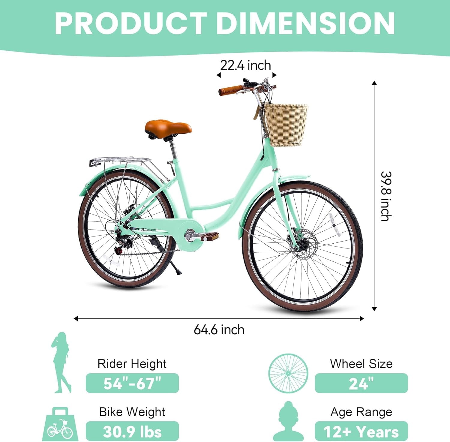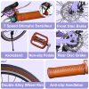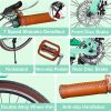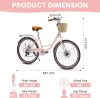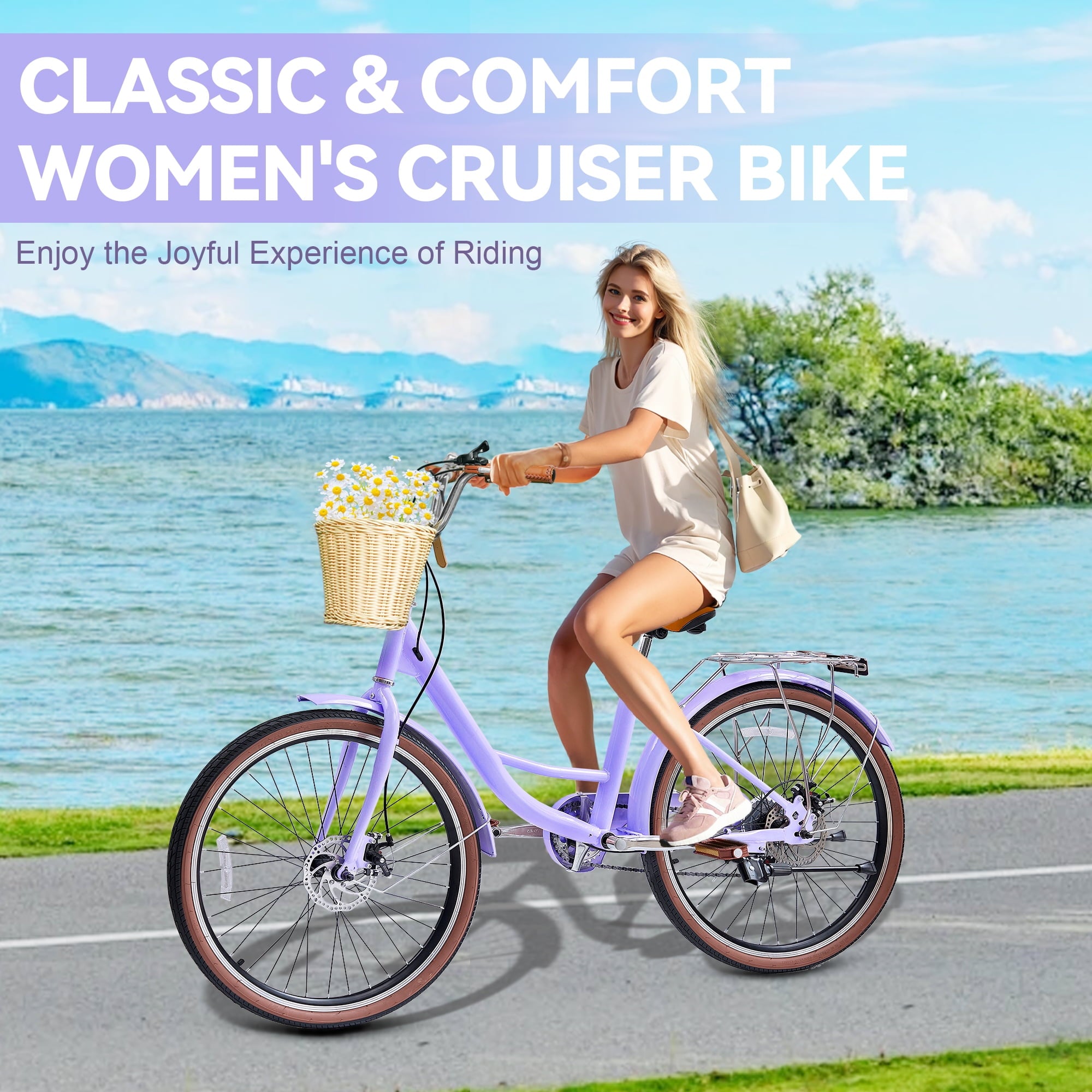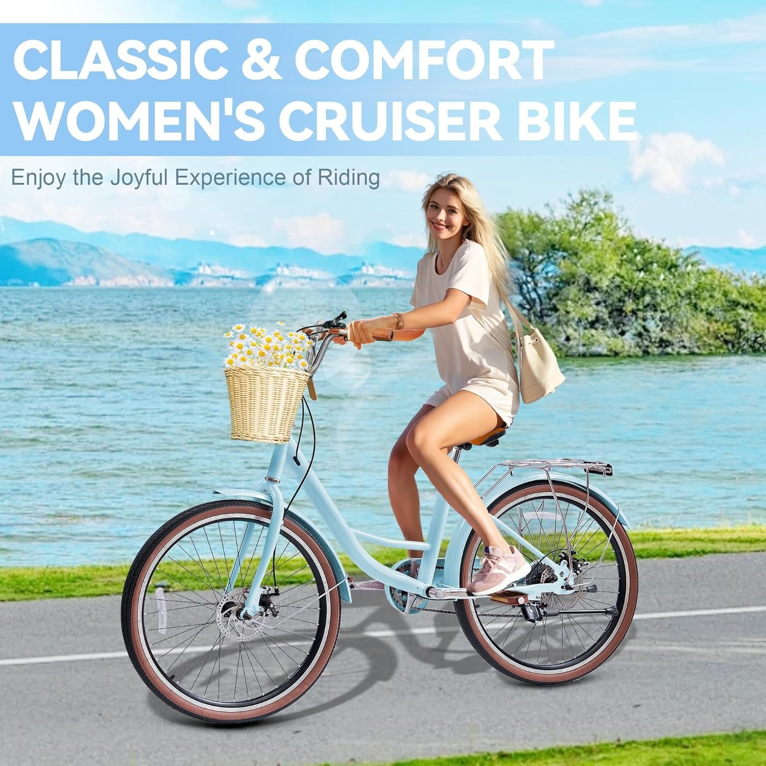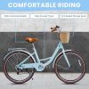 This beach cruisers for women features a step-through frame, removable rattan basket, and 7-speed Shimano system for versatile terrain. Enjoy comfortable upright riding with dual-disc brakes, fenders, and adjustable waterproof seat. 85% pre-assembled – ships in 24″/26″ + 4 colors.