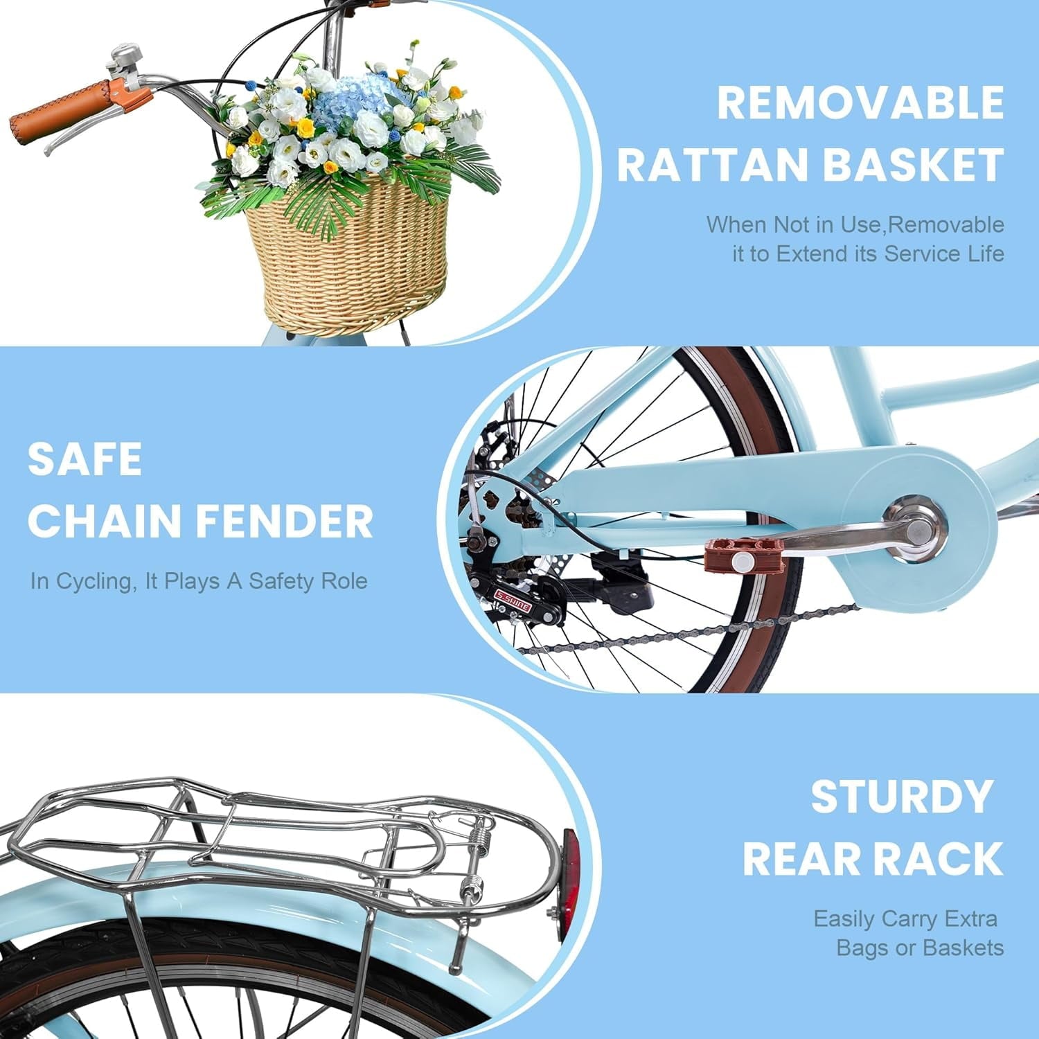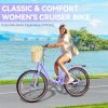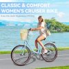 • BEACH CRUISERS FOR WOMEN W/ RATTAN BASKET: Step-through frame + removable rattan basket & rear rack for durable, stylish commuting/beach rides.