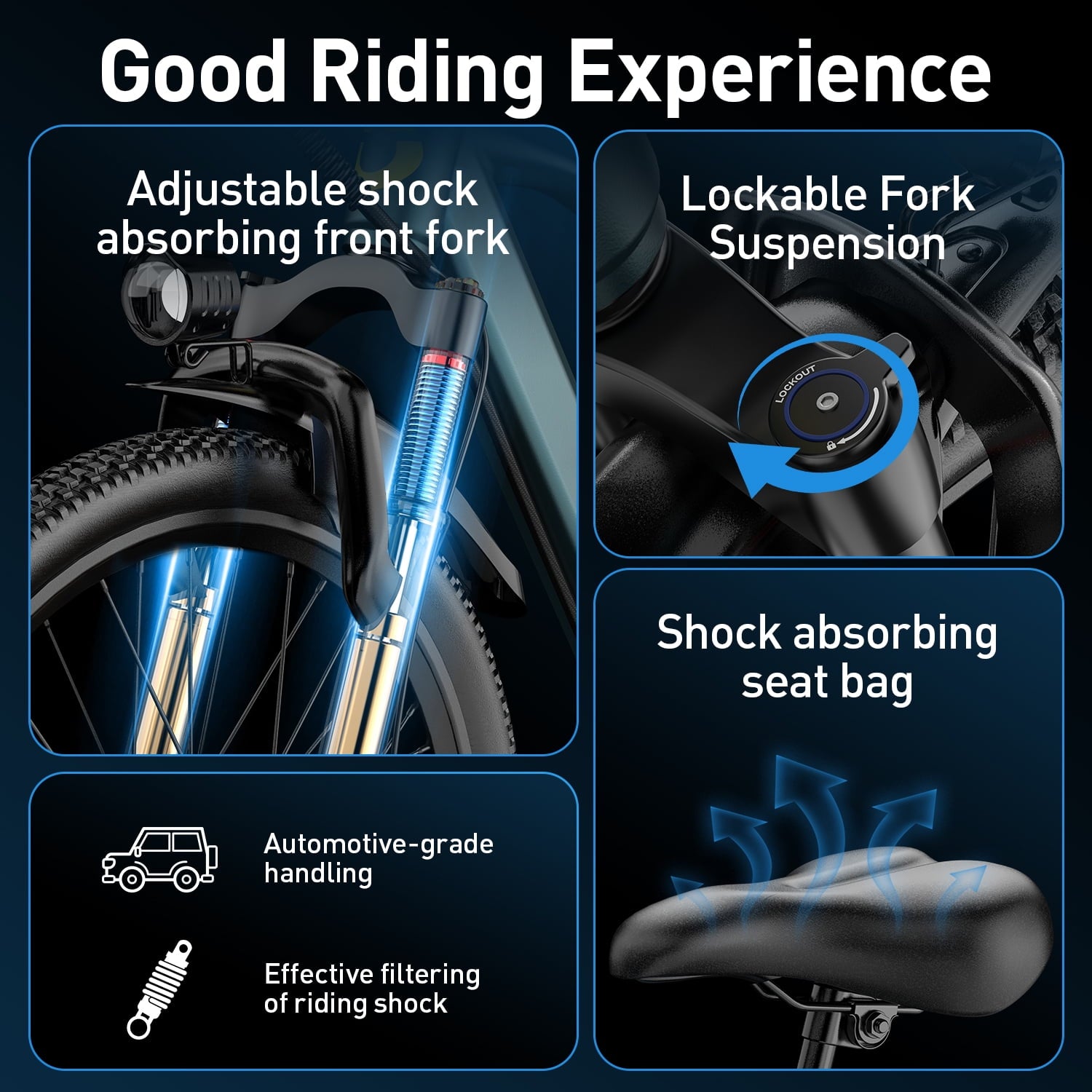 • All-Terrain Ready: Tackle any surface with 26″×1.95″ large tires and a shock-absorbing seat bag. Dual disc brakes ensure safety and precision stopping, rain or shine!