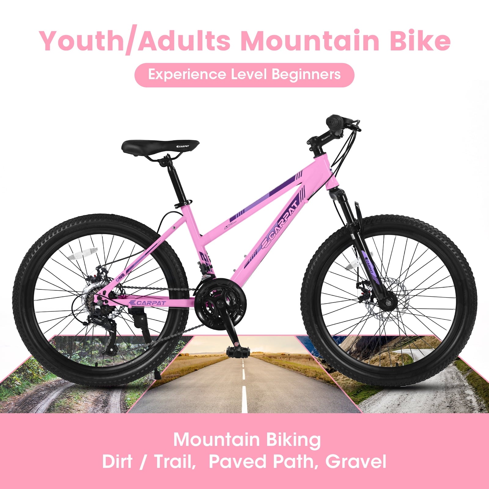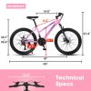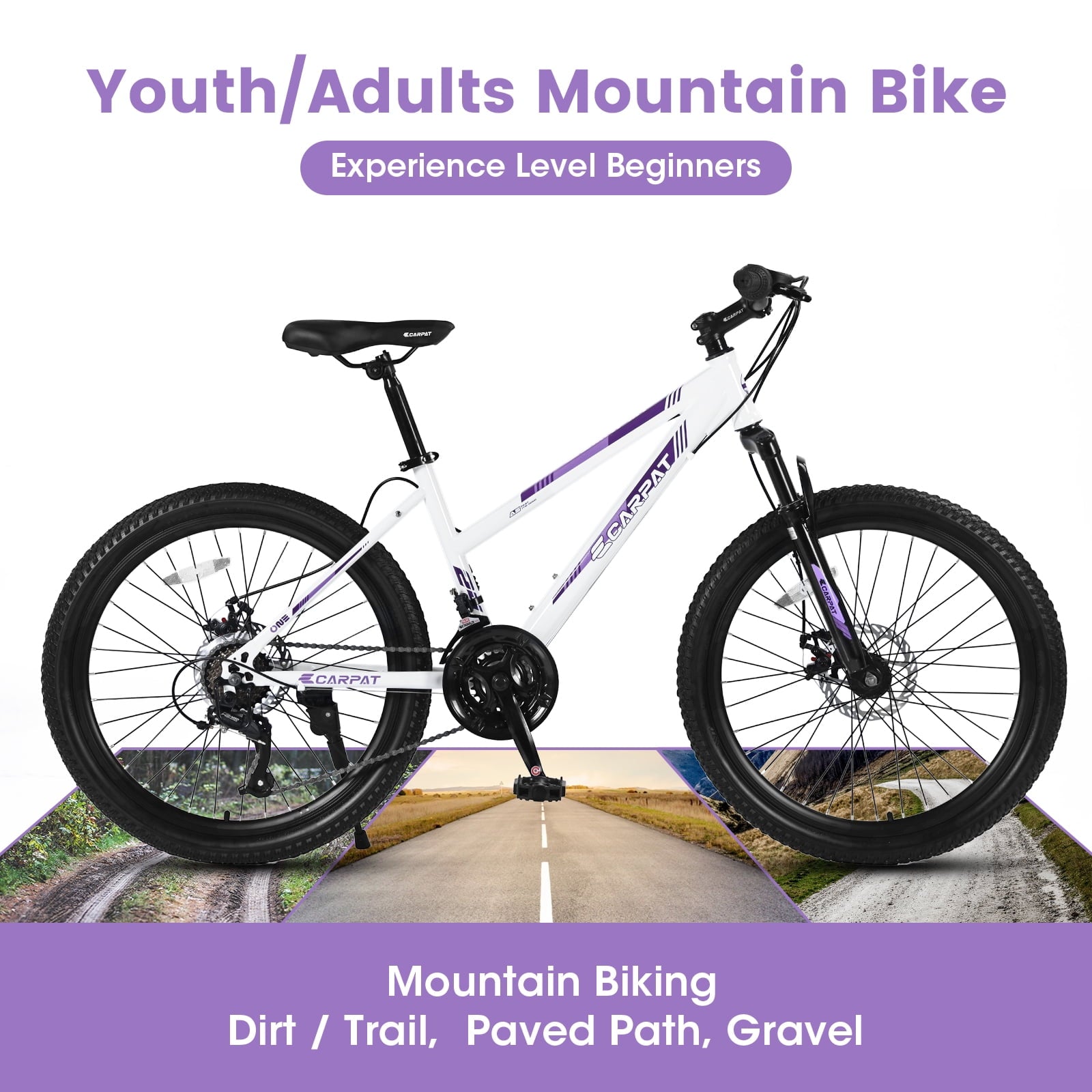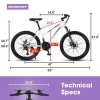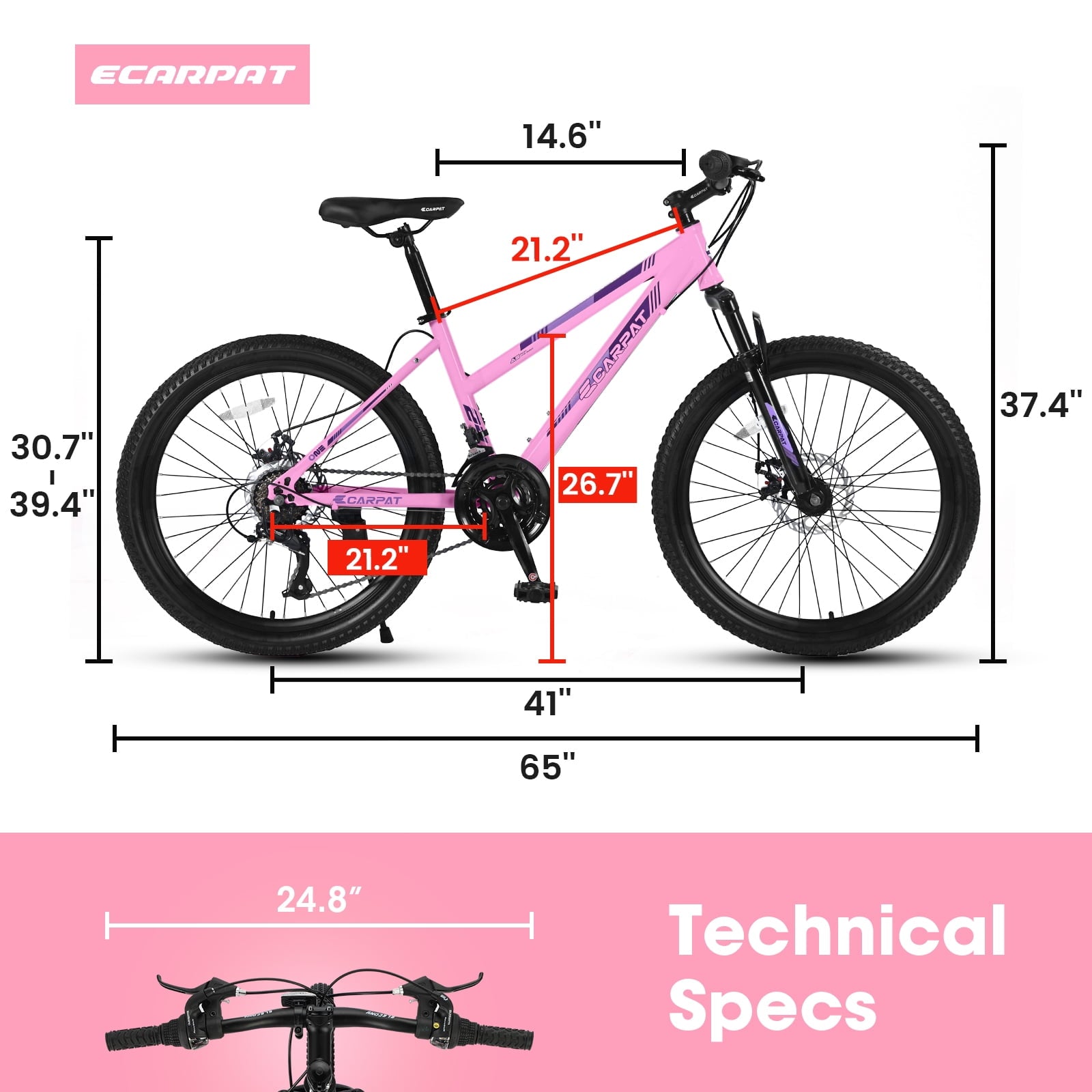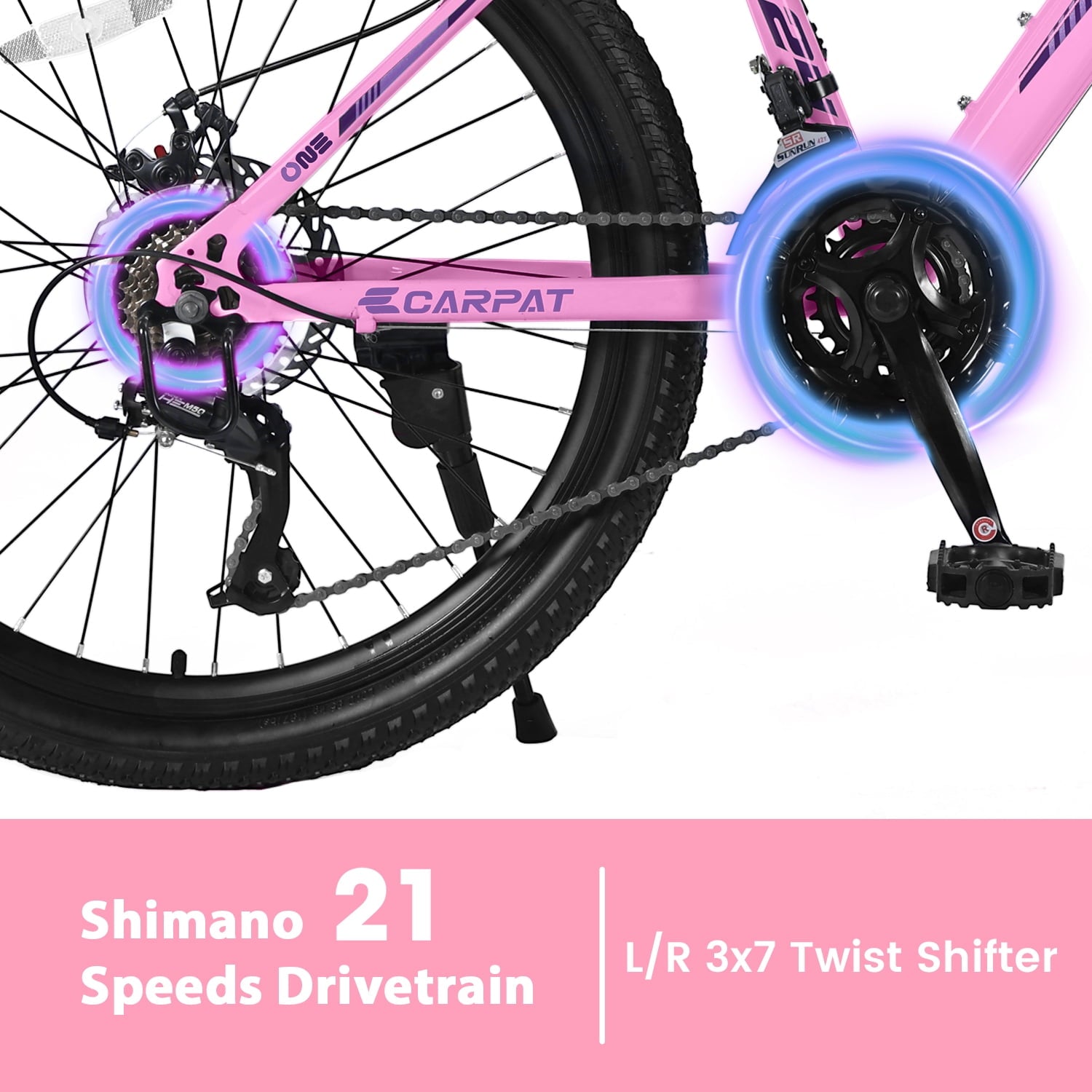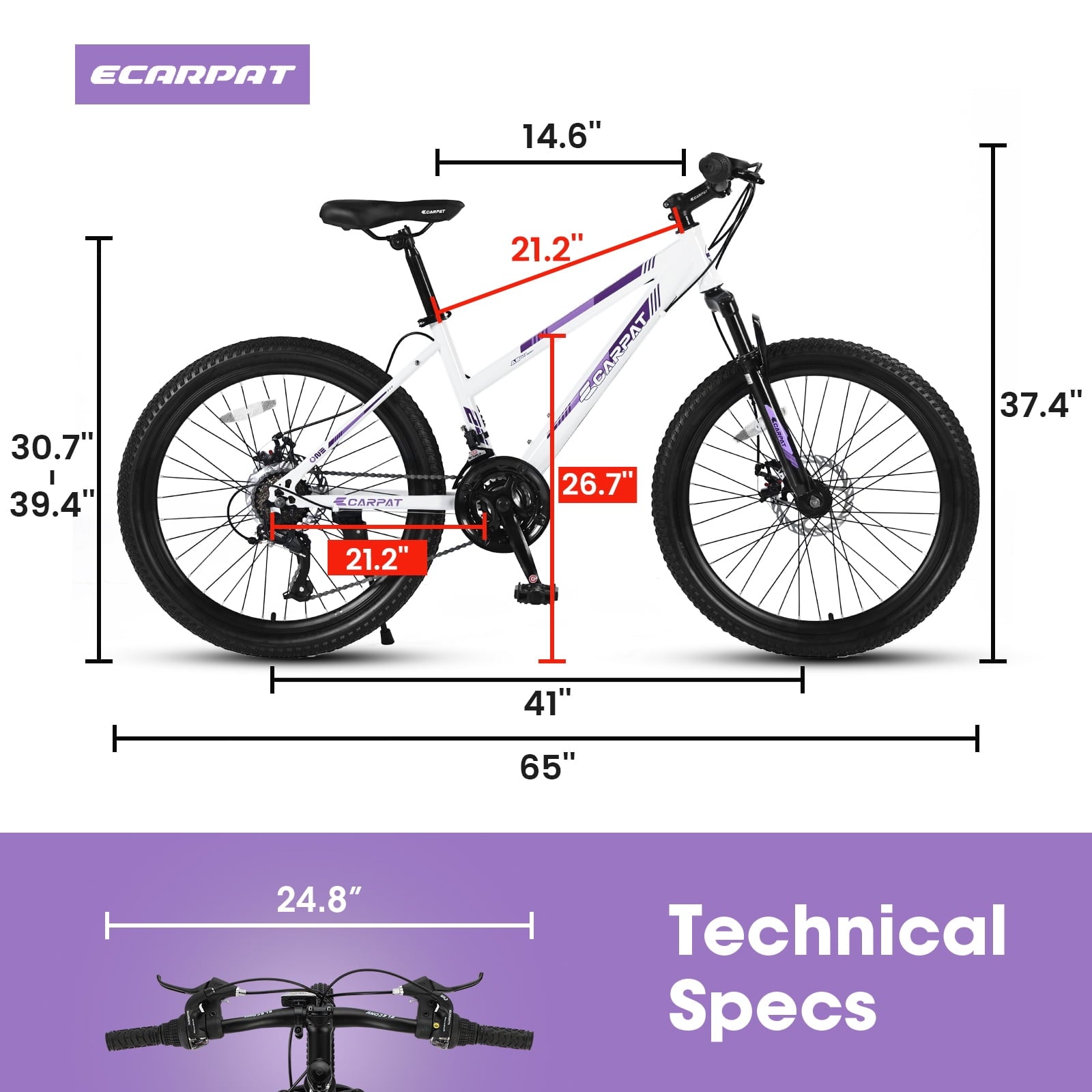 - [21-Speed System for Versatile Riding] Equipped with a 21-speed drivetrain, this mountain bike offers a wide range of gear options to suit different riding scenarios. Whether you’re facing steep inclines on mountain trails, cruising on flat urban streets, or trying to maintain momentum on snowy surfaces, you can easily find the right gear to match your needs.