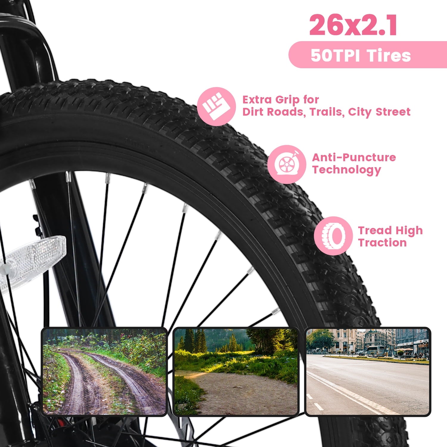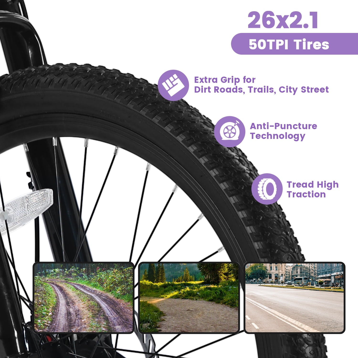 - [All-Terrain Tires for Unmatched Versatility] This bike comes with all-terrain tires that are designed to handle a variety of surfaces. Their aggressive tread pattern offers excellent grip on loose dirt, gravel, sand, and even snow. Whether you’re riding on mountain trails, urban paths, or snowy roads, these tires ensure that you maintain control and stability. They also provide good puncture resistance, reducing the risk of flat tires and allowing you to focus on your ride without worrying about tire issues.