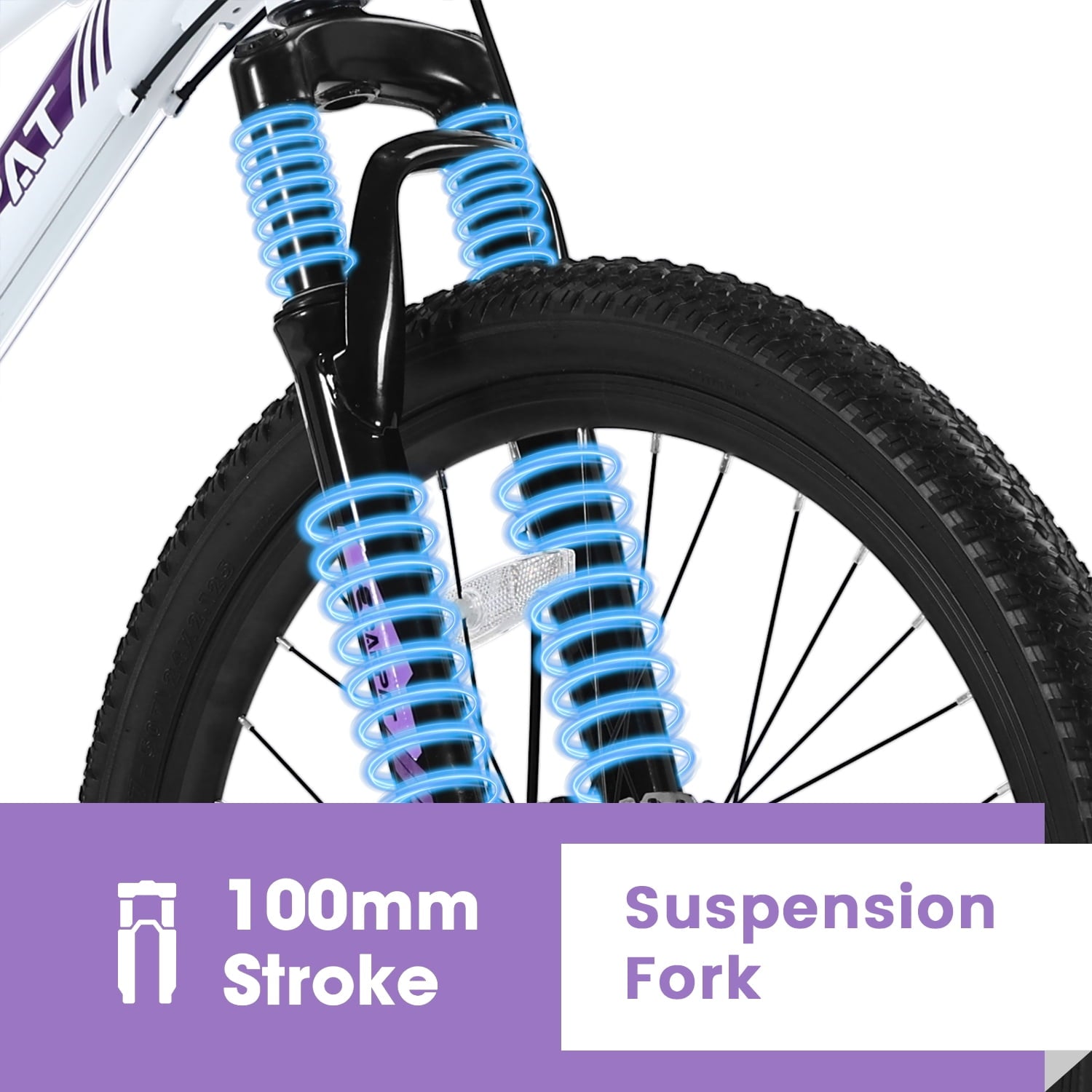 - [100mm Front Suspension] The 100mm front suspension on this mountain bike is a game-changer when it comes to ride comfort. It effectively absorbs shocks and vibrations from uneven surfaces, such as bumps, potholes, and rough trails. This means less jarring and fatigue on your body, allowing you to ride for longer distances without discomfort. The front suspension also helps to improve the bike’s handling, by keeping the front wheel in contact with the ground and providing better traction.