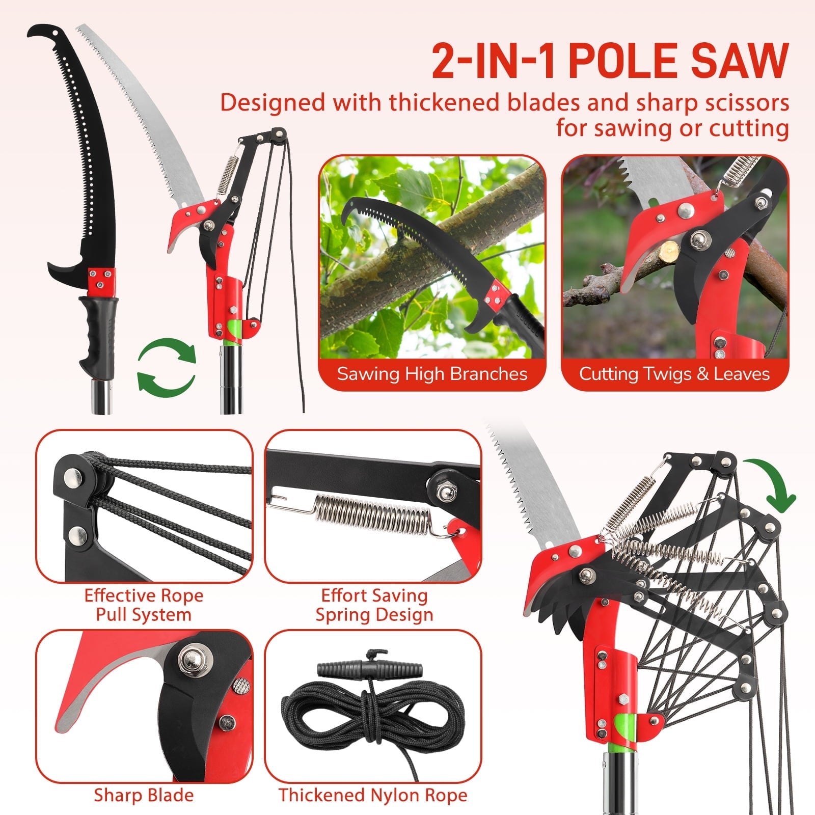 3. Efficient Rope Pull System: The cutting scissors are equipped with a user-friendly rope pull mechanism, making branch pruning more labor-saving than ever. Thickened nylon ropes provide a smooth pull-and-cut action for efficient pruning.