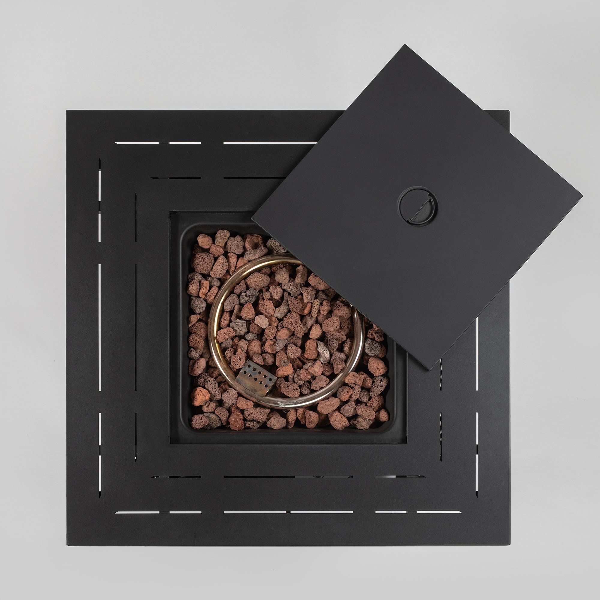 - The fire pit table includes lava rocks and one convenient and protective lid.