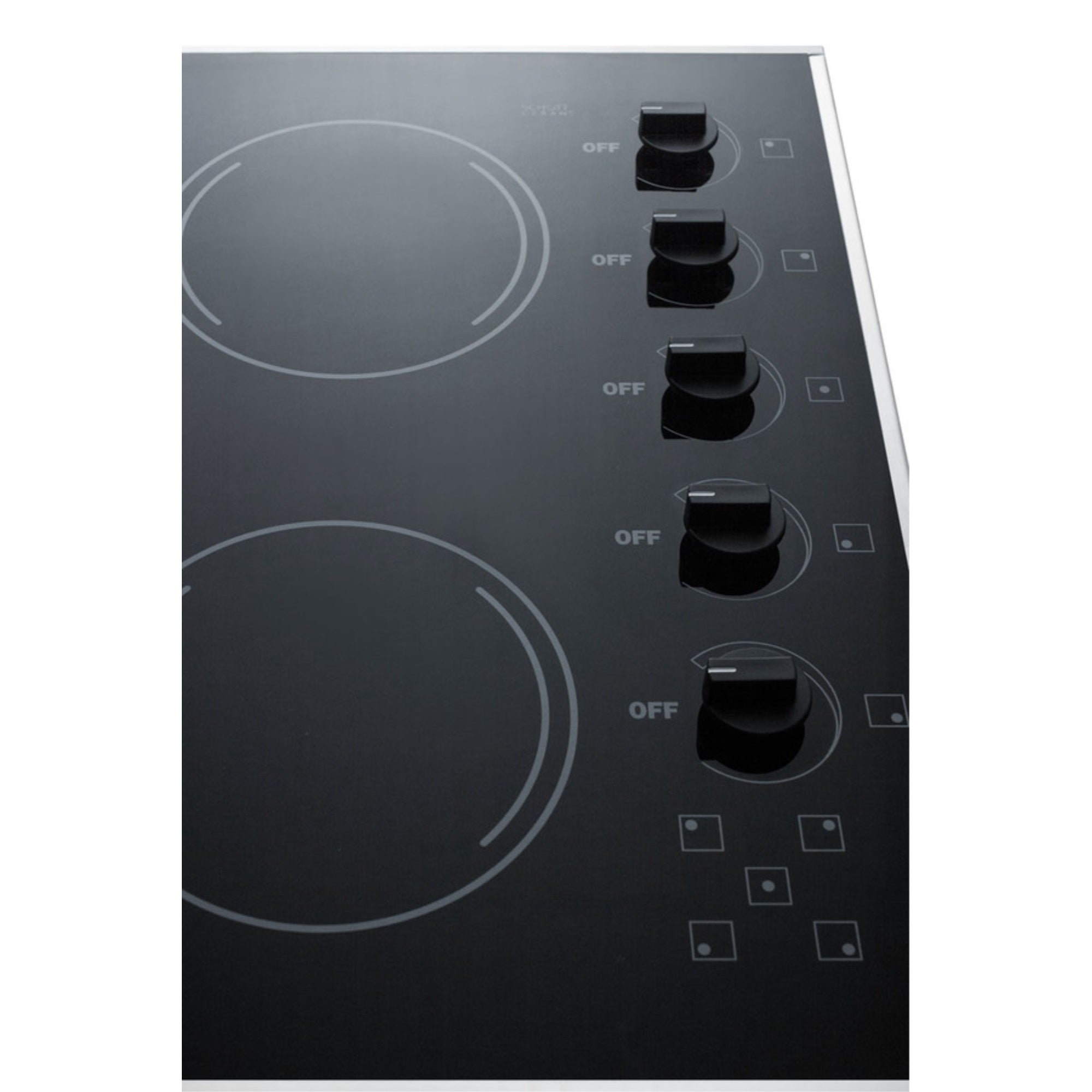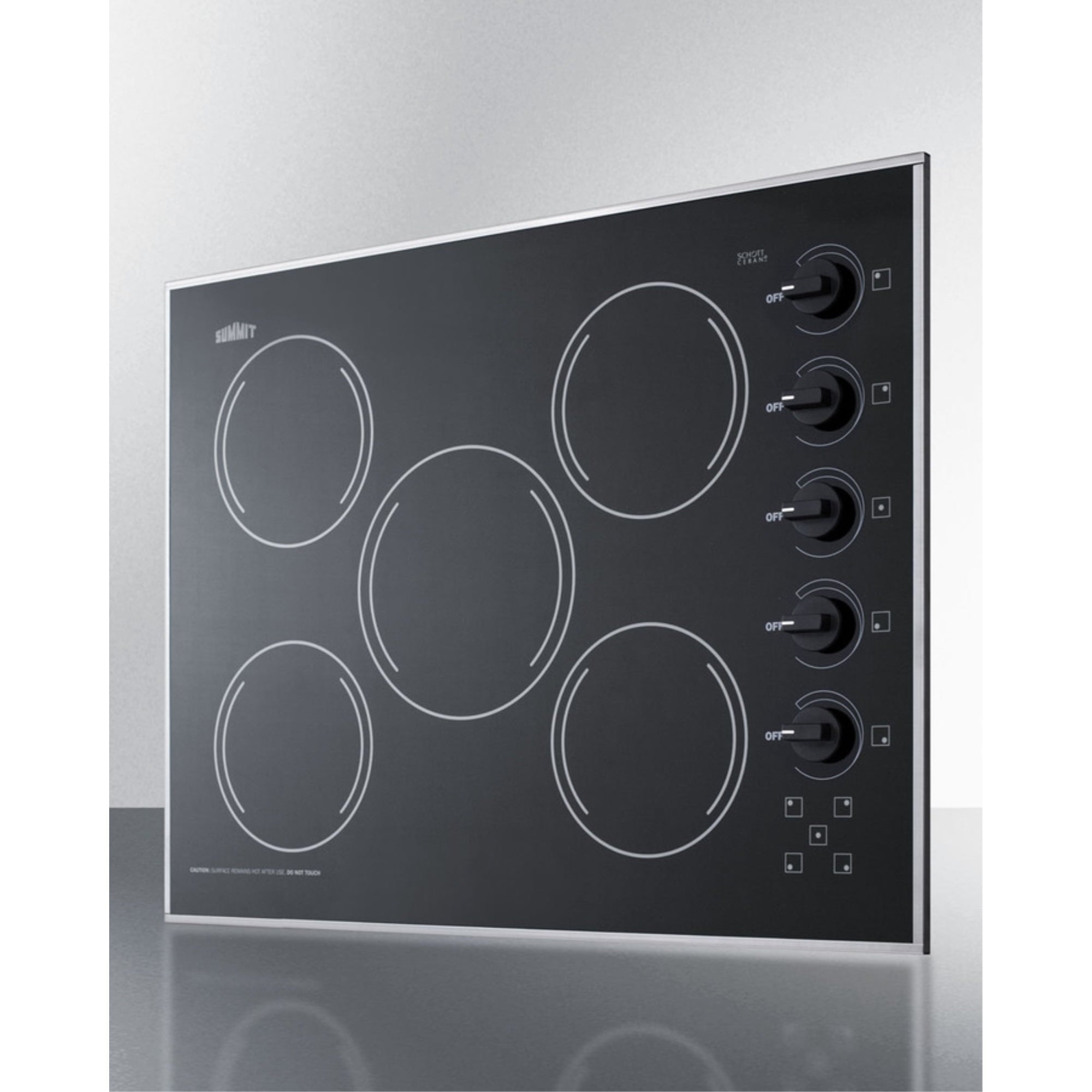SUMMIT introduces a new series of smooth-top electric cooktops sized for unique kitchen counter spaces, all made in the USA with the industry’s best elements.The CR5B273B is a 230V 6600W cooktop, with all burner elements made by E.G.O in Germany. This unit includes one large 8″ 1800W element located in the center to accommodate large cooking vessels. Four standard 1200W 6 1/2″ burners meet most heating needs. Push-to-turn knobs offer added safety, with an attractive matte black finish to complete the look. Each burner includes an indicator light.The smooth surface is made from ceramic Schott glass in a jet black finish, offering easier cleanup than traditional coil elements. The unit is finished with a sleek trim in 304 grade stainless steel for added durability. Sized with an exterior width of 27″ and a conveniently shallow 20 1/2″ depth, the CR5B273B can fit in cutouts 25 1/4″ W x 18 3/4″ deep.Designed and manufactured in the USA, the CR5B273B is the perfect way to finish any small kitchen space. For this unit in a white glass finish, see the CR5B274W.