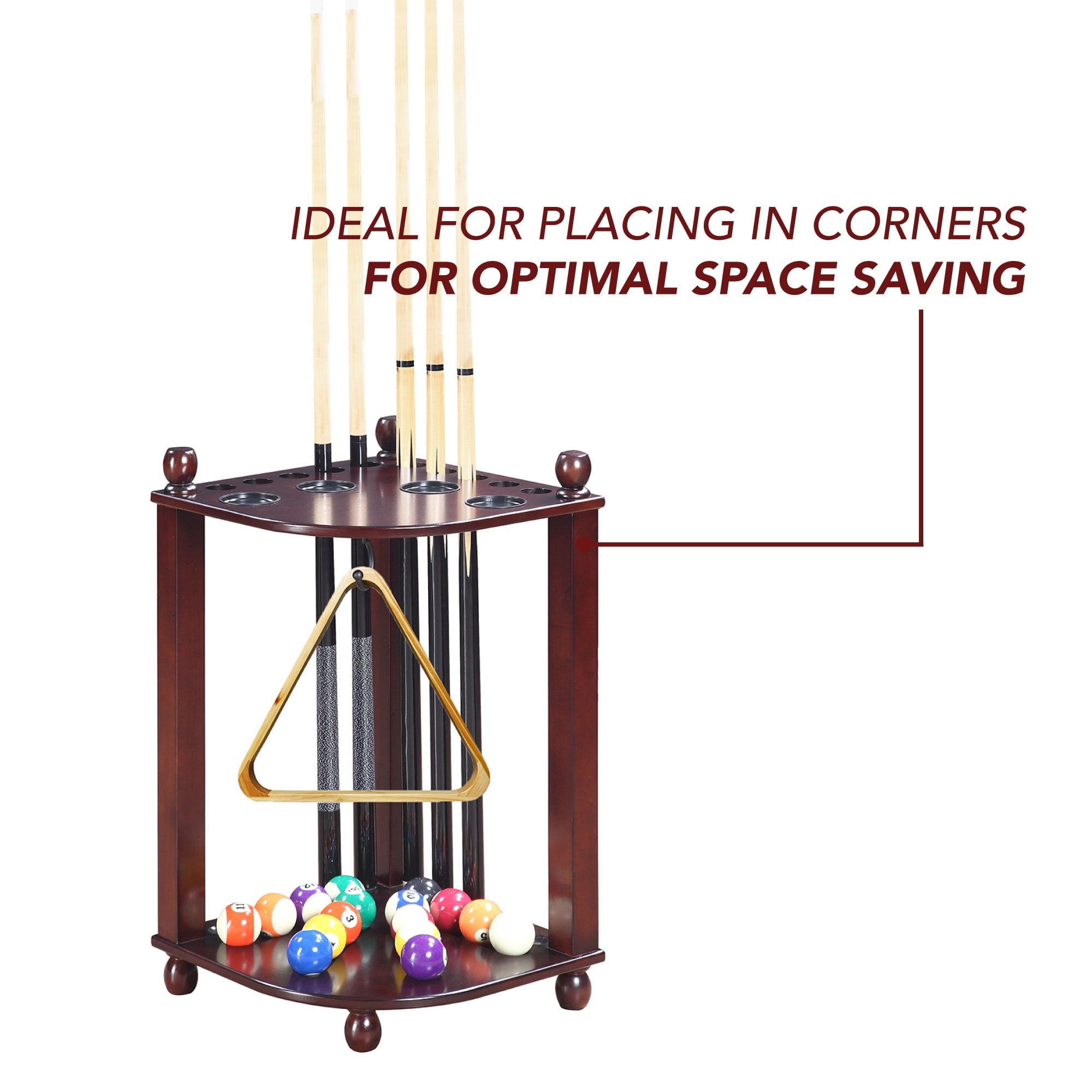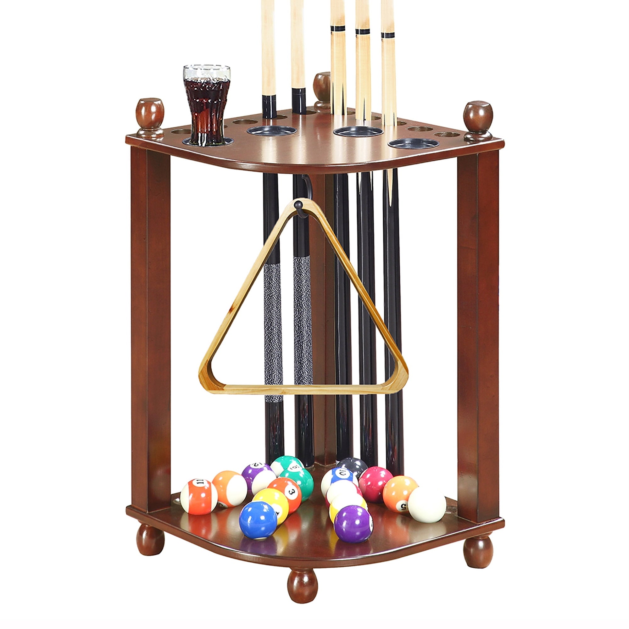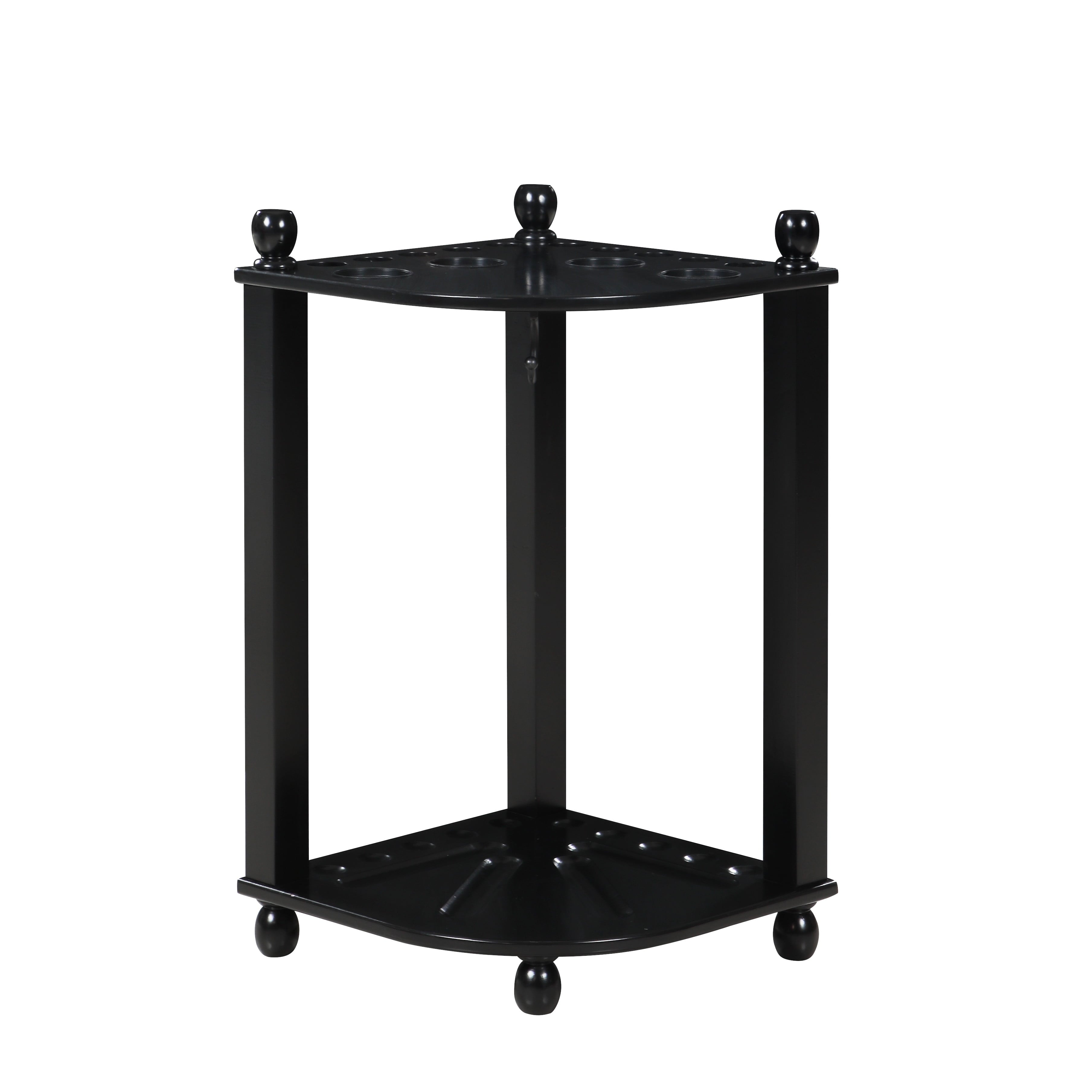 Organize your pool game! Keep all your pool accessories together in one handy storage unit with this Regent Corner Floor Cue Rack. It has dedicated space for up to 10 pool cues, 1 set of pool balls, a ball rack, and a racking triangle. It even features 4 built-in drink holders to keep refreshments on hand throughout your games. This stylish storage system fits right into the corner of your room, and is constructed from solid hardwood with hardwood veneers. A sleek black finish completes the look. This pool cue rack is easy to assemble and fits all your gaming accessories perfectly. With dimensions of 16-in W x 16-in D x 28-in H, this rack provides a complete, compact storage solution. Includes 180-day limited warranty.
