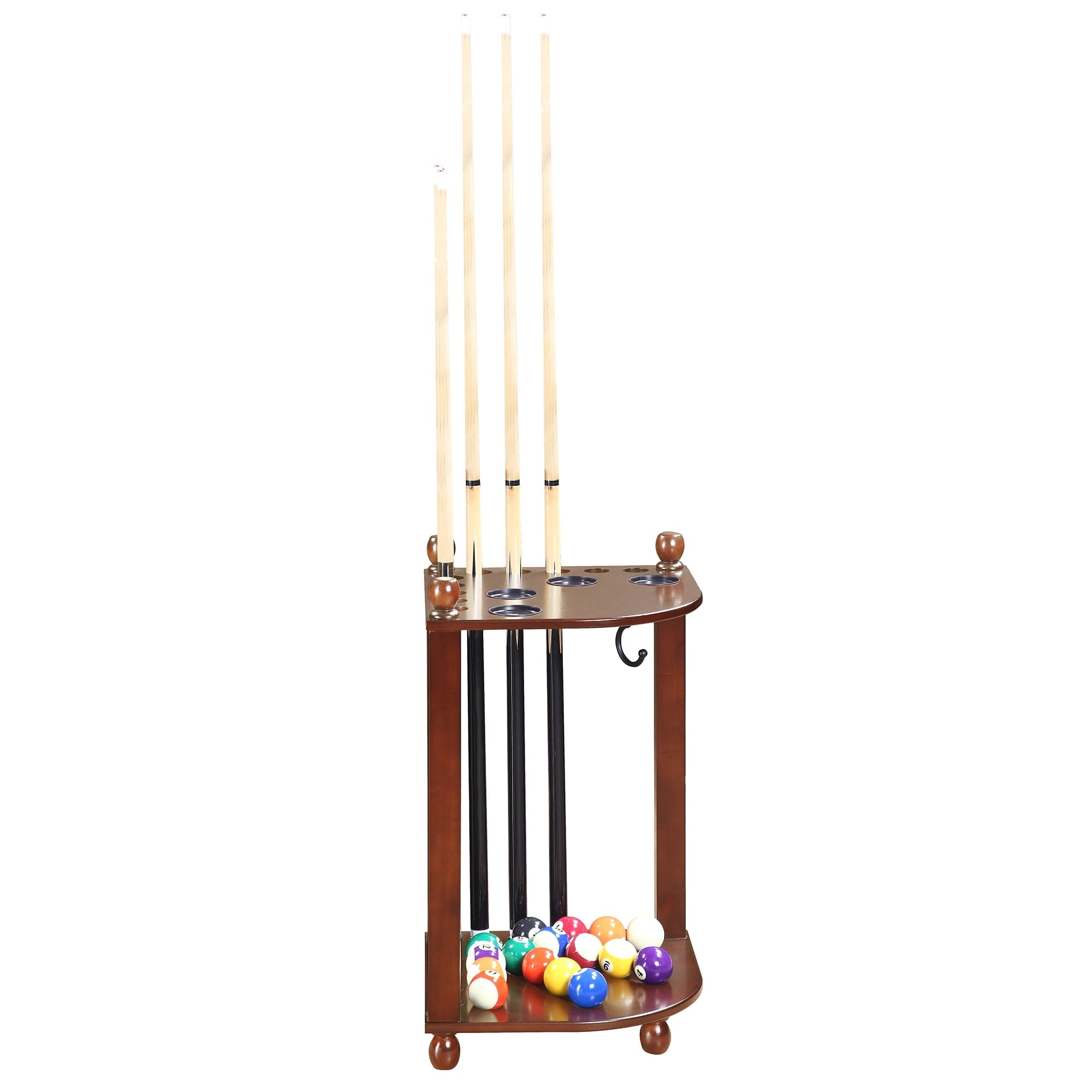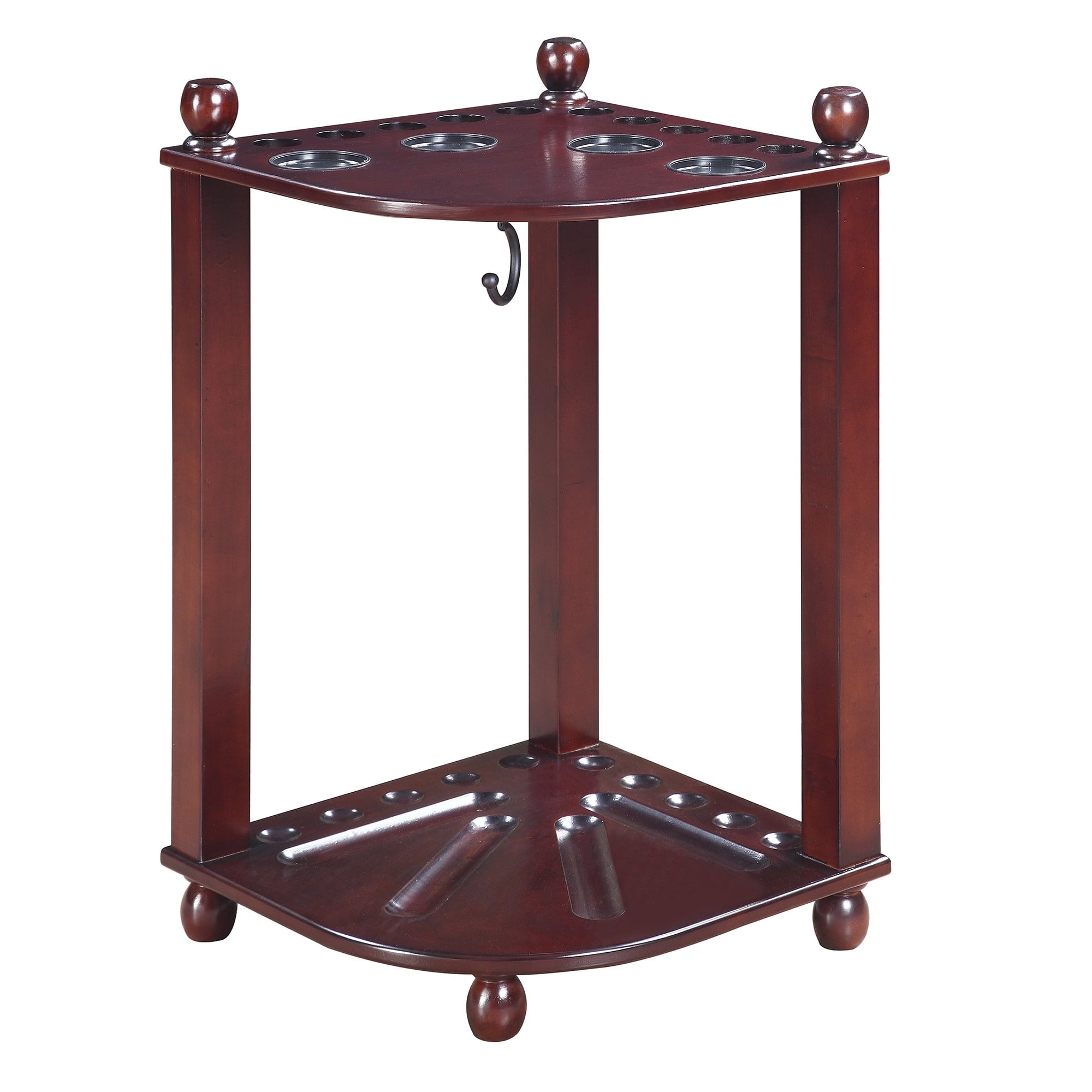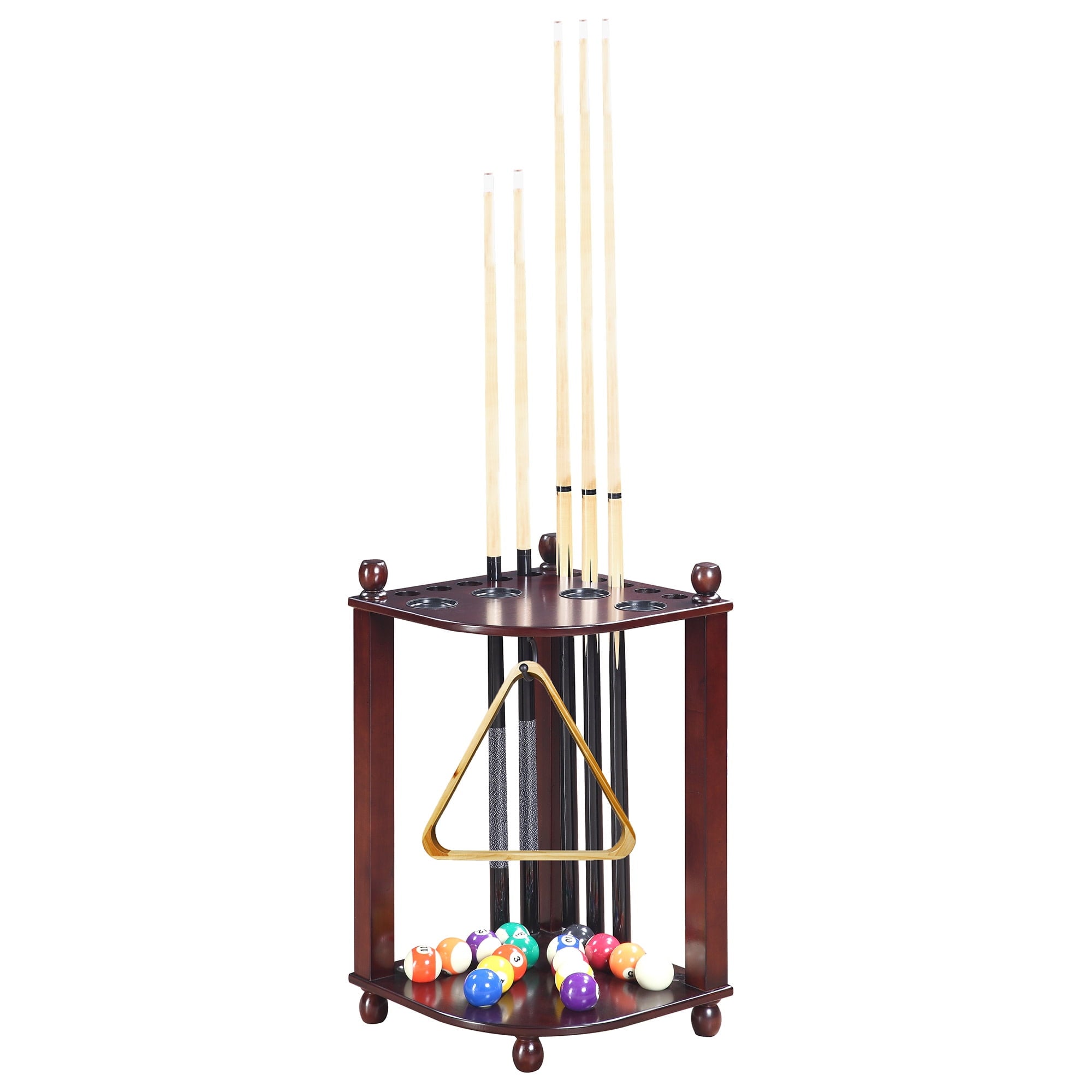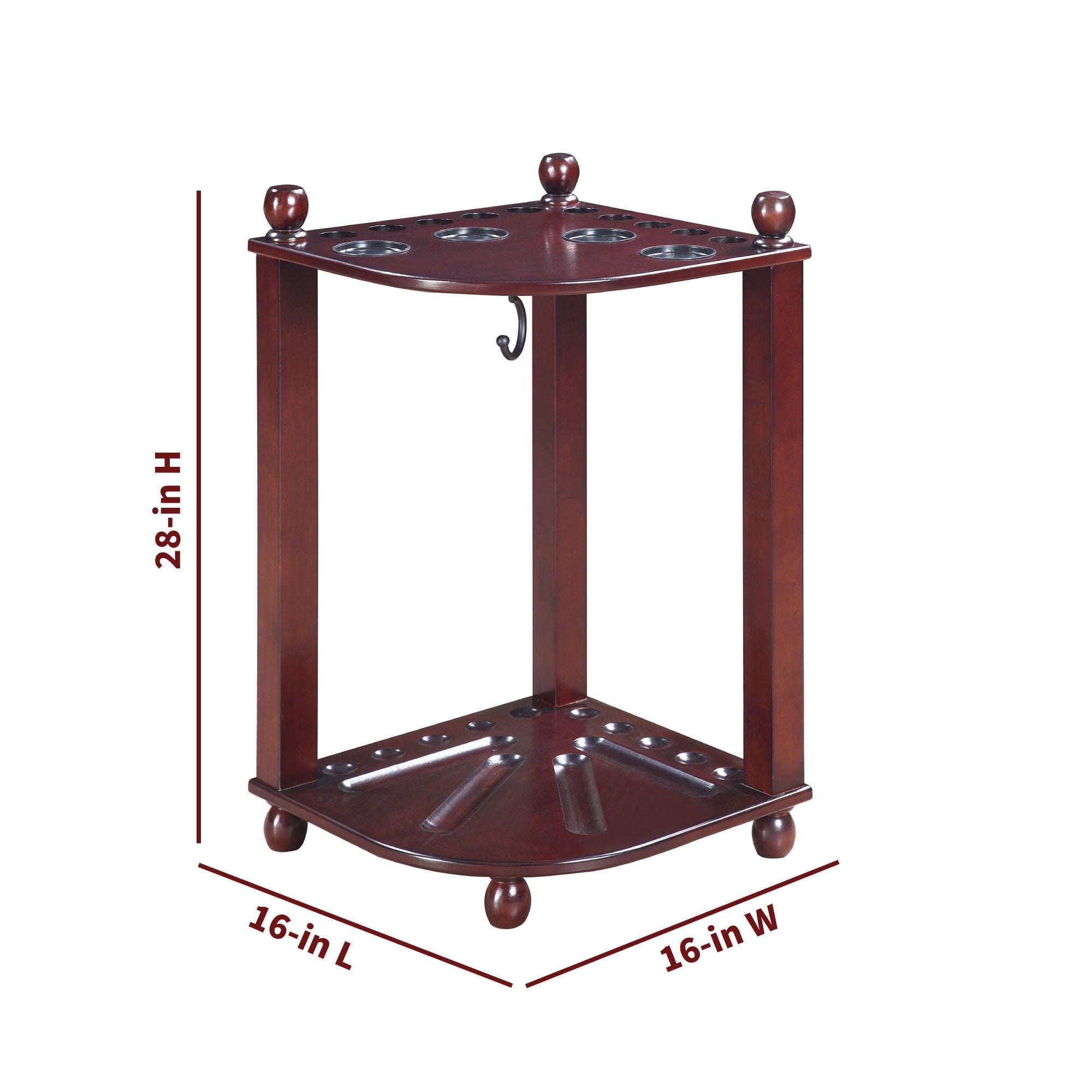 Organize your pool game! Keep all your pool accessories together in one handy storage unit with this Regent Corner Floor Cue Rack. It has dedicated space for up to 10 pool cues, 1 set of pool balls, a ball rack, and a racking triangle. It even features 4 built-in drink holders to keep refreshments on hand throughout your games. This stylish storage system fits right into the corner of your room, and is constructed from solid hardwood with hardwood veneers. A sleek black finish completes the look. This pool cue rack is easy to assemble and fits all your gaming accessories perfectly. With dimensions of 16-in W x 16-in D x 28-in H, this rack provides a complete, compact storage solution. Includes 180-day limited warranty.