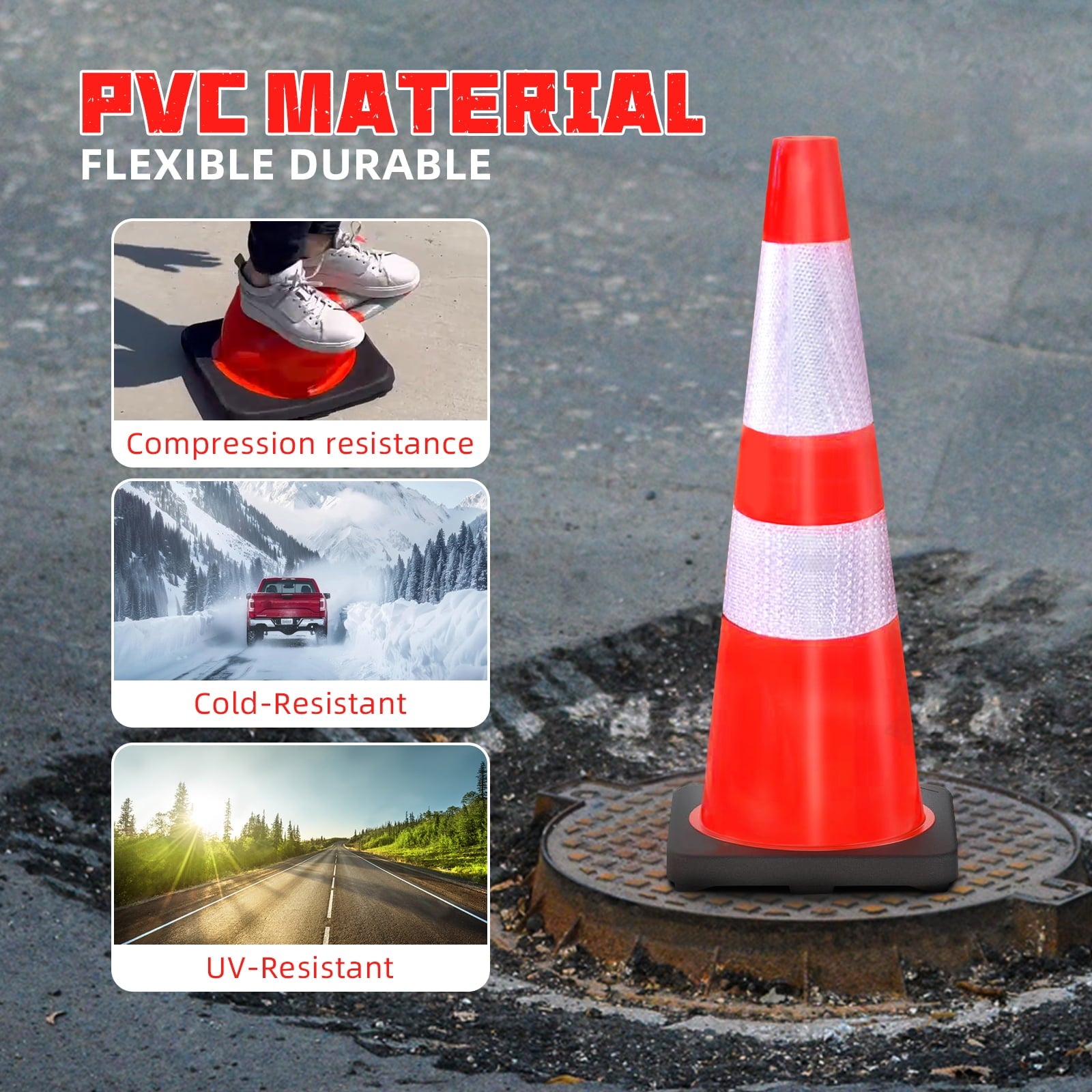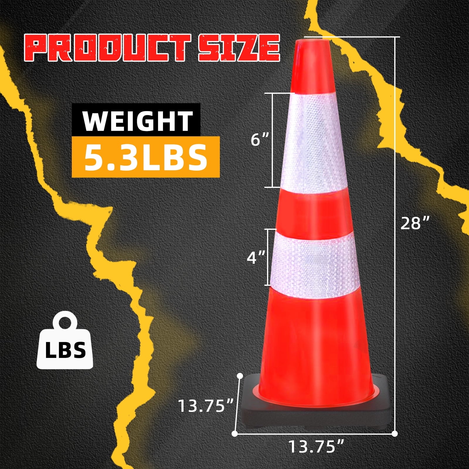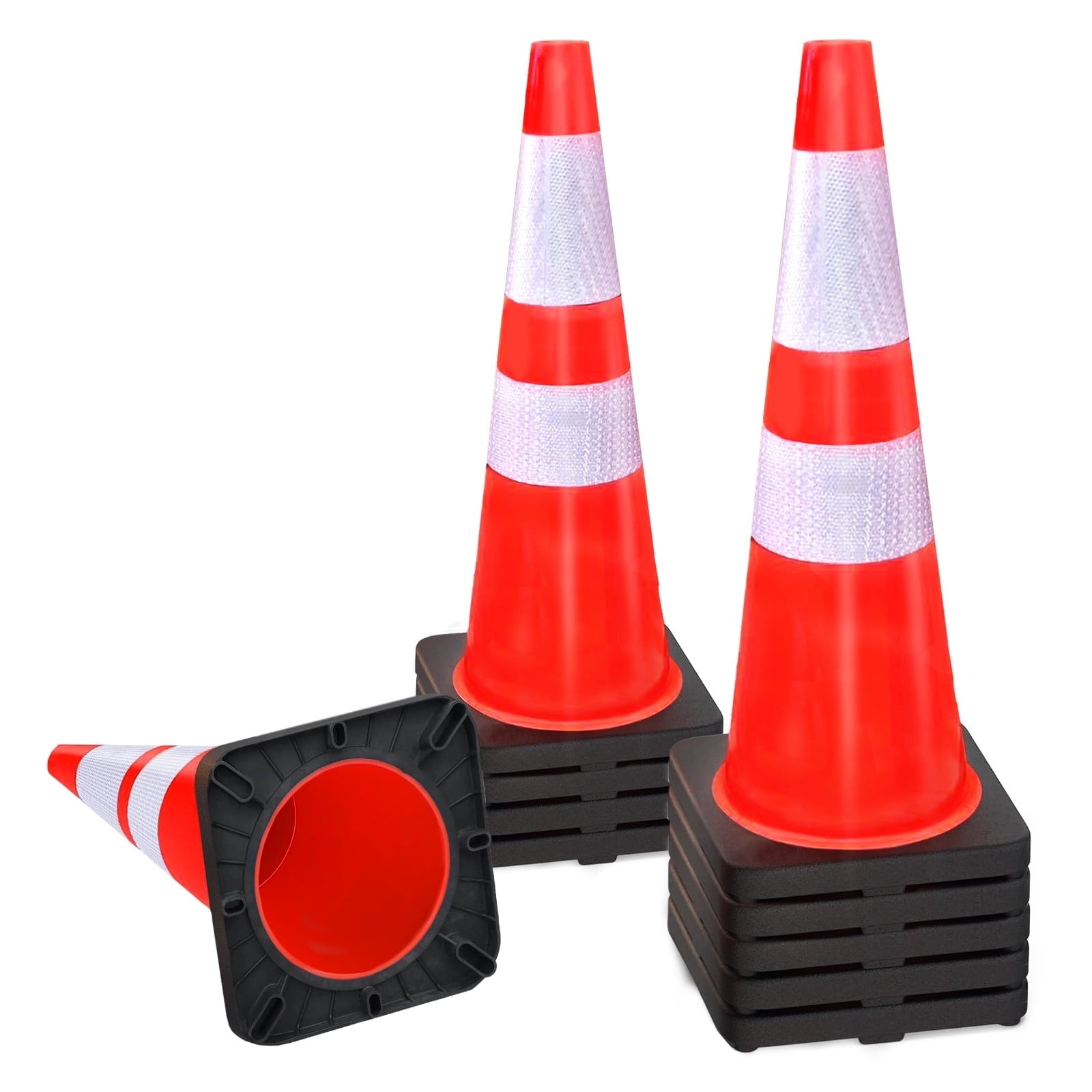 - High-Visibility Cones: High Intensity Reflective Film, Each traffic cone has two high intensive reflective collars( 4″ & 6″ ) ensure 360 degree visibility day and night, even in rain, snow, fog,hail or other bad weather