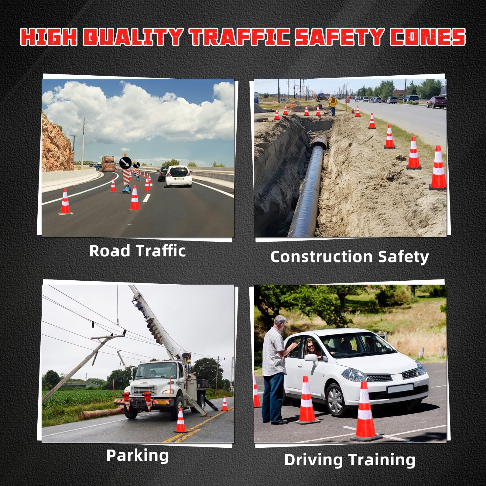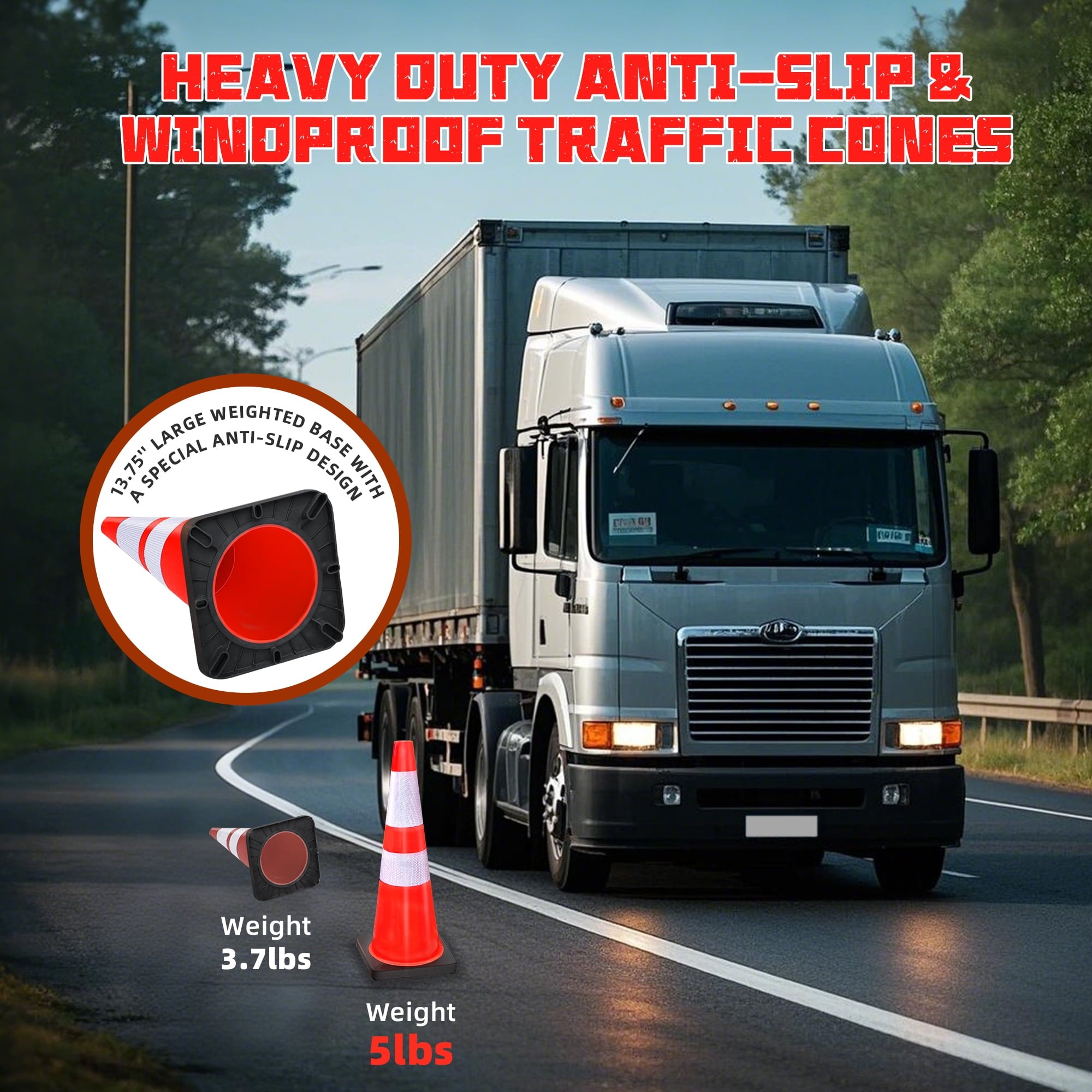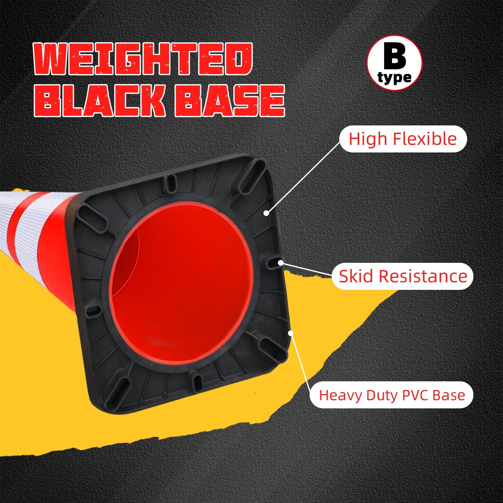 - High-Visibility Cones: High Intensity Reflective Film, Each traffic cone has two high intensive reflective collars( 4″ & 6″ ) ensure 360 degree visibility day and night, even in rain, snow, fog,hail or other bad weather