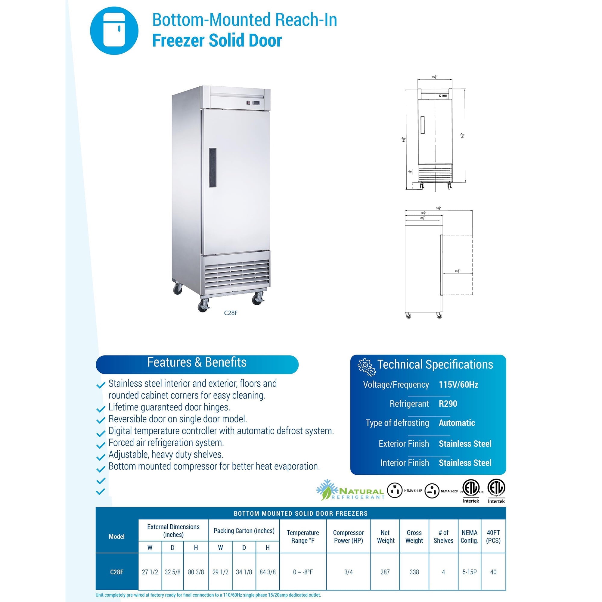 Welcome to Elite Kitchen Supply! Explore the efficiency and reliability of our NSF Solid Door Reach-In Freezer, the C28F, designed for commercial use. This freezer combines durability with optimal freezing performance to meet the high standards set by the National Sanitation Foundation (NSF). Elevate your kitchen with Elite, where innovation meets the stringent standards of NSF-certified, commercial-grade freezers, specifically with the durability and freezing efficiency of the C28F model.