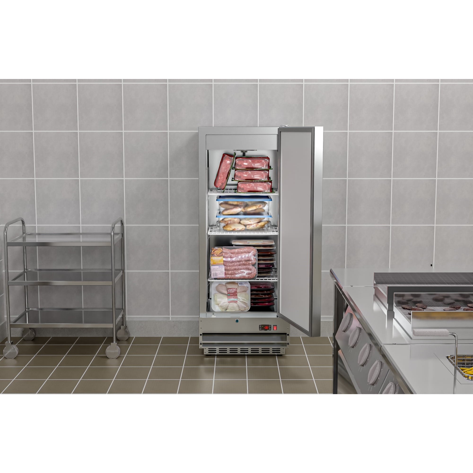 - Reach-in freezer – This beautiful 1-door commercial freezer will keep things kool in your kitchen, hotel or restaurant. This industrial freezer frees (freeze) you up to reach fresh culinary success