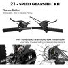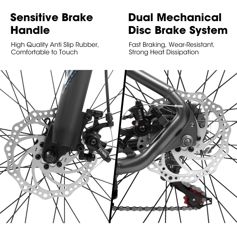 【Brake&Shifter】Front and rear disc brakes ensure timely and effective braking,provide you better durability and stopping power for your rugged and damp adventures.The 21-speed drivetrain with Shimano shifters and Trigger Shifter allows you to find the most comfortable and efficient gear for the kind of road.