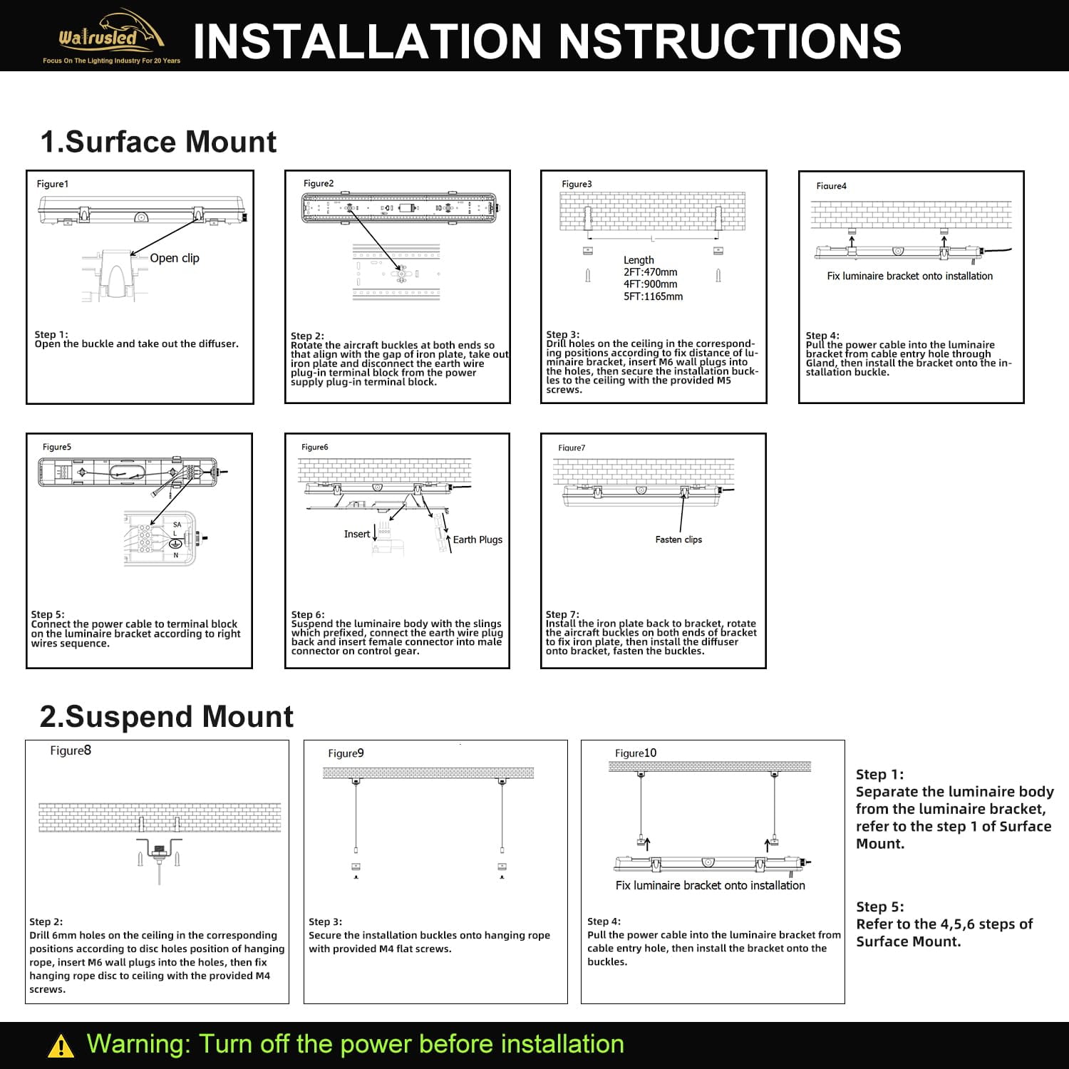 - 💡 【Up To 75% Energy Saving & Easy Installation】 Walrusled 0.6m led parking lot vapor proof surface mount ceiling batten lights provide 125lm/w high lumen efficiency, saving you up to 75% energy with the latest LED technology, and you can control the brightness and energy consume. Provides more than 54,000 hours of maintenance-free operation. Mounting Bracket and screws included for Wall Surface Mount. There is also one cable gland provided for waterproof cable connection (Cable not included). Suspension mounting supported.