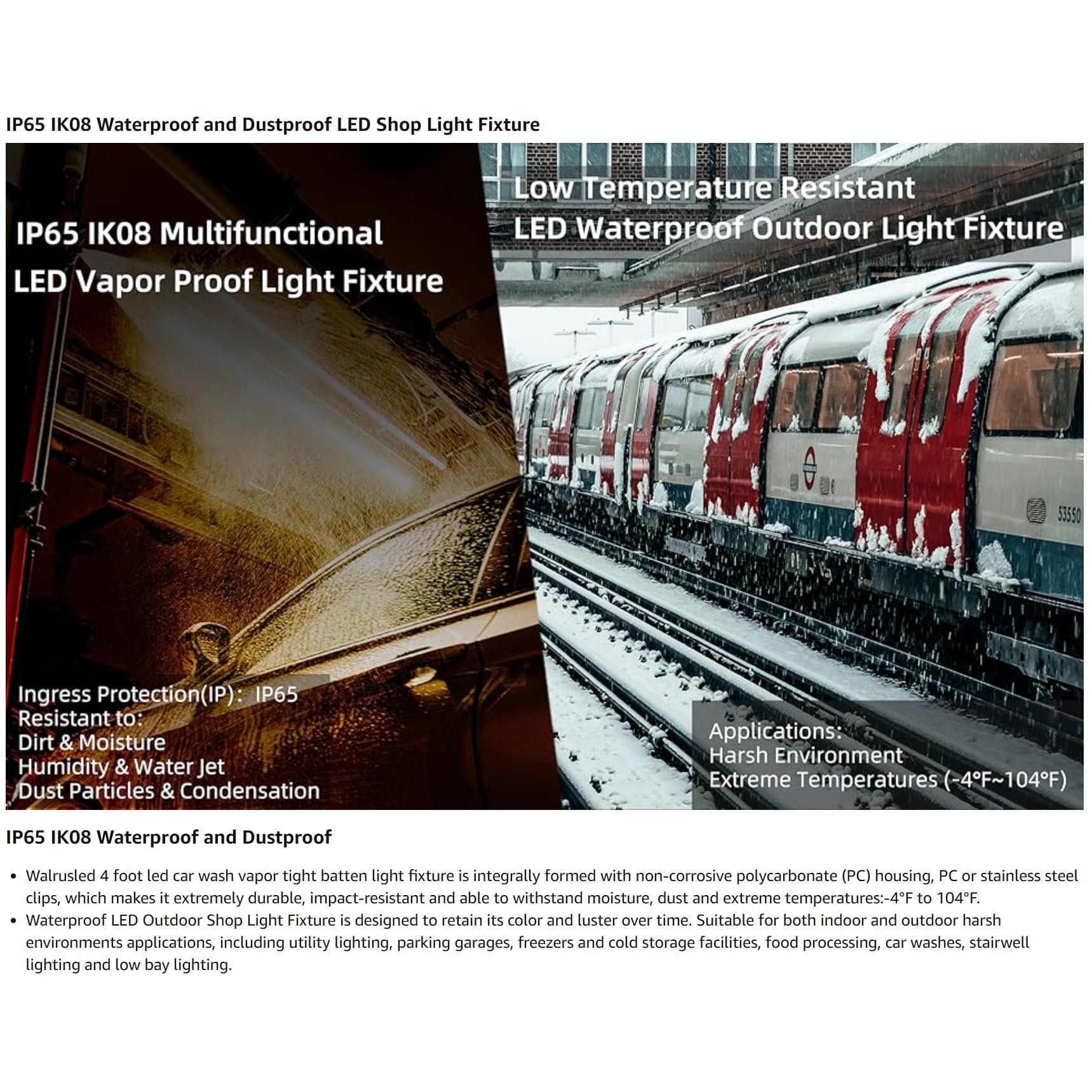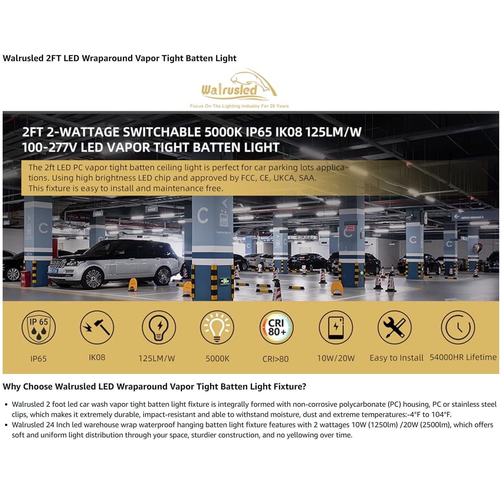 - 💡 【Waterproof & Dustproof】 Walrusled 2 foot led car wash vapor tight batten light fixture is integrally formed with non-corrosive polycarbonate (PC) housing, PC or stainless steel clips, which makes it extremely durable, impact-resistant and able to withstand moisture, dust and extreme temperatures:-4°F to 104°F. It is designed to retain its color and luster over time. Suitable for both indoor and outdoor harsh environments applications, including utility lighting, parking garages, freezers and cold storage facilities, food processing, car washes, stairwell lighting and low bay lighting.