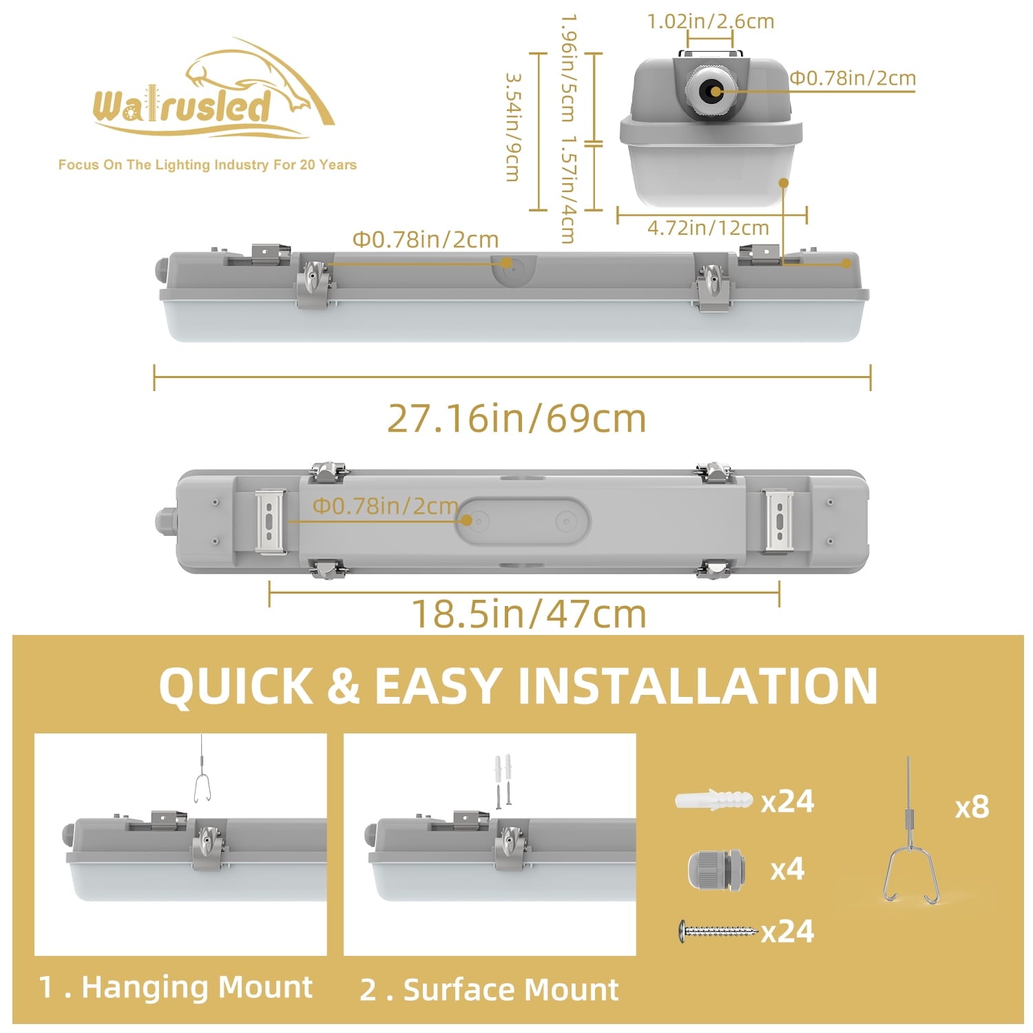 - 💡 【Wattages Selectable & Wide Application】 Walrusled 24 Inch led warehouse wrap waterproof hanging batten light fixture features with 2 wattages 10W (1250lm) /20W (2500lm), which offers soft and uniform light distribution through your space, sturdier construction, and no yellowing over time. You can choose any brightness to create the most suitable lighting for your activity or environment, such as kitchen, walk in closet, laundry room, warehouse, workshop, workbench, workspace, barn, utility and recreation room, equipment room, storage room, restroom, craft room, industrial workstation, basement, attic, carport, auto shop, hallways, garage, school, hospital, office and etc….