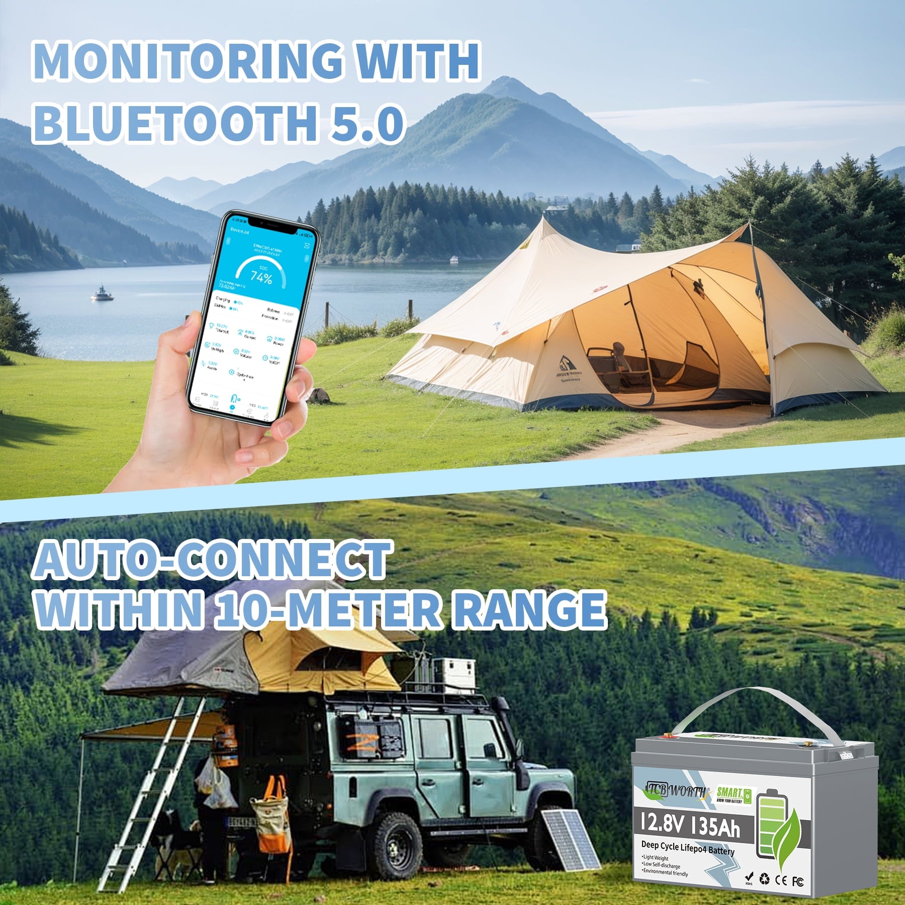 - 【Great A+ LiFePO4 Cells】12.8V 135Ah Bluetooth LiFePO4 battery gives you more stable performance and greater power,has high energy density,Long cycle life,Great safety performance,No memory effect, etc. it provides long-lasting power for various applications, from RVs to solar systems.