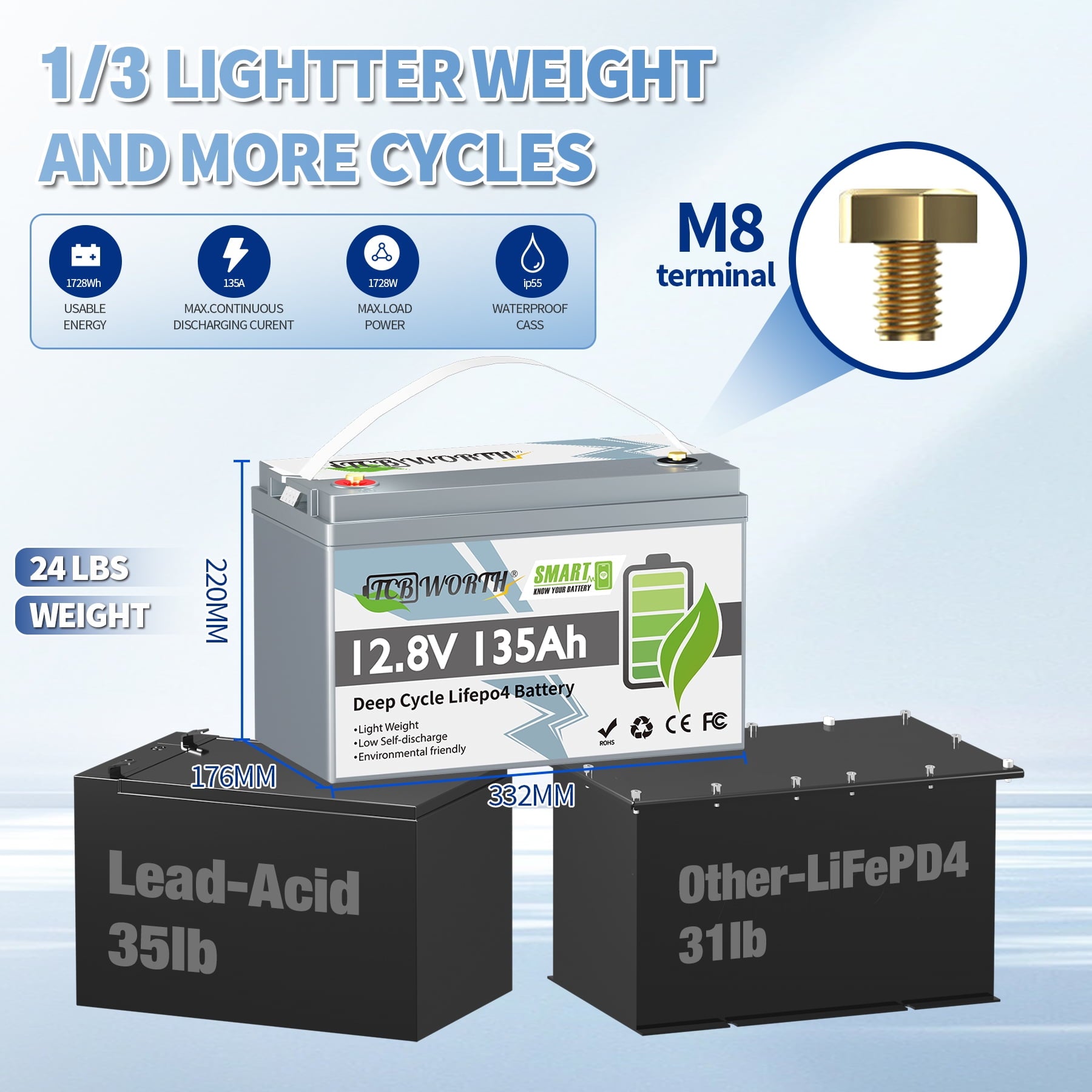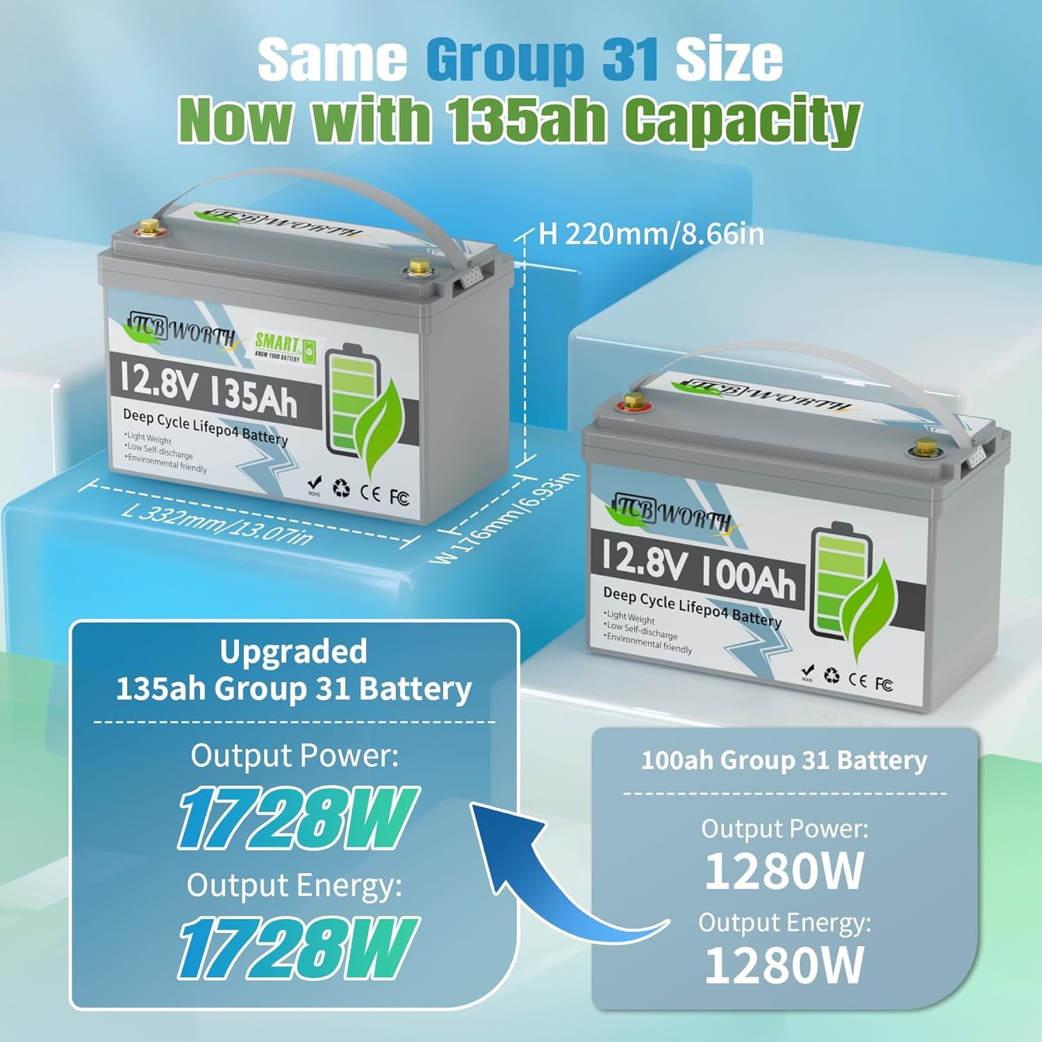 - 【Larger Energy Efficiency】TCBWORTH 12V 135Ah LiFePO4 battery with a compact size and 1.72kWh energy capacity,it has a longer battery run time than 12V 100AH battery.