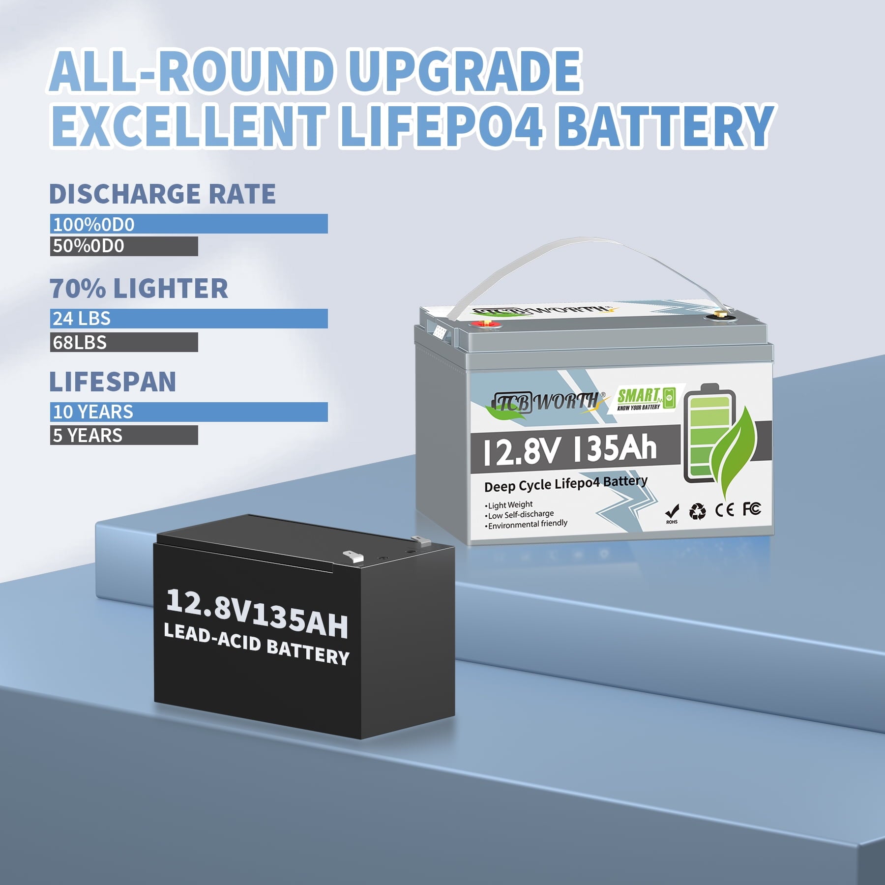 - 【10 Years Lifetime】 TCBWORTH 12.8V 135Ah LiFePO4 battery provides 4000~15000 cycles (10 times longer) 4000 Time Cycles at 100% DOD. Contrasting conventional lead-acid batteries(3-year lifespan, 300-500 cycles), it with a remarkable 10-year lifespan.