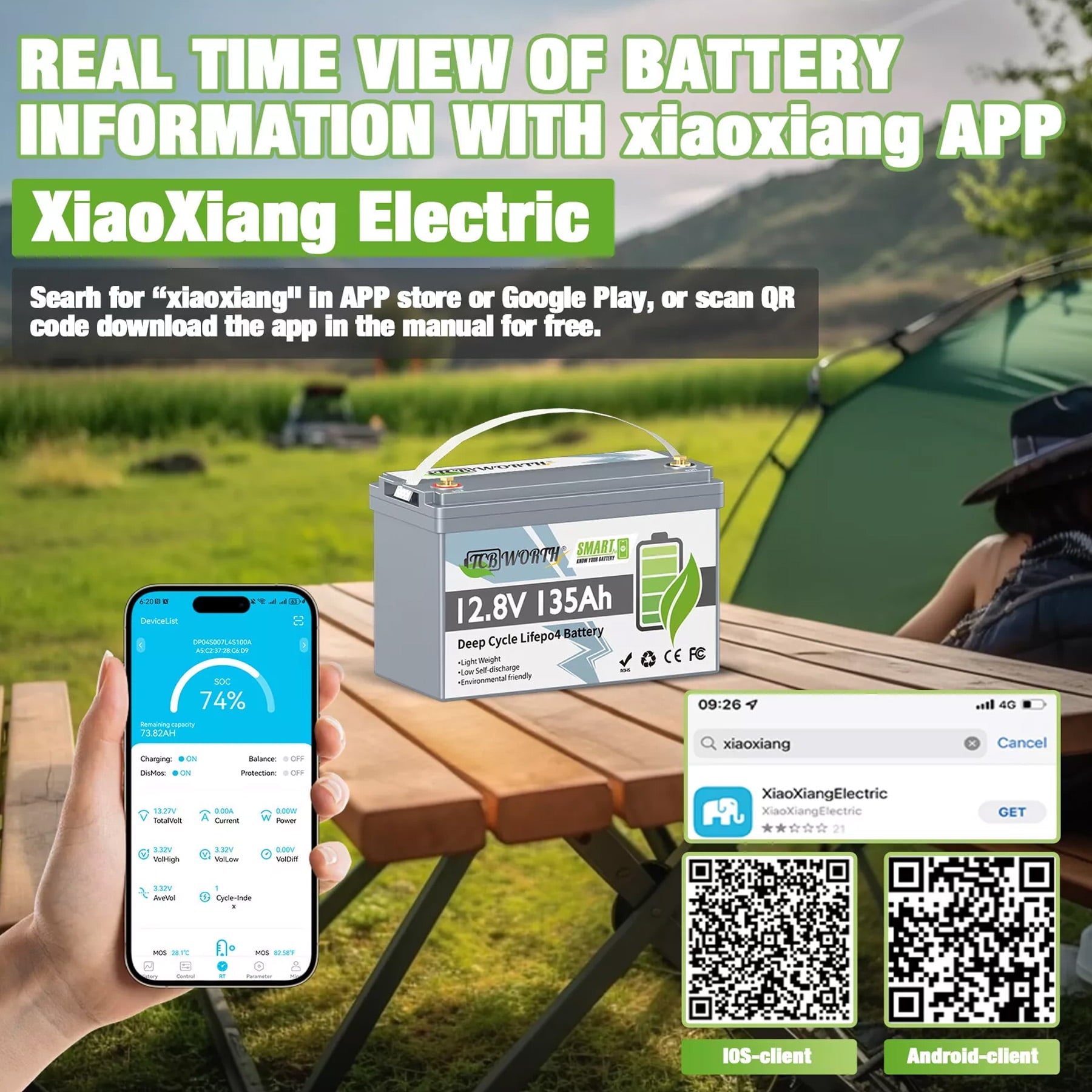 - 【Smart BMS & Low-Temp Protection】This 12V 135Ah Smart LiFePO4 Lithium Battery is built-in upgraded smart 100A BMS,allows you to monitor the battery information in real time, and easily cope with all kinds of environments and situations at anytime, anywhere. Moreover, it can prevent the battery from over-charging, over-discharging, over-current and short-circuit, and upgraded low-temperature cut-off function ensures safe use in low temperature and any environment.