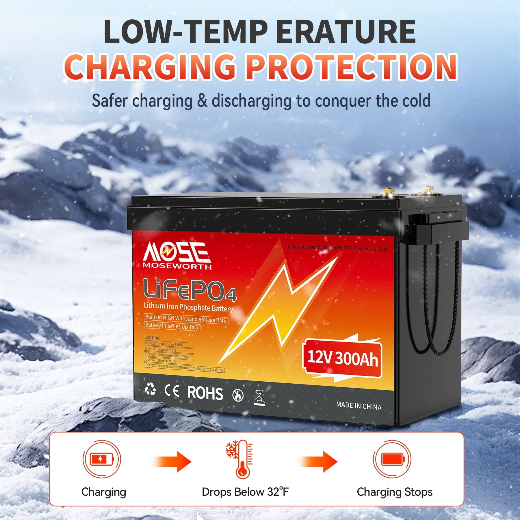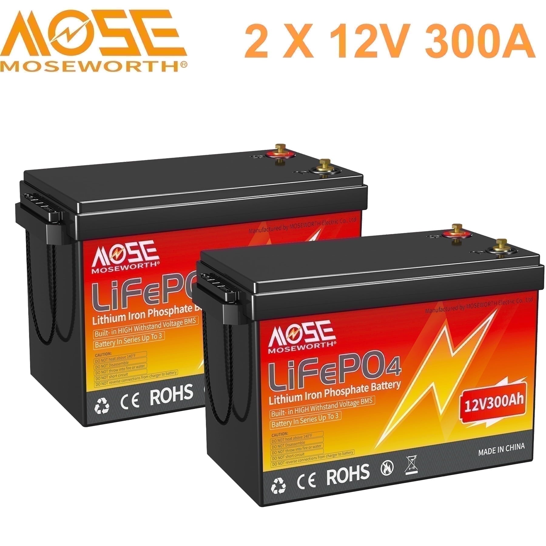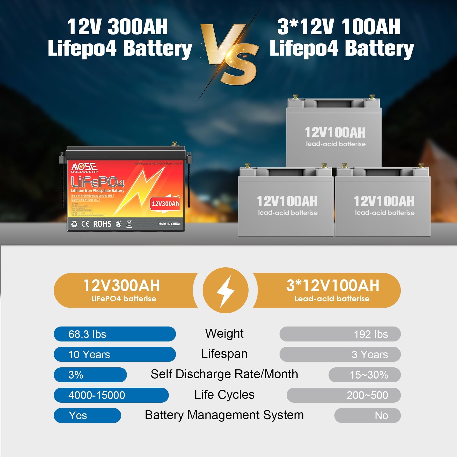 - 【Cost-Efficient & Longevity】MOSEWORTH 12V 300AH LiFePO4 Battery with a lifespan of up to 10 years and 4000-15000 cycles, our 12V 300Ah LiFePO4 battery produces a total of 15360kWh energy (3840Wh x 4000 cycles = 15360kWh), providing 50% power savings compared to utility power. Simple installation and reliable performance offer clean energy and cost savings.