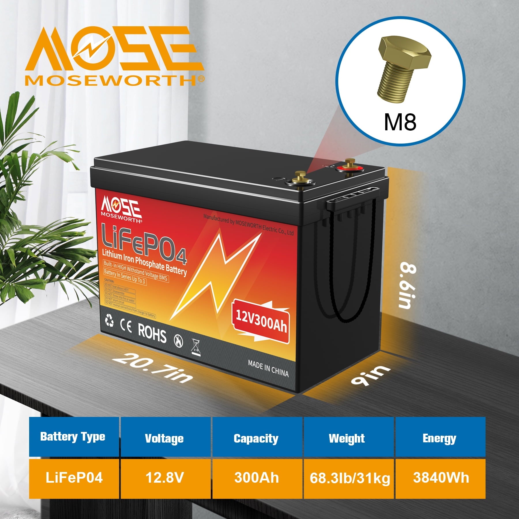 - 【1/3 Lightweight 】MOSEWORTH 12.8V 300AH LiFePO4 Battery is smaller and 1/3 the weight of the lead acid battery at the same capacity, which is convenient for you to remove and place it.Its space-saving form factor is ideal for a wide range of RV layouts.