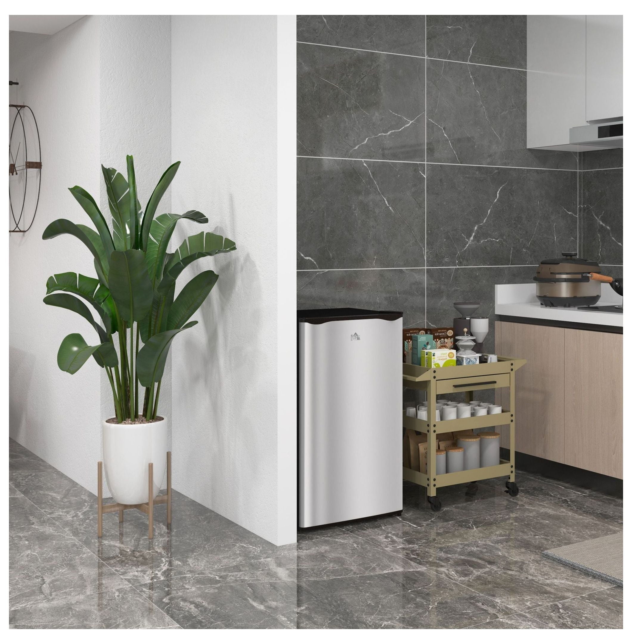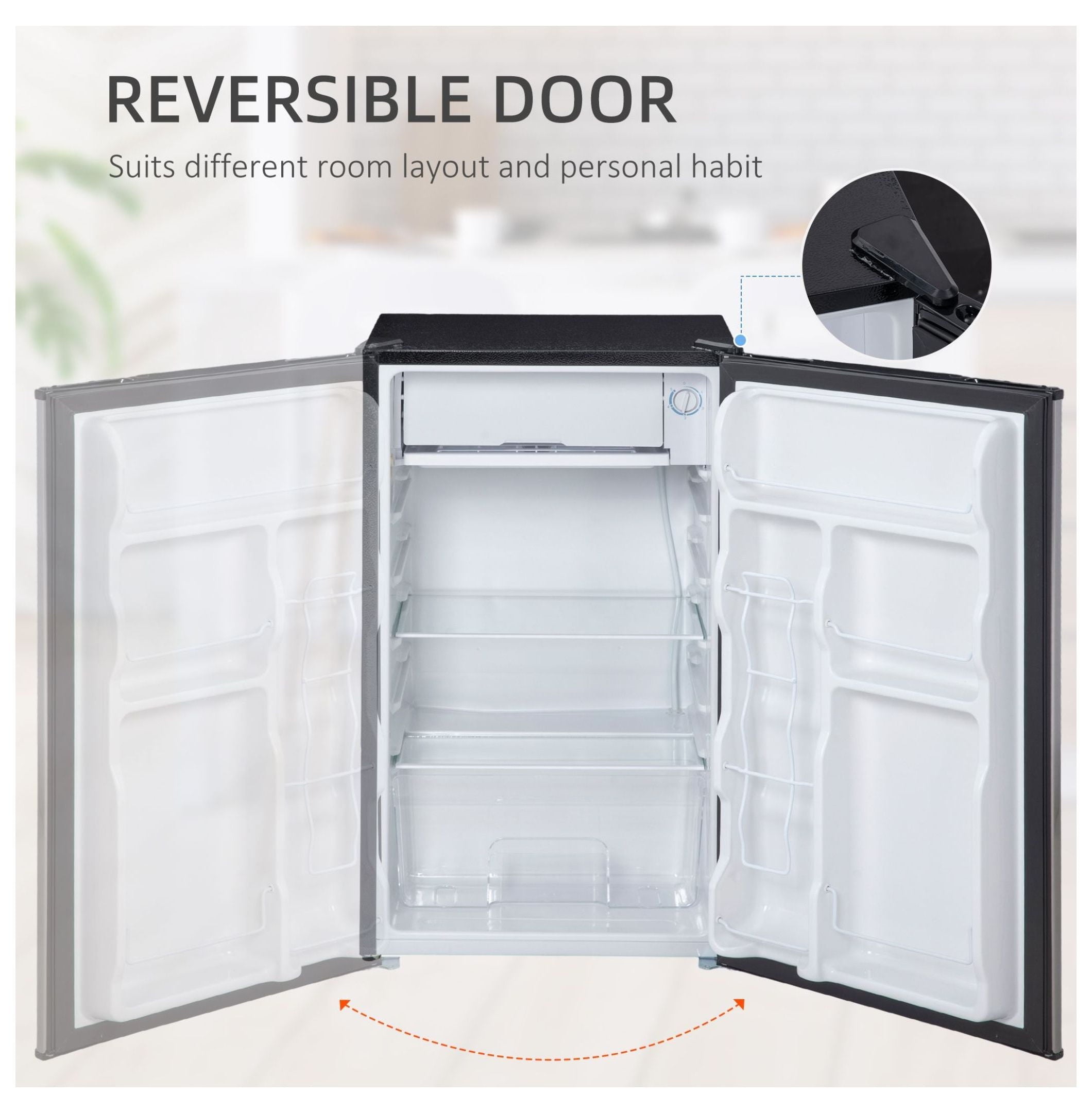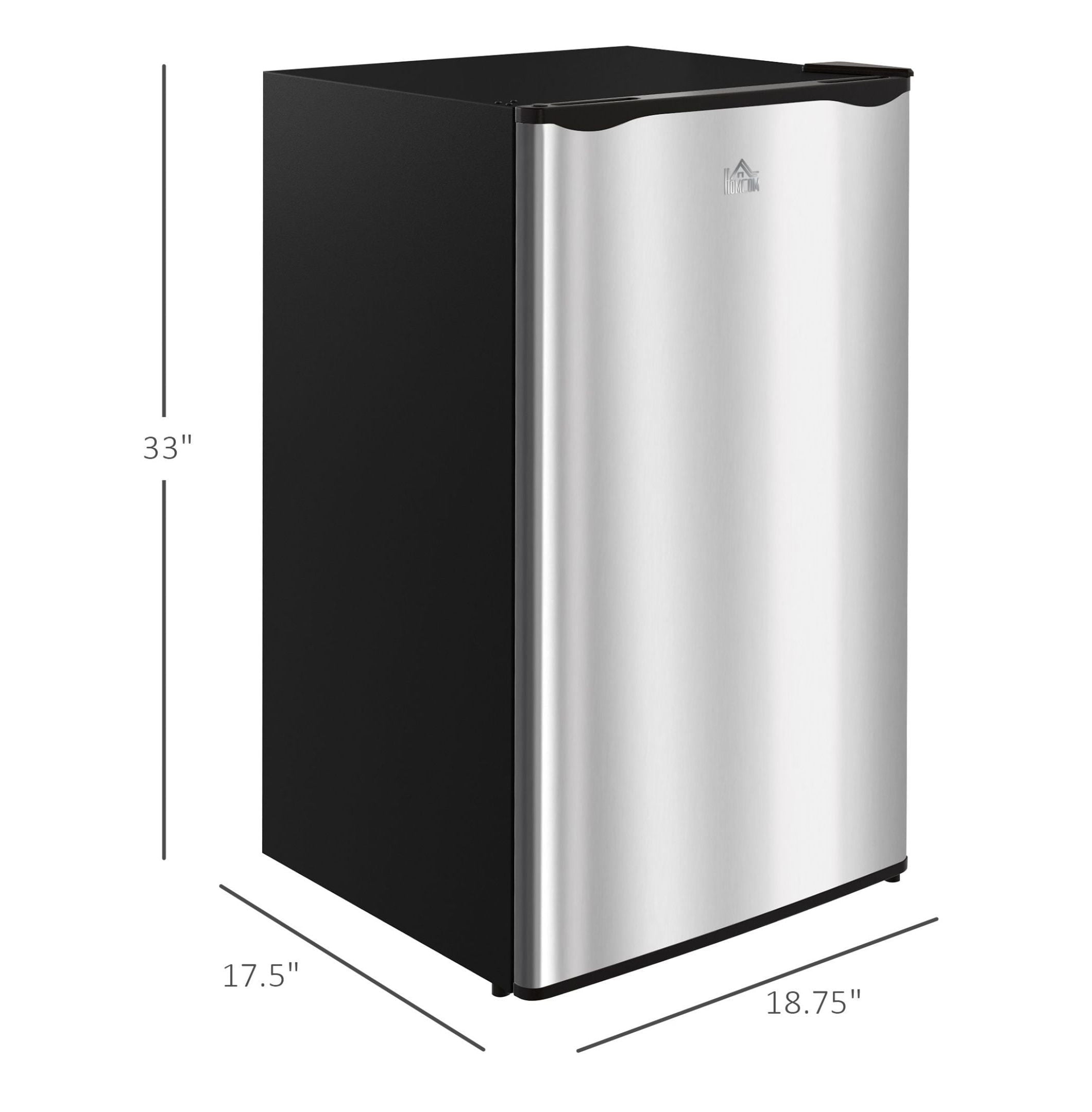 Keep your favorite snacks and drinks within easy reach with this 3.2 Cu.Ft mini fridge freezer; designed for convenience in dorms, apartments, bedrooms, and more. This compact refrigerator features a 0.35 Cu.Ft freezer compartment, adjustable shelves, and door storage to maximize space. The adjustable thermostat allows you to control the temperature, keeping food fresh, while the reversible door adapts to your room layout. With a low-energy consumption compressor, this fridge operates quietly at 39dB. It includes an ice box and shovel for added convenience. The overall dimensions are 18.75″ W x 17.5″ D x 33″ H, with a weight capacity of 33 lbs per shelf. Specifications include a manual defrost system, 115V/60Hz power, and 65W power consumption. Adjustable feet ensure stability on uneven surfaces. Enjoy the benefits of a conveniently sized refrigerator without sacrificing functionality and organization; perfect for smaller spaces and everyday use. Package includes the mini fridge, ice box, ice shovel, and a user manual.