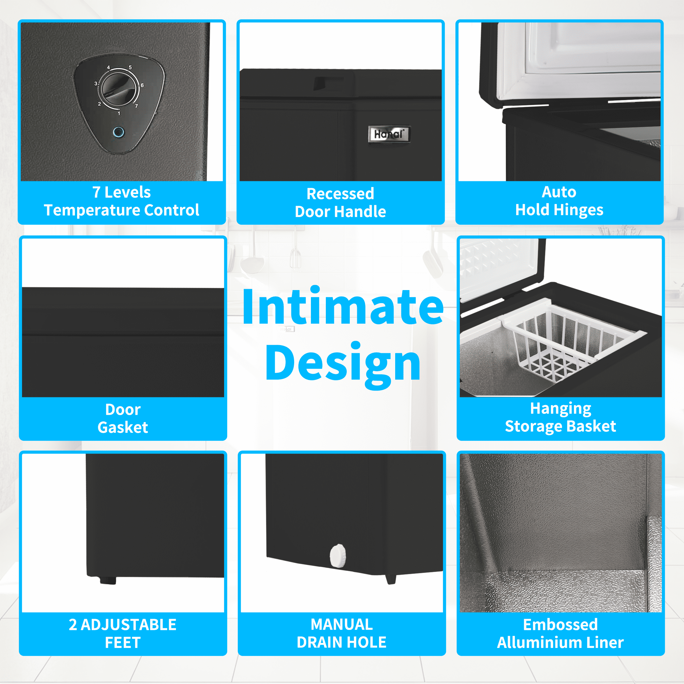 - Humanized Design for Ease of Use:Featuring door hinges that open at a 45° to 90° angle for convenient food storage.The removable storage basket makes it simple to organize,slide,and retrieve small items.The adjustable leveling legs ensure the freezer stands steady on uneven surfaces.