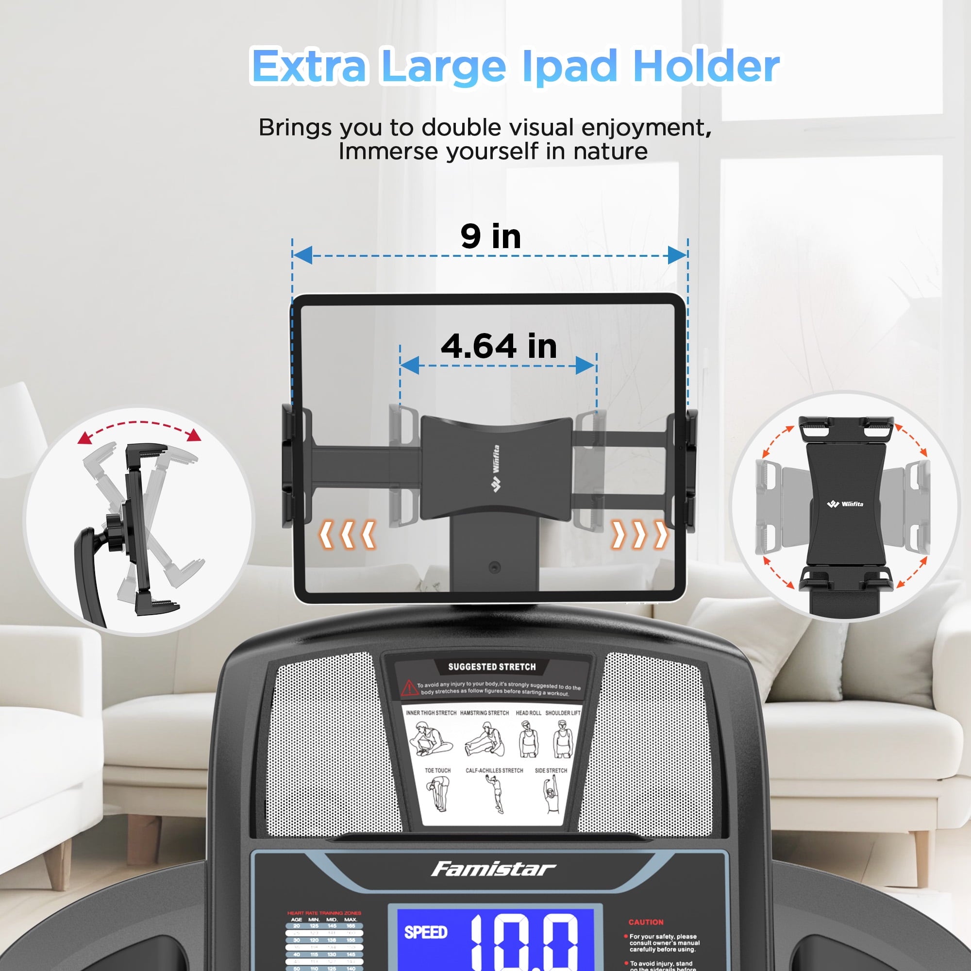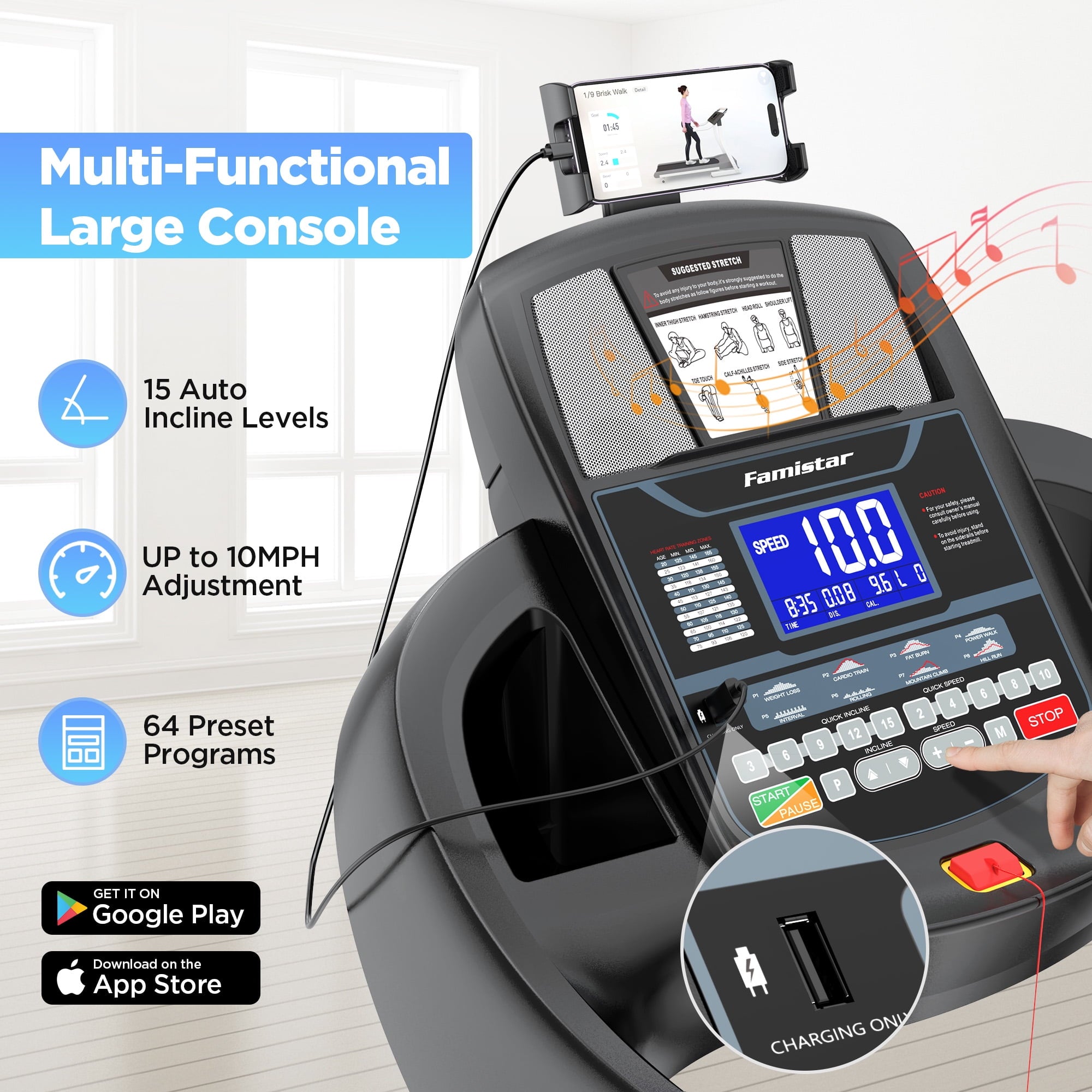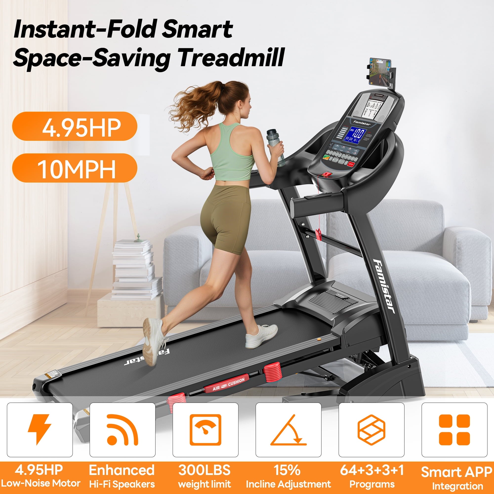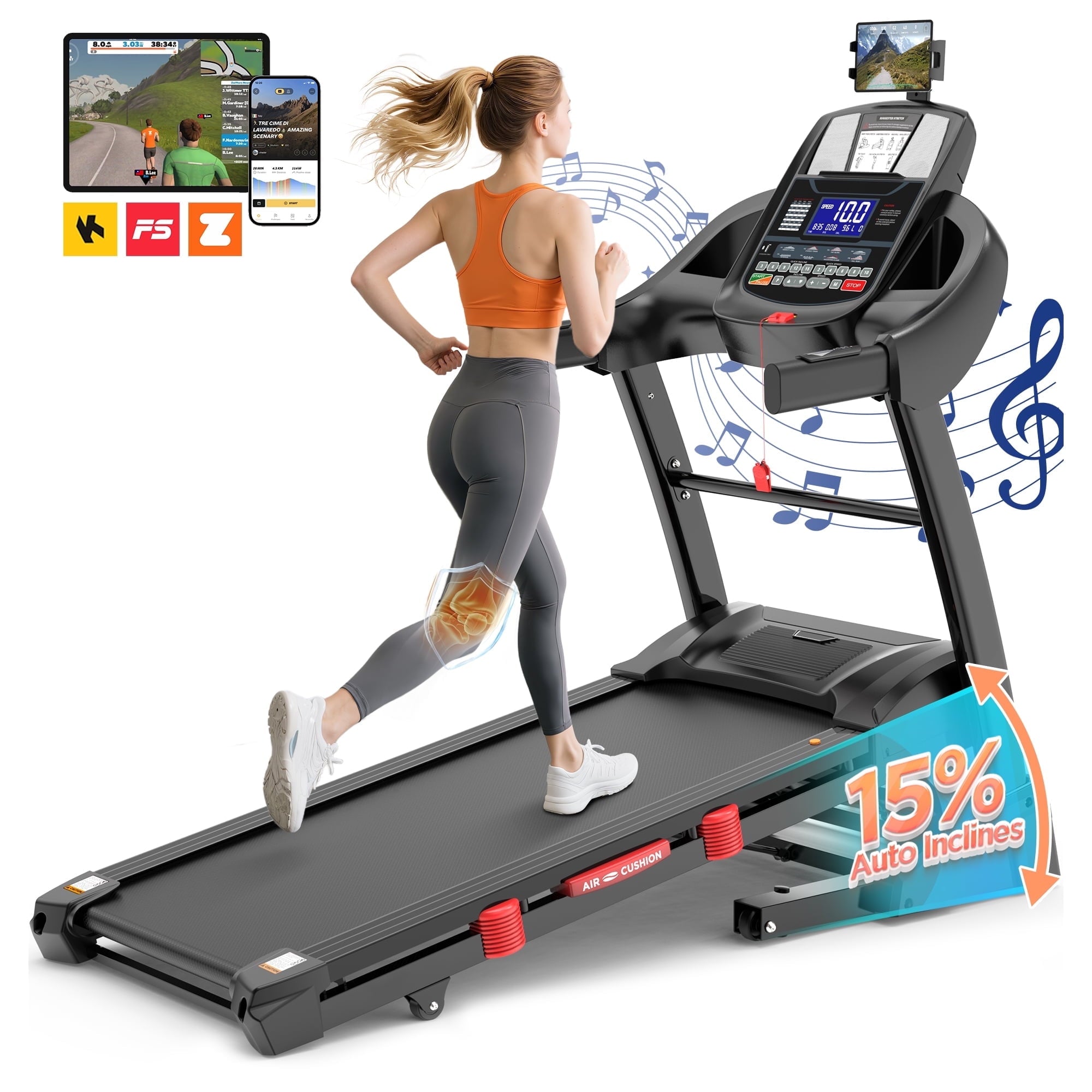Special Features: HiFi Bluetooth MP3 Speakers, Pulse Sensors, Multifunctional Console, Cushioned Belt, Air Damping System, Soft Drop Folding, Free Knee Pads, USB Charging, Side Baskets, 360° Adjustable Device Holder, Transport Wheels, Pre-Assembled 90%
