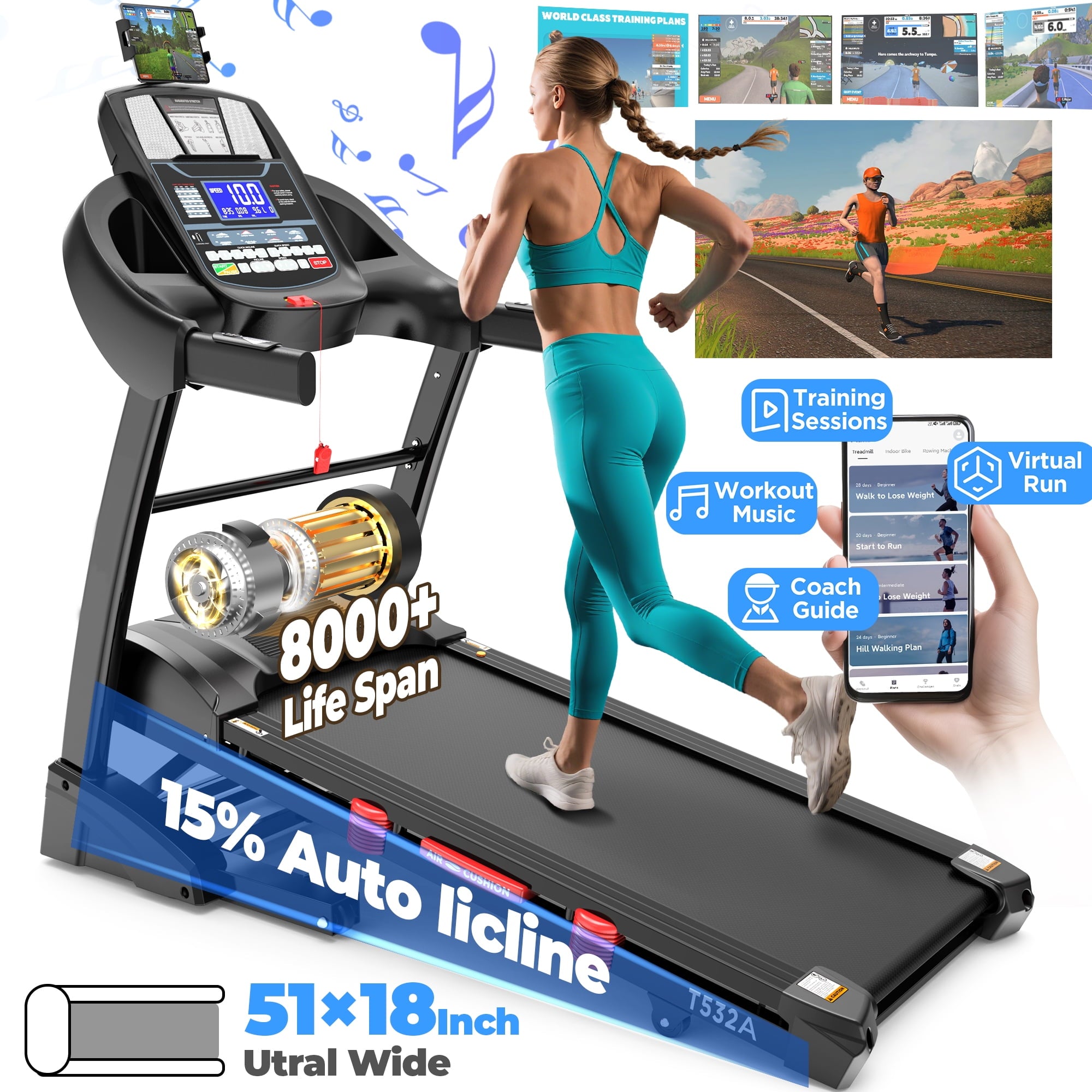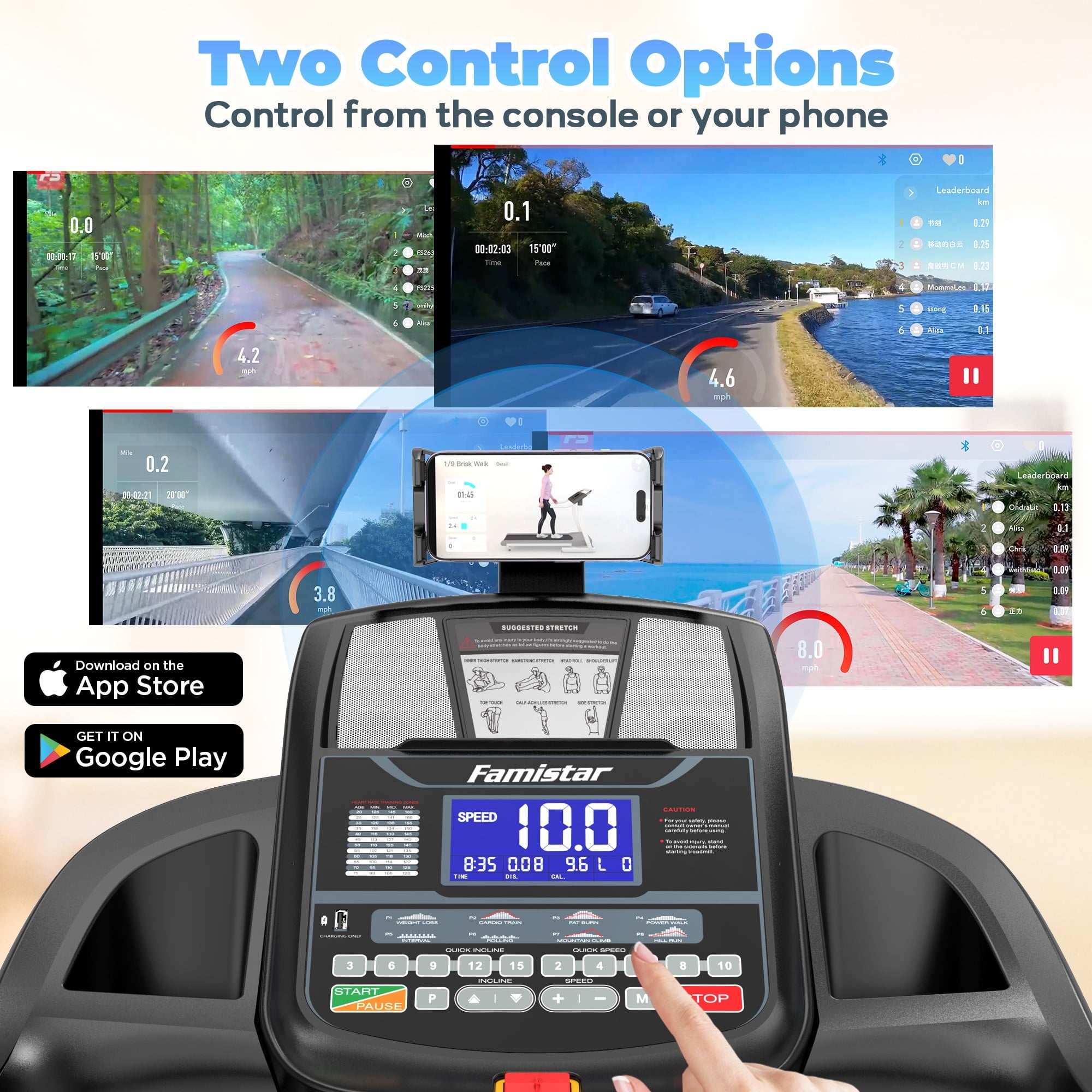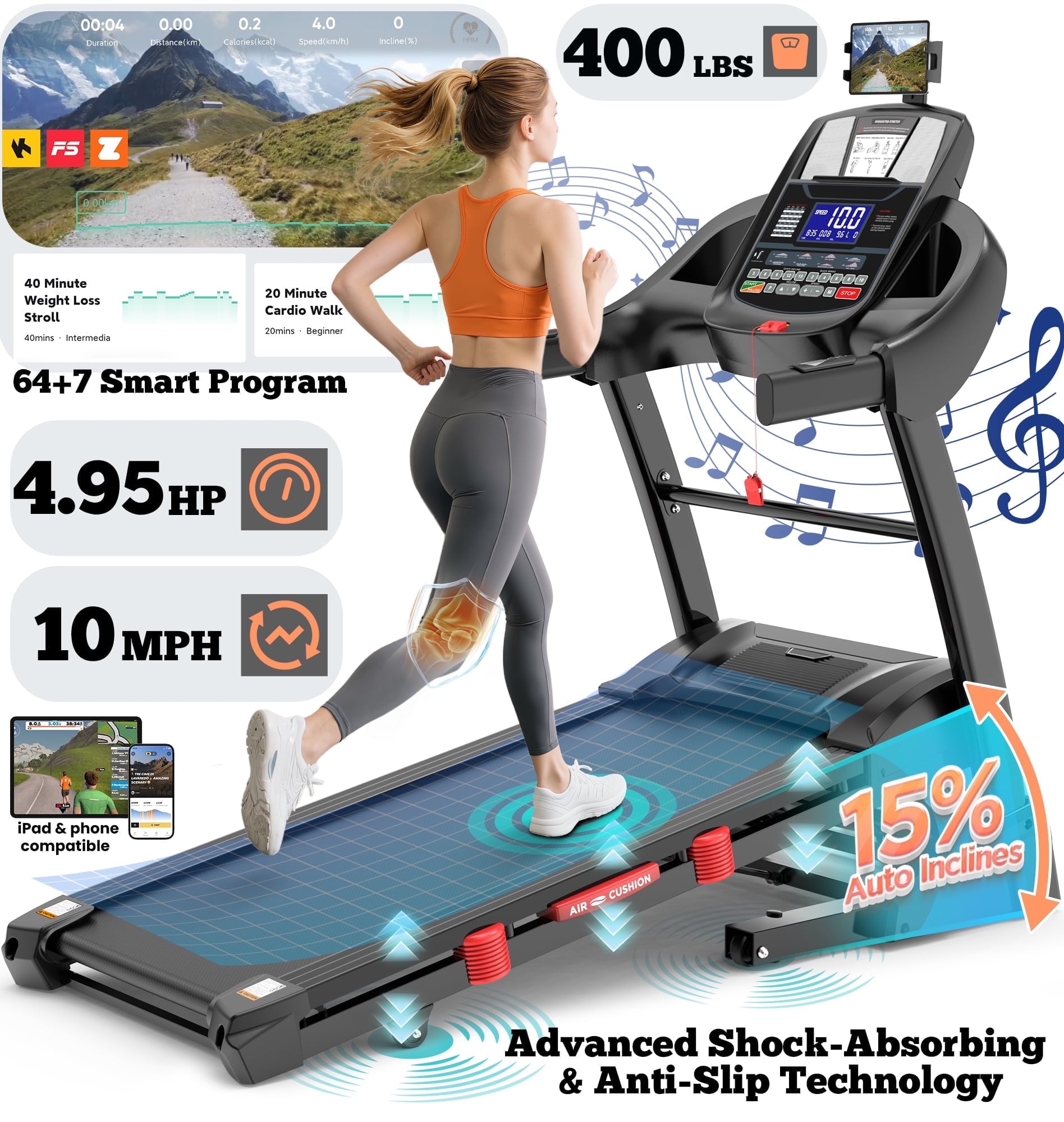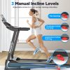 Powered by a 3.75HP high-performance silent motor, this treadmill with incline offers speeds up to 7.5 MPH, perfect for walking, jogging, or running. The 3-level manual incline feature transforms flat runs into calorie-burning hill climbs, adding challenge and variety to every workout. Combined with smart APP control, you can enjoy scenic runs, interactive training sessions, personalized fitness plans, and real-time performance tracking—all at your fingertips.