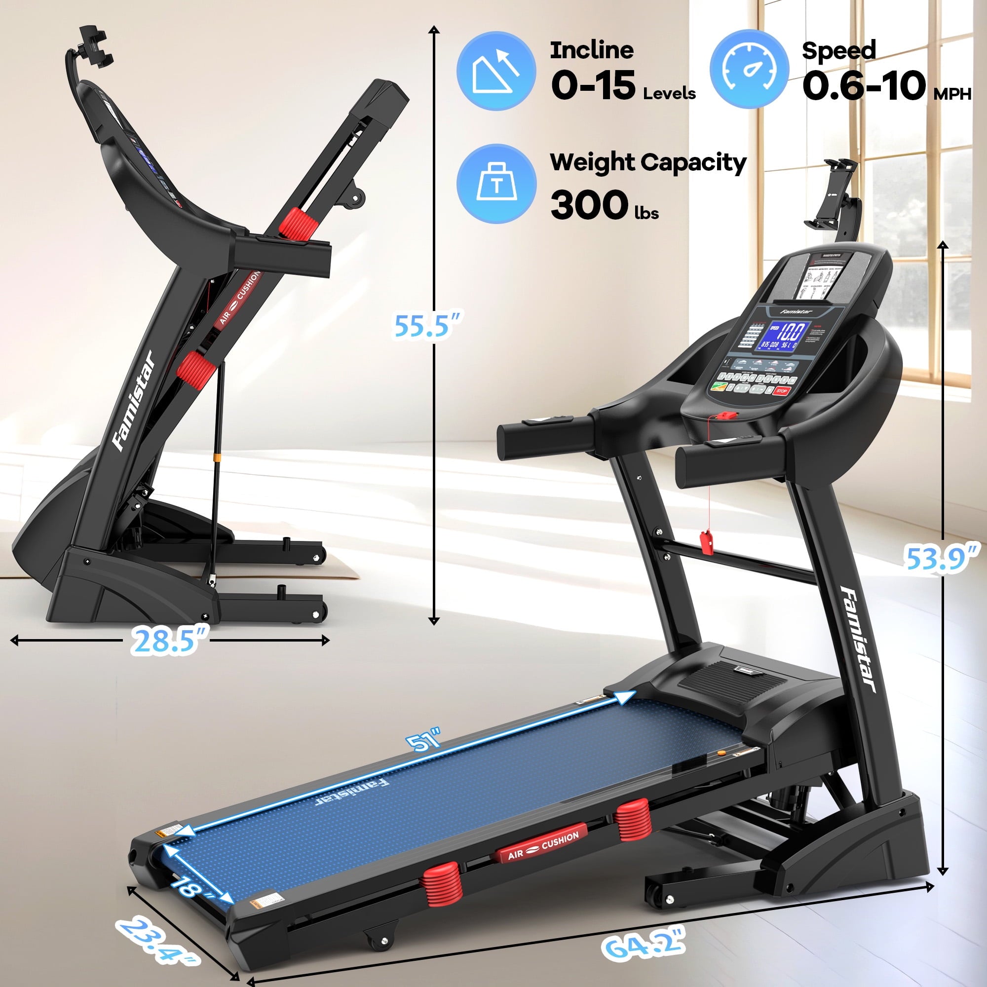 • 【Spacious Cushioned Running Belt】 Run with confidence on a wide 5-layer cushioned belt enhanced by 6 shock-absorbing cushions and an air damping system. This jogging walking treadmill offers a joint-friendly surface that minimizes impact while providing a smooth, stable stride. Perfect for daily walking, light jogging, or intense running sessions, it combines comfort and durability—ideal for a treadmill 300lb capacity requirement.