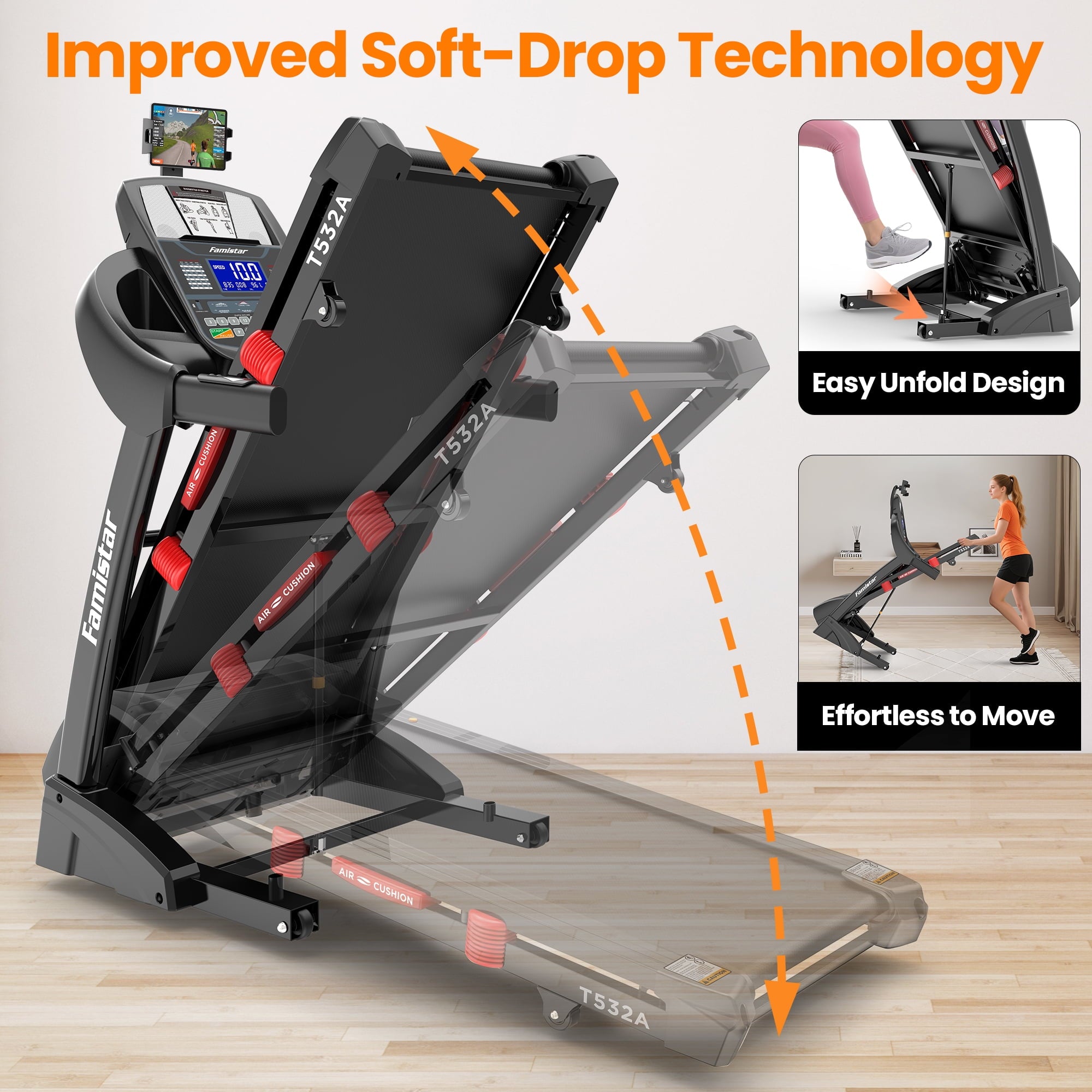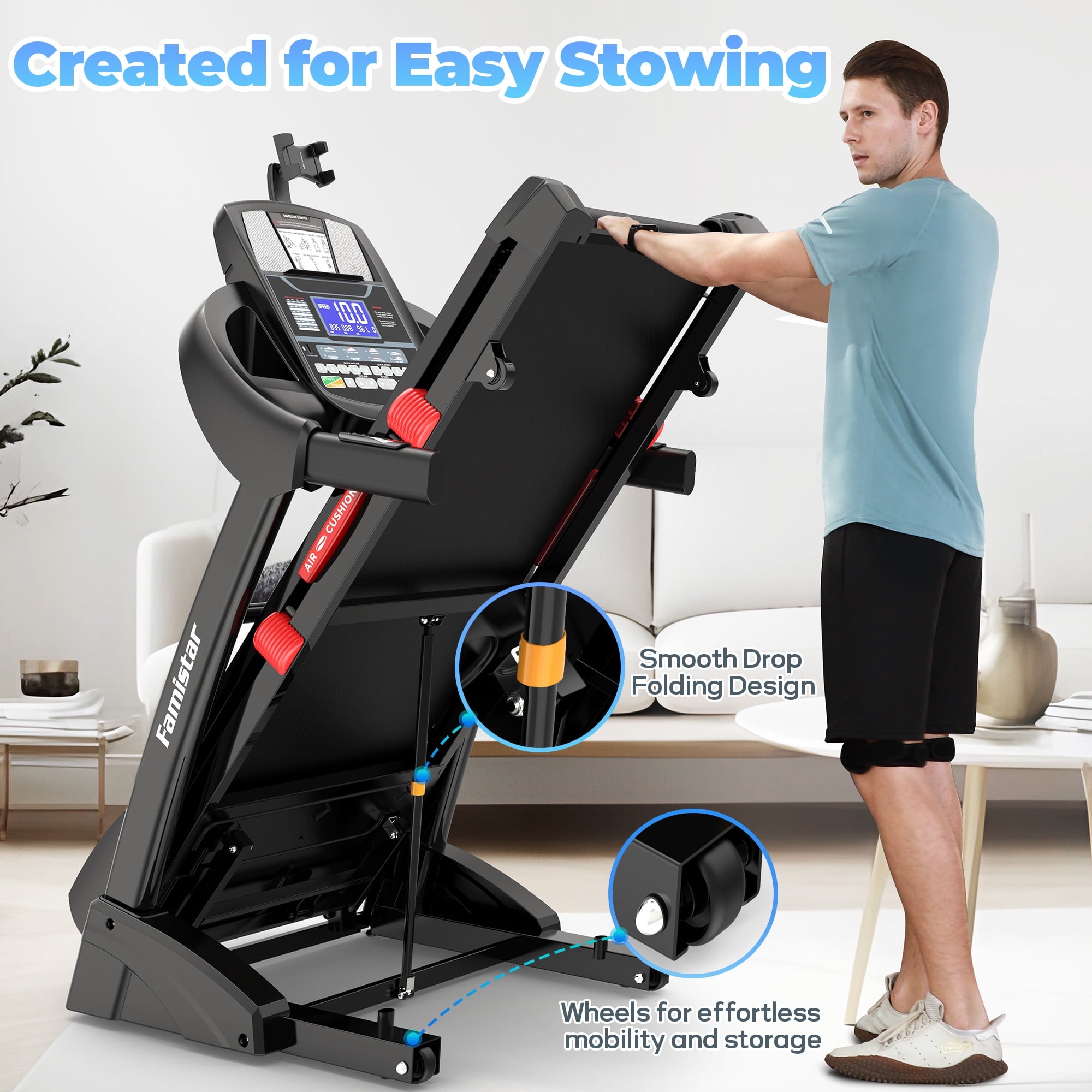 • 【Convenient Folding Design】 Maximize your space with a soft drop folding treadmill system and built-in transport wheels, making this portable treadmill easy to store and move in seconds. Whether in a home gym, apartment, or multipurpose room, this foldable treadmill is practical exercise equipment for those who value performance and space efficiency.