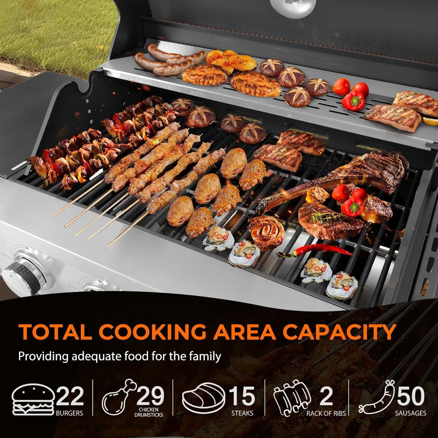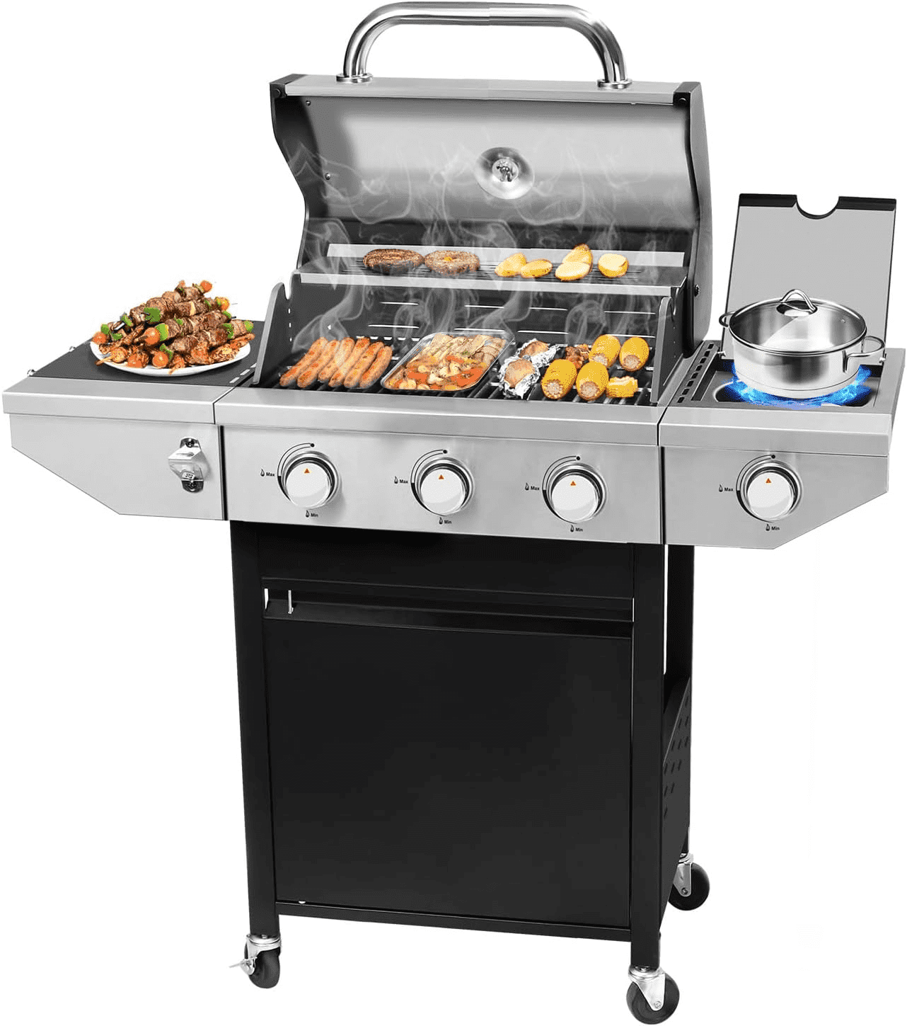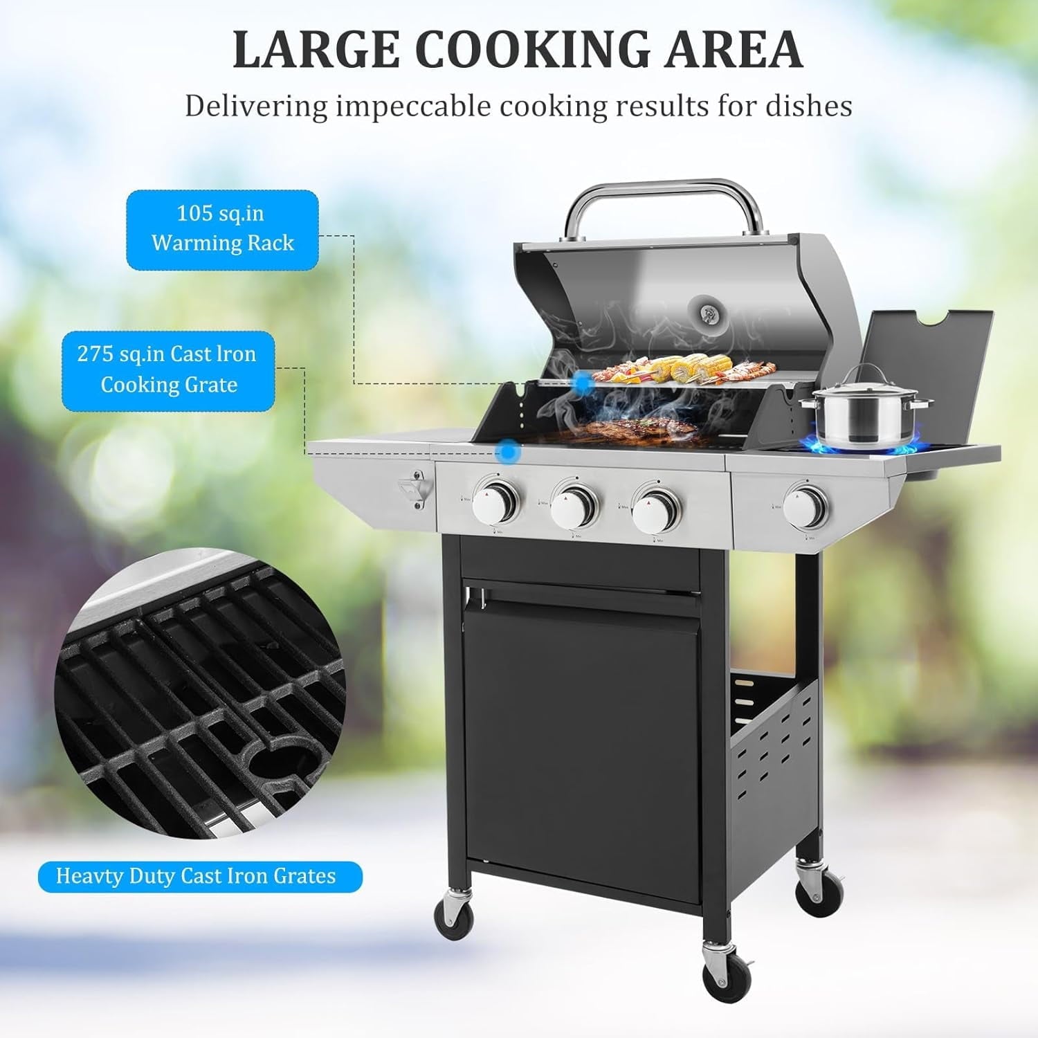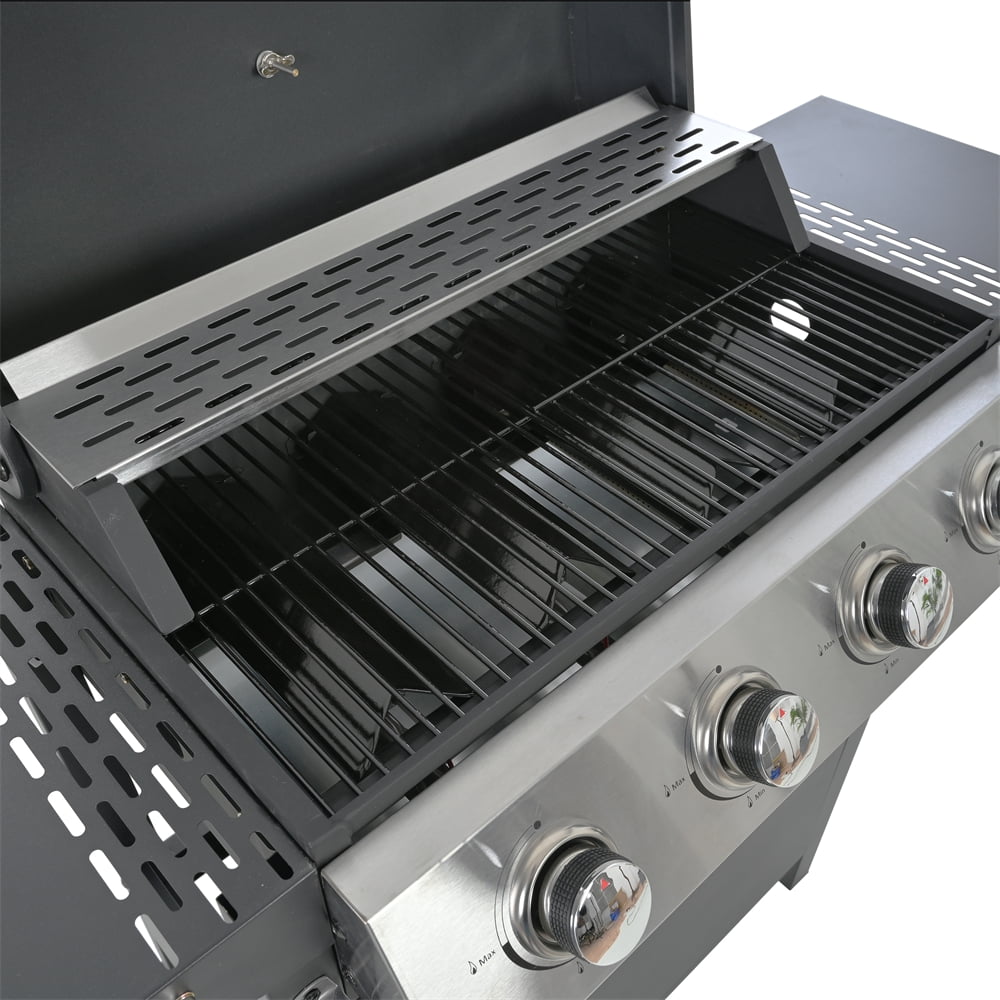 - SPACIOUS COOKING AREA: 379.7 square inches of cooking area is perfect for family use, with 275 square inches of main cooking area plus 104.7 square inches of warming racks, the ideal size for a barbecue party or everyday family grilling. The propane gas grill has a side countertop for easy maneuverability and storage, and a side burner suitable for warming up sauces and side dishes to complement grilled food.UPGRADED MATERIALS: The Gas Grill features stainless steel construction for added style and durability. The grill is made of durable, easy-to-clean porcelain-enameled cast iron material that helps prevent rusting and cracking. The flame regulator and stainless steel grill help dissipate heat evenly over the entire cooking surface. The stainless steel control panel is painted to withstand 600-degree temperatures, heats quickly and evenly, and ignites the burners instantly and reliably.EVEN HEATING: The gas grill features a push-button ignition that activates 28,650 BTUs of heat, and includes a side-warming grate that provides an additional 8,500 BTUs of heat. The stainless steel flame tamer distributes heat evenly to every inch of the grill pan, and the enameled porcelain wire grill pan provides excellent heat retention, helping to add even more flavor to your food. The enameled grill measures 19.4 x 14.2 inches and provides more even heat to the cooking area when used with the 3 stainless steel burners and enameled flame tamer.THOUGHTFUL DESIGN: Stainless steel surface treatment, durable and beautiful. Built-in thermometer for easy temperature control. The lid can keep the food better warm when cooking. Side hooks are more convenient for the operator to store kitchen utensils. This outdoor grill comes with 4 casters for easier mobility. Two of them are lockable wheels to ensure safety and stability while cooking. The bottom shelf of the propane grill can hold up to 20 lbs. of LP gas tank (not included).MORE VERSATILITY: The portable grill is perfect for outdoor grilling activities for you and your family, as well as outdoor camping, backpacking, picnics and parties, and is a year-round alternative to outdoor cooking. The grill can also be used to prepare breakfast, lunch and dinner for the whole family.