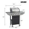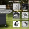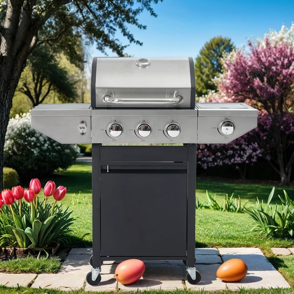 This Versatile 3-Burner Propane Gas Grill with a side burner and built-in thermometer is perfect for outdoor cooking and entertaining. Crafted with durable 0.8mm 430 stainless steel and enameled cast iron cooking grates, it offers precise temperature control and a spacious 275-square-inch main cooking area. The grill features a convenient one-button electronic ignition, 4 wheels for easy mobility, and a high-quality cover that protects against weather conditions. With a total of 37,000 BTUs and two side prep stations, this grill is ideal for grilling steaks, simmering sauces, and hosting family gatherings or backyard barbecues.