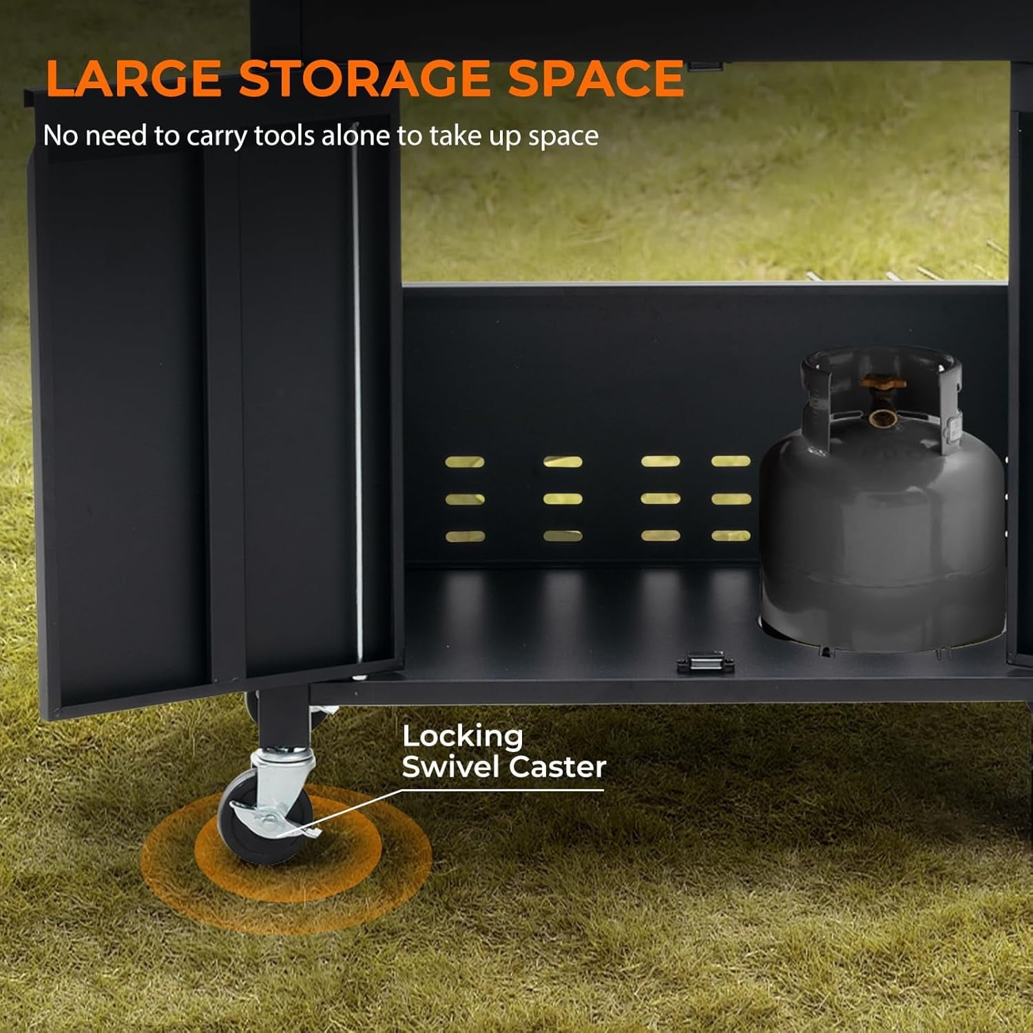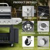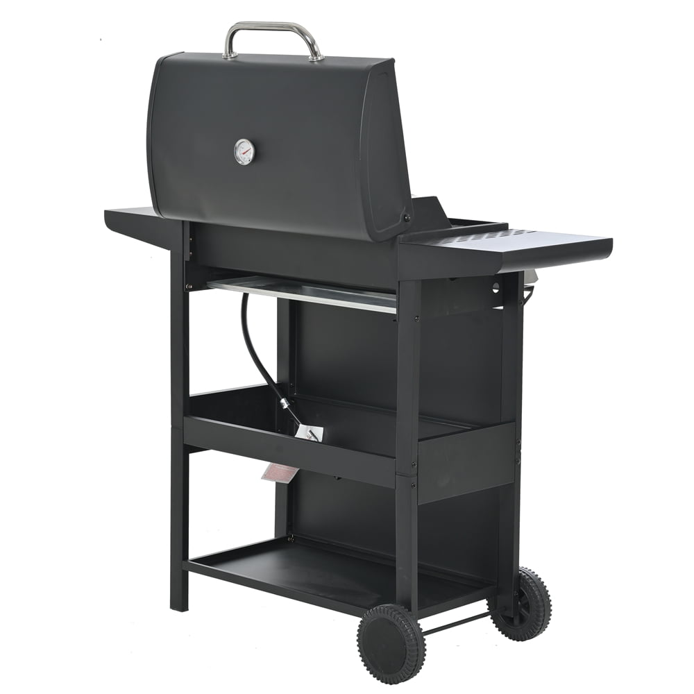 - THOUGHTFUL DESIGN: Stainless steel surface treatment, durable and beautiful. Built-in thermometer for easy temperature control. The lid can keep the food better warm when cooking. Side hooks are more convenient for the operator to store kitchen utensils. This outdoor grill comes with 4 casters for easier mobility. Two of them are lockable wheels to ensure safety and stability while cooking. The bottom shelf of the propane grill can hold up to 20 lbs. of LP gas tank (not included).