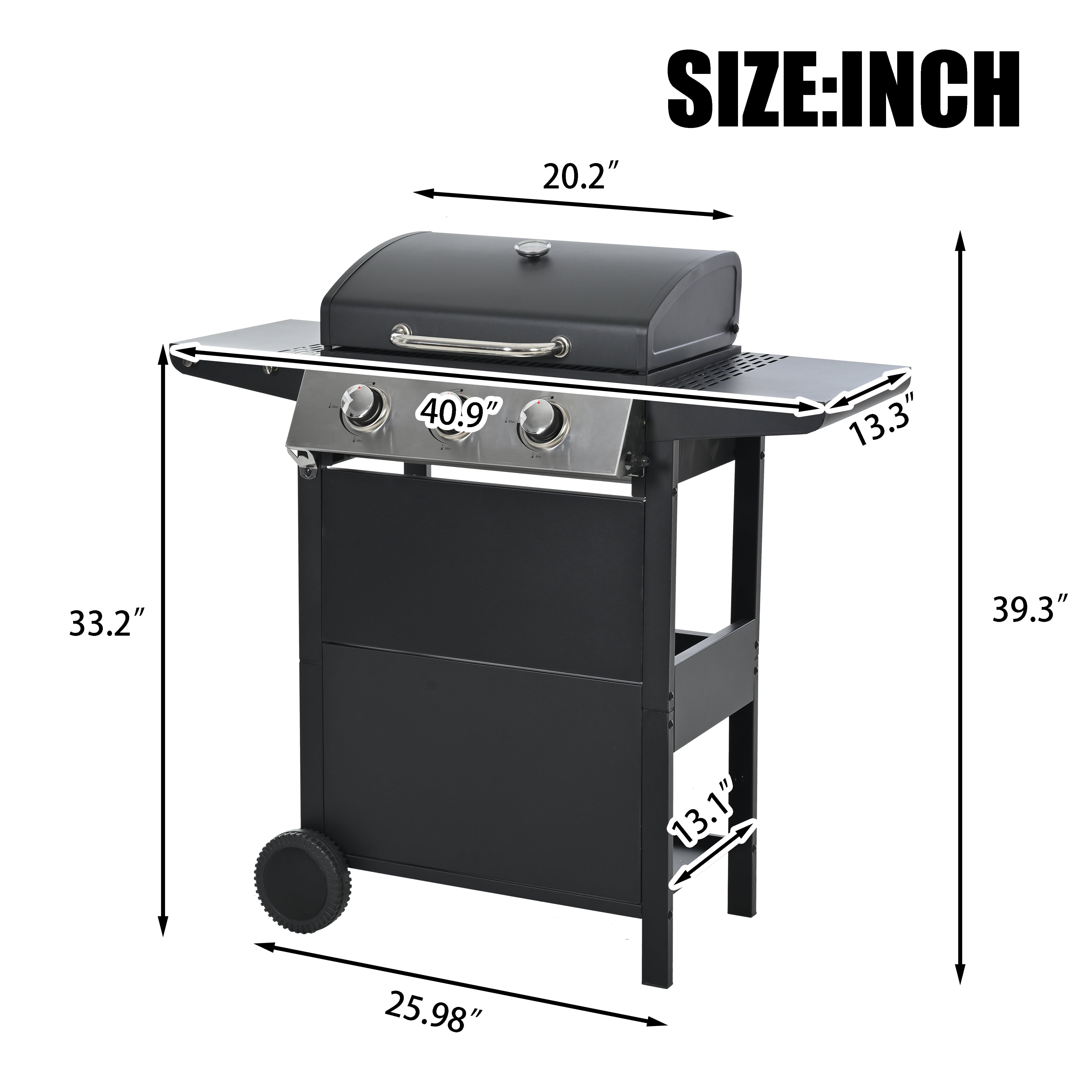 • CONVENIENCE: The whole Stainless steel control panel with chromium plating control knob makes this propane gas grill more study and delicate, a stainless steel handle and a built-in stainless steel thermometer on the cover lid, two tables and two wheel casters for storage and moving