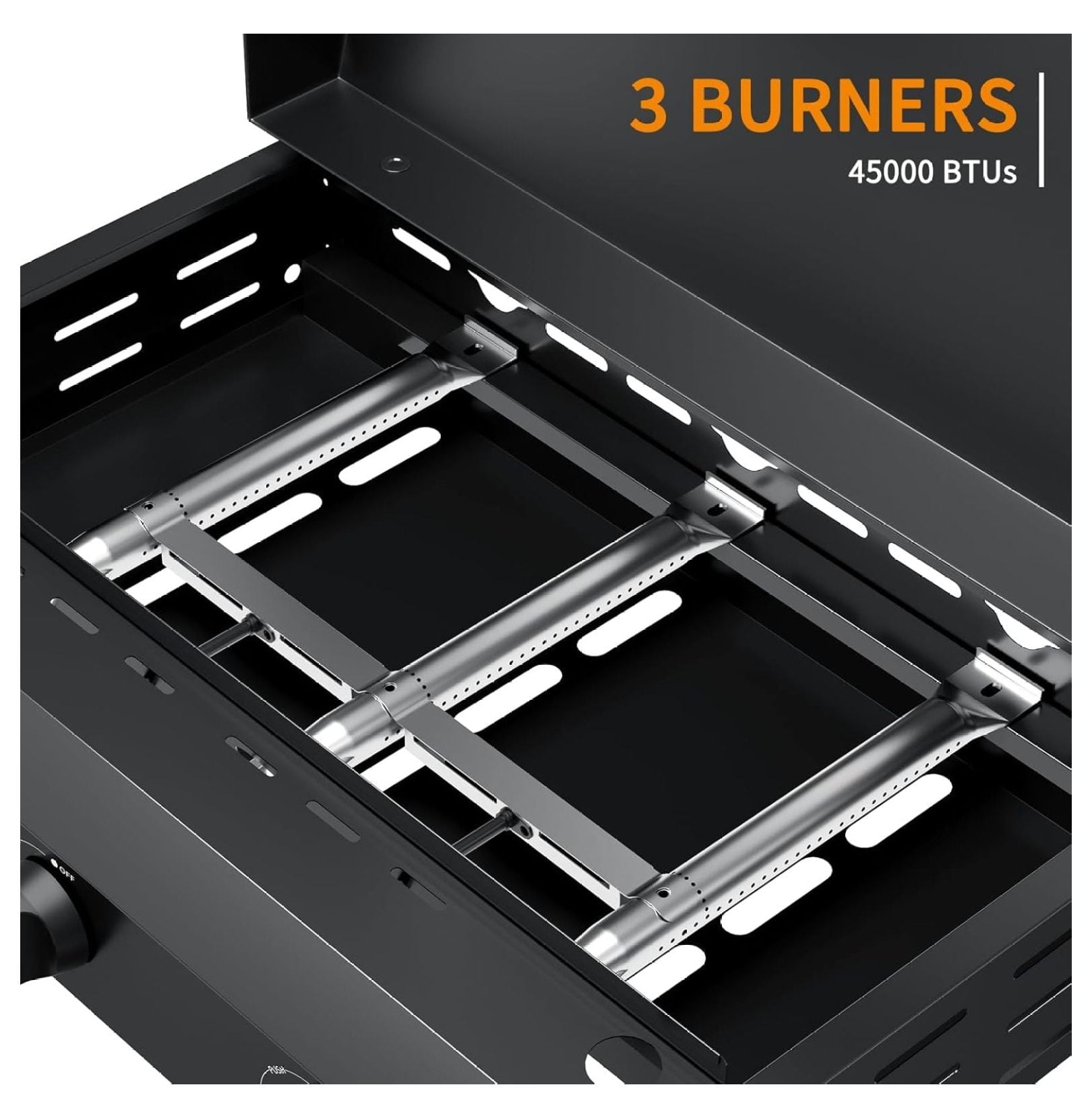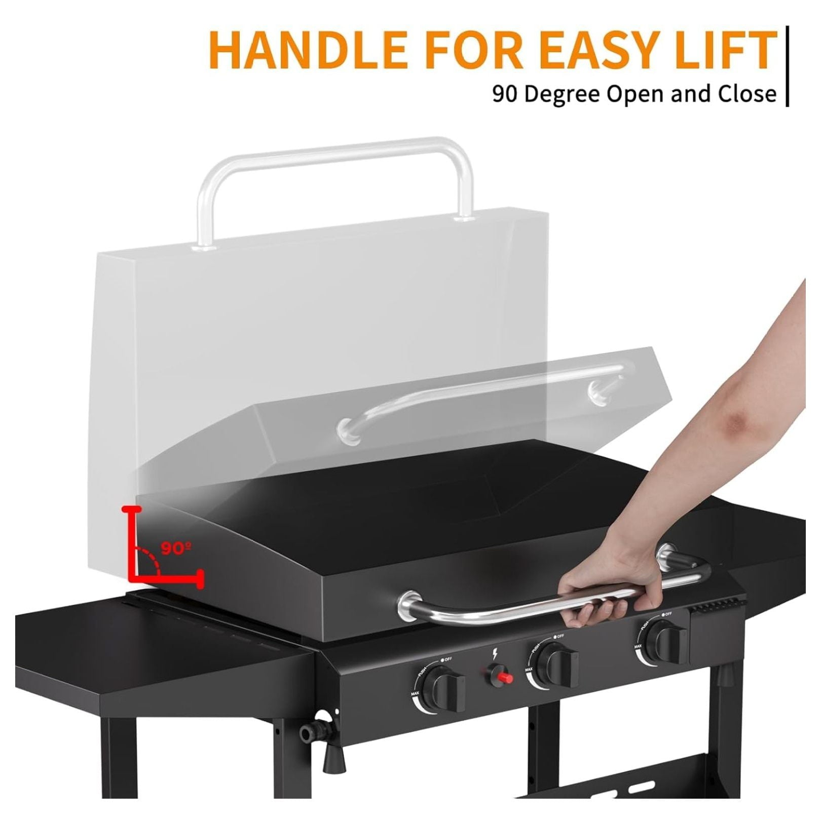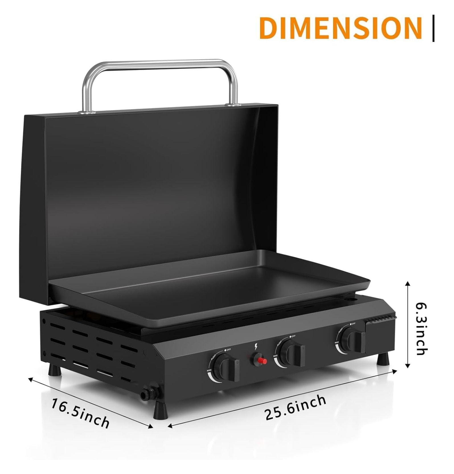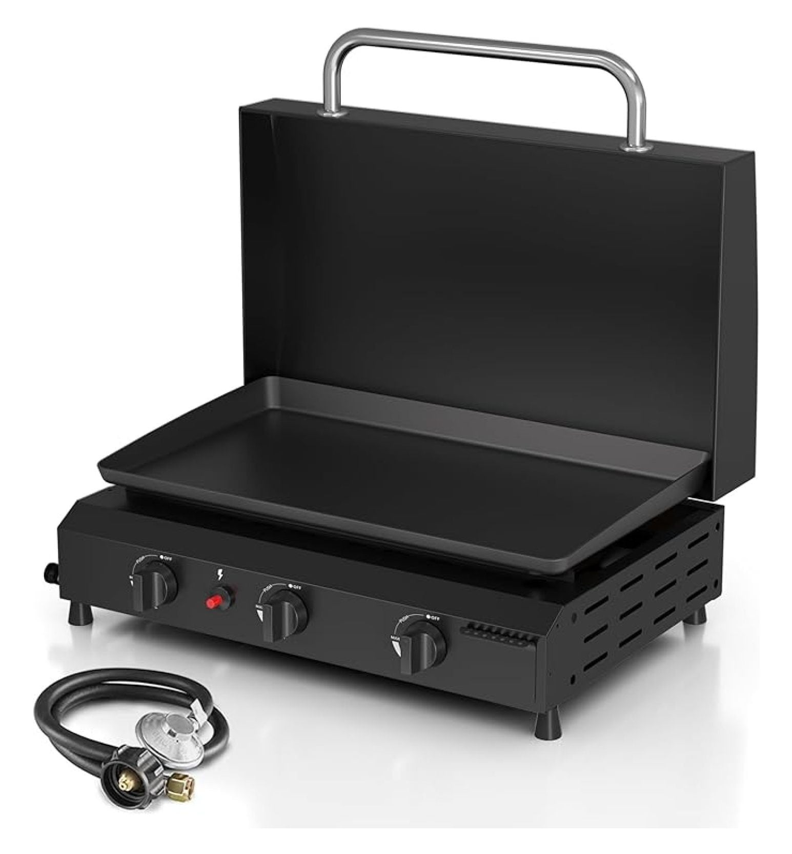 Enjoy versatile cooking with this 3-burner flat top grill featuring a durable stainless steel construction and a convenient hood; this griddle delivers 45,000 BTUs of cooking power for fast and even heating; the integrated piezo ignition system provides precise temperature control for a variety of recipes; the high hood design effectively retains heat, reducing cooking times and enhancing meal preparation efficiency; a spacious 4 square inch cooking surface offers ample room for grilling multiple ingredients simultaneously, perfect for family gatherings and outdoor events; cleanup is simplified with a removable griddle top and slide-out grease cups, ensuring a hassle-free cooking experience; designed for durability and ease of assembly, this griddle withstands various weather conditions and allows for quick setup; the stainless steel cooking surface is coated with enamel to prevent rust and inhibit oxidation, offering superior thermal conductivity compared to ceramic surfaces; ideal for use in kitchens, backyards, campsites, and more, this portable propane griddle provides a convenient and enjoyable cooking solution; dimensions are 25.6 inches wide, providing a substantial cooking area for diverse culinary creations; the griddle is engineered for optimal performance and long-lasting reliability.
