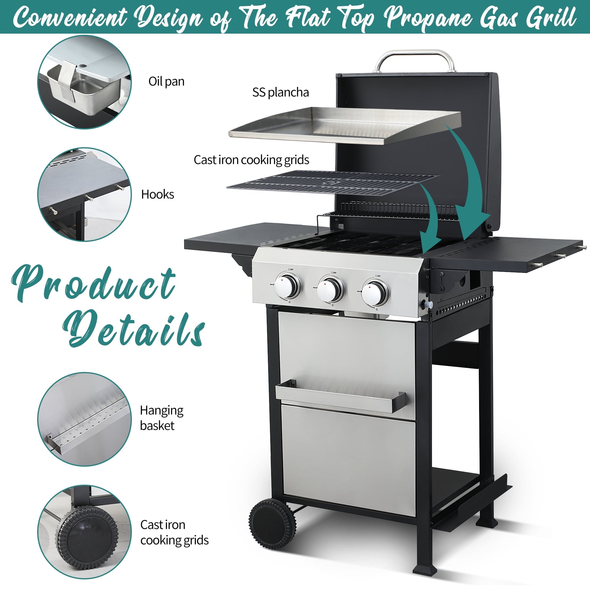 3-Burner Flattop Propane Gas Grill with Folding Side Table – 36,900 BTU Outdoor BBQ Grill with Wire Enamel Cooking Grid & Stainless Steel Griddle Combo for Backyard