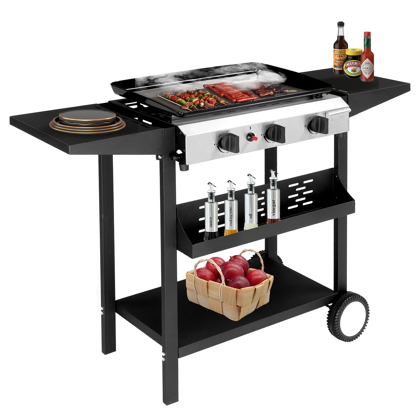 - 😋【Storage at Your Fingertips】: Stay organized with **front spice racks and spacious side shelves**. Keep oils, spatulas, and seasonings within reach, turning chaotic prep into a streamlined masterpiece.