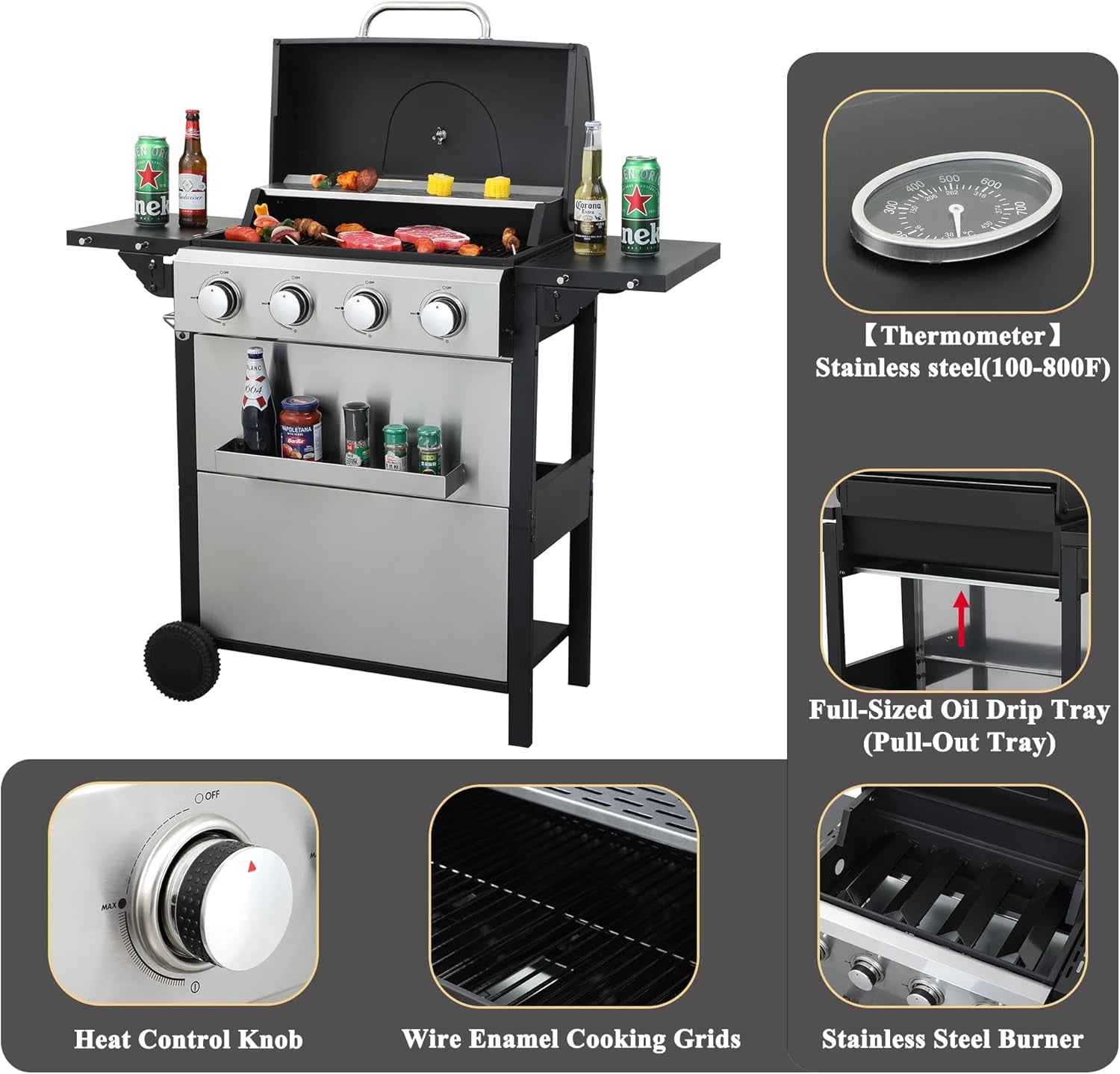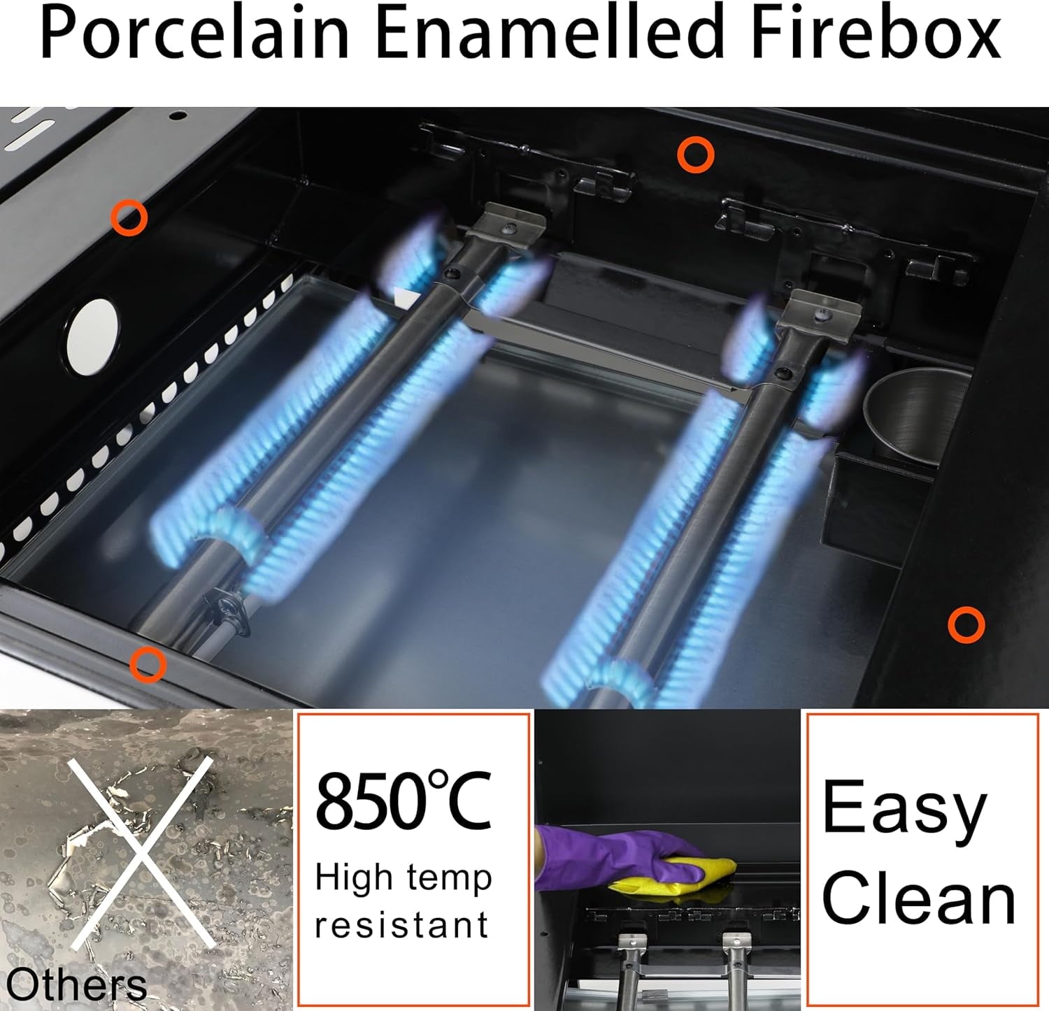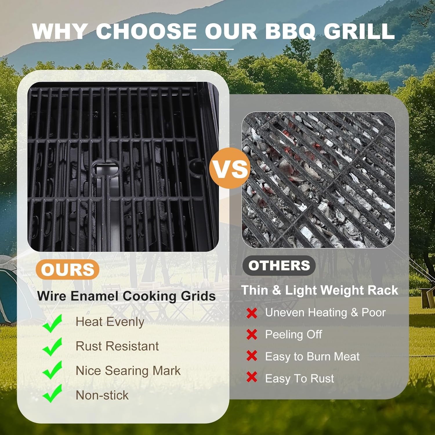 The upgraded wire enamel cooking grids not only facilitate easy cleaning but also prevent rusting and cracking, making them durable for years of use. This grill guarantees even heat distribution, eliminating hot and cold spots for flawless cooking.