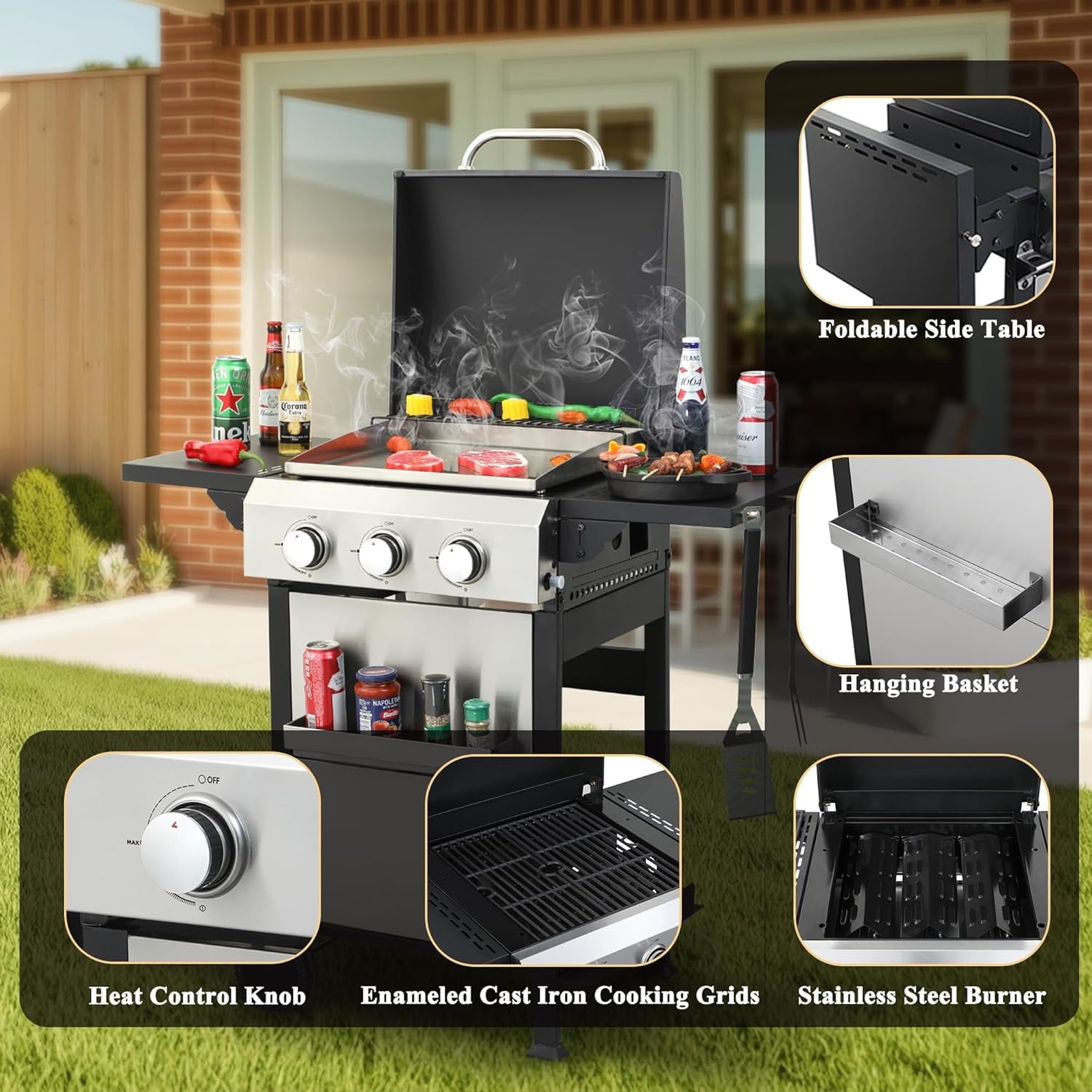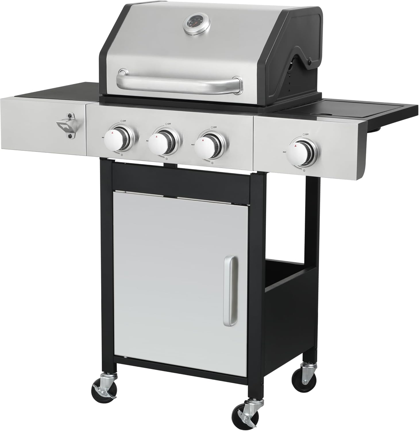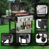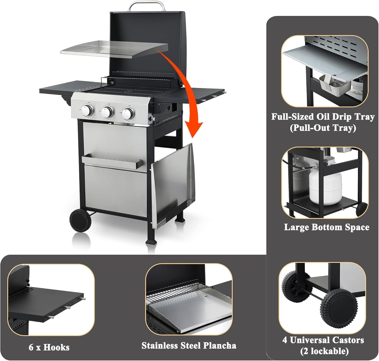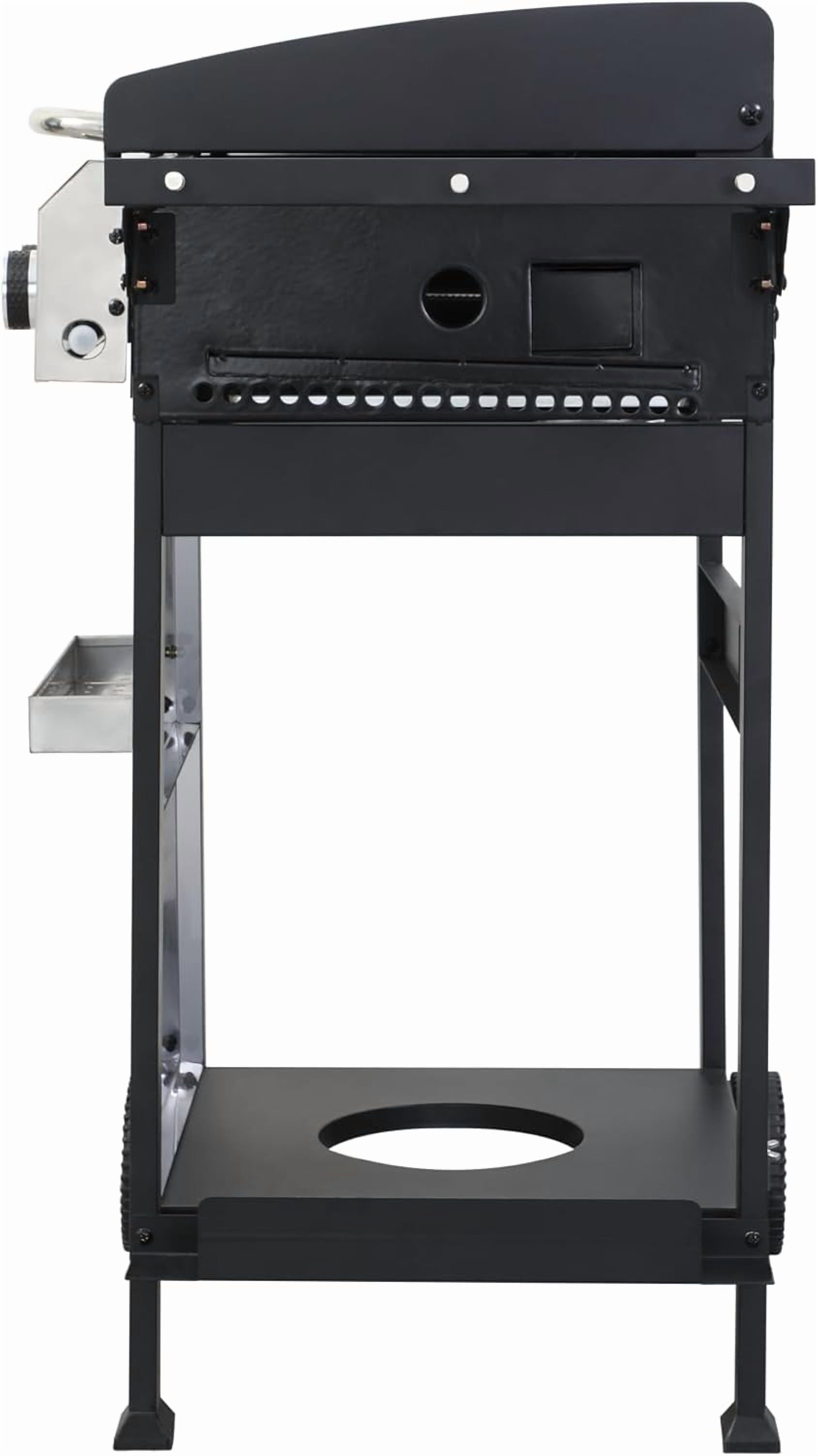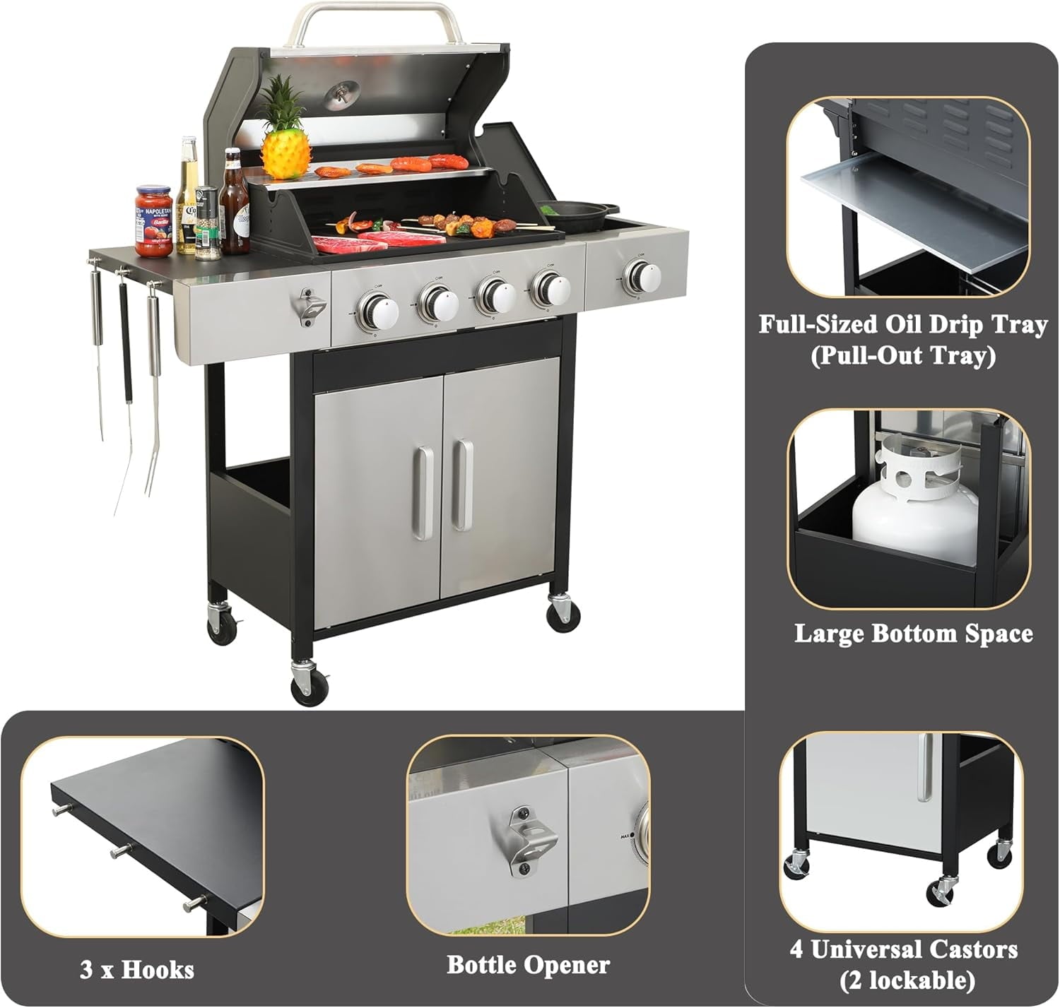 - 【Thoughtful Design】The Gas Grill with Small Storage Cabinet easily stores small gas canisters and provides space for grilling accessories; Powder coated steel finish for increased style and durability; Built-in thermometer monitors temperature in real-time(100-800F); 10.2″W x 13.8″D In. foldable powder coated steel finish side tables and 4 Hooks provides ample space; The bottle opener gives you you the convenience of having a drink whenever you want.