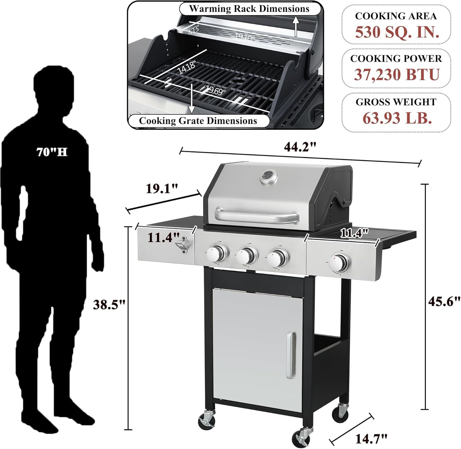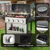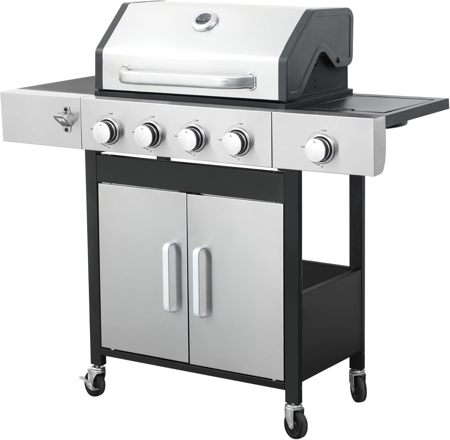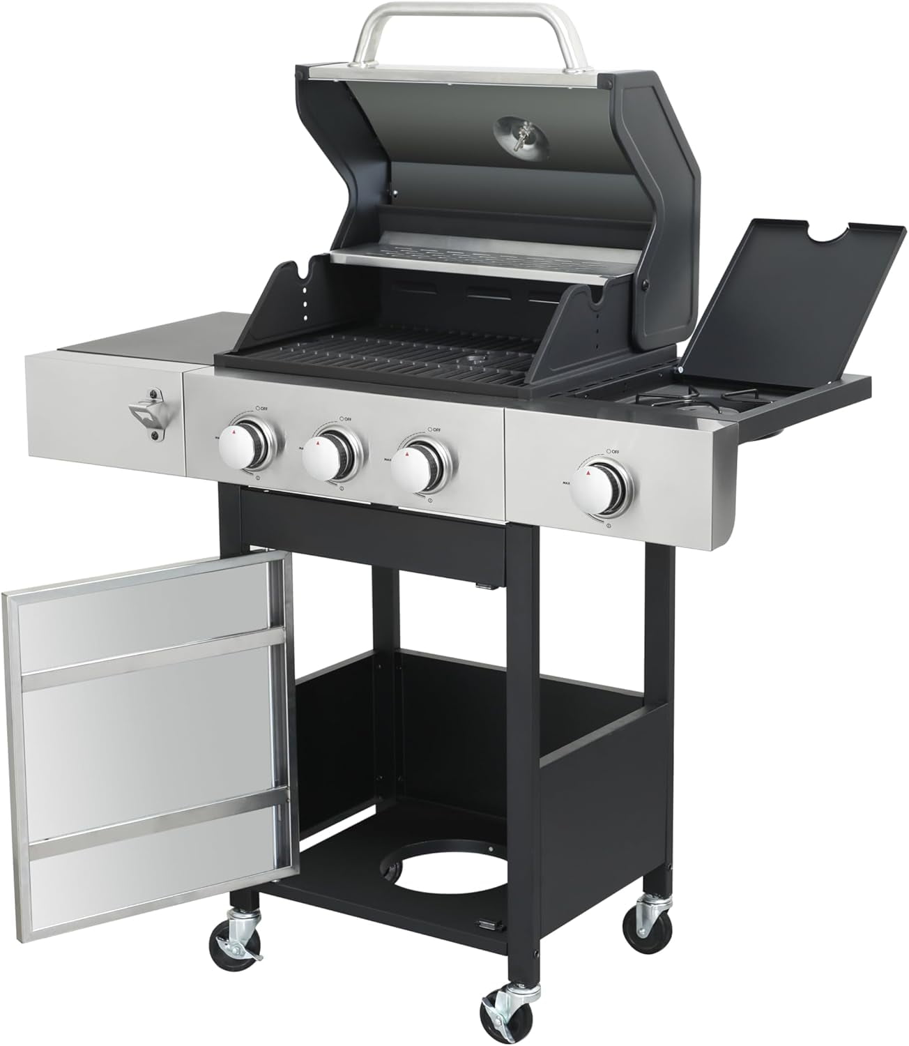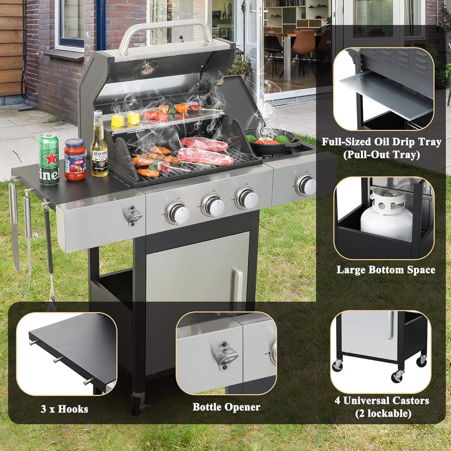 - 【Thoughtful Design】The Gas Grill with Small Storage Cabinet easily stores small gas canisters and provides space for grilling accessories; Powder coated steel finish for increased style and durability; Built-in thermometer monitors temperature in real-time(100-800F); 10.2″W x 13.8″D In. foldable powder coated steel finish side tables and 4 Hooks provides ample space; The bottle opener gives you you the convenience of having a drink whenever you want.