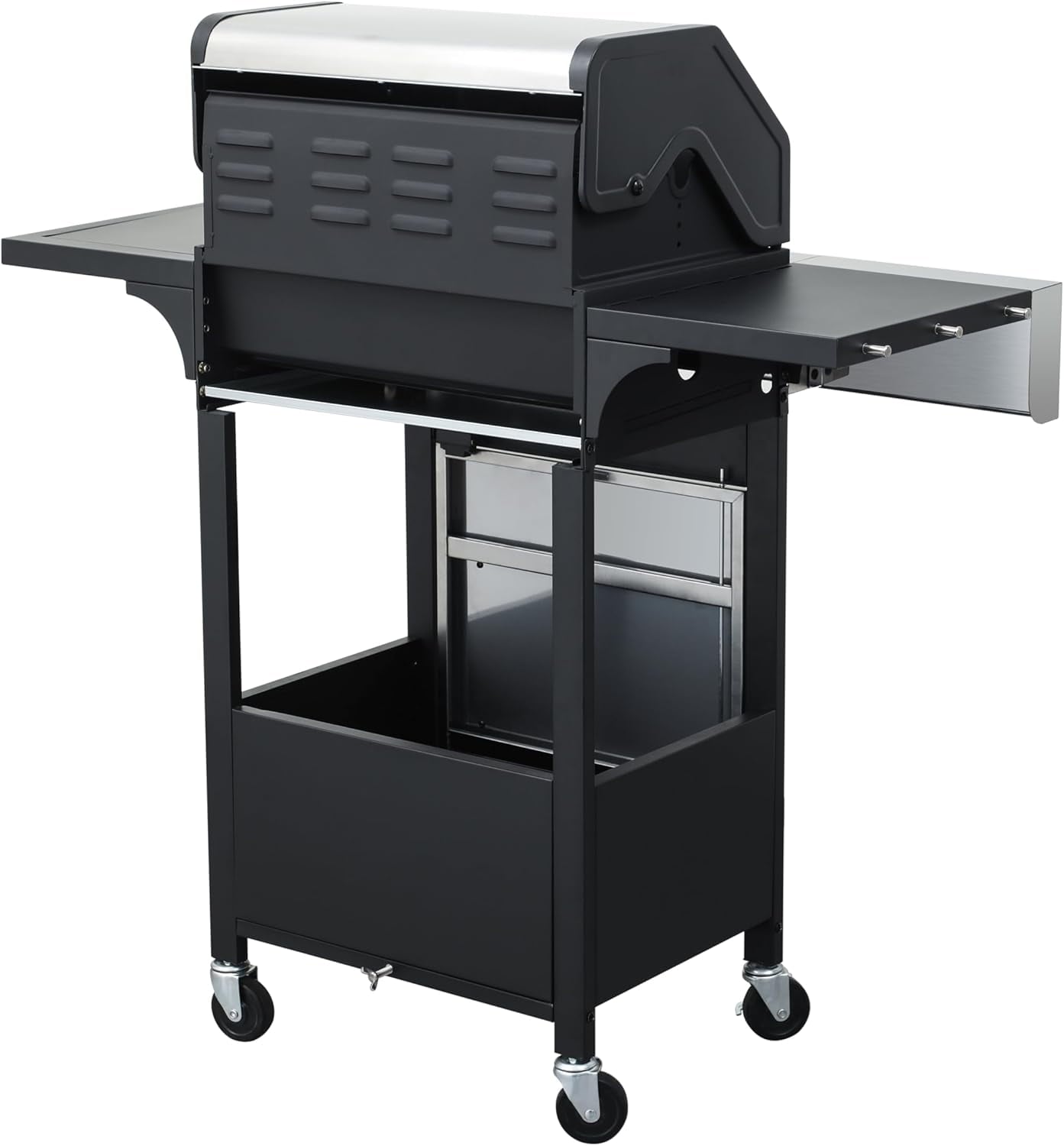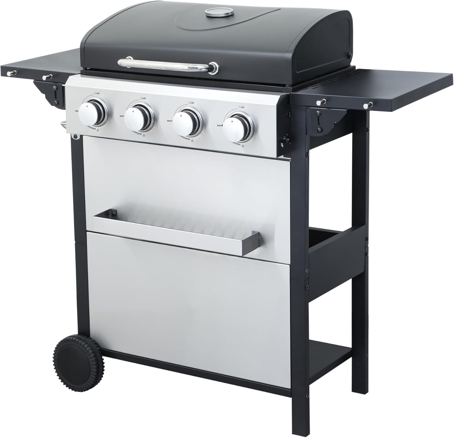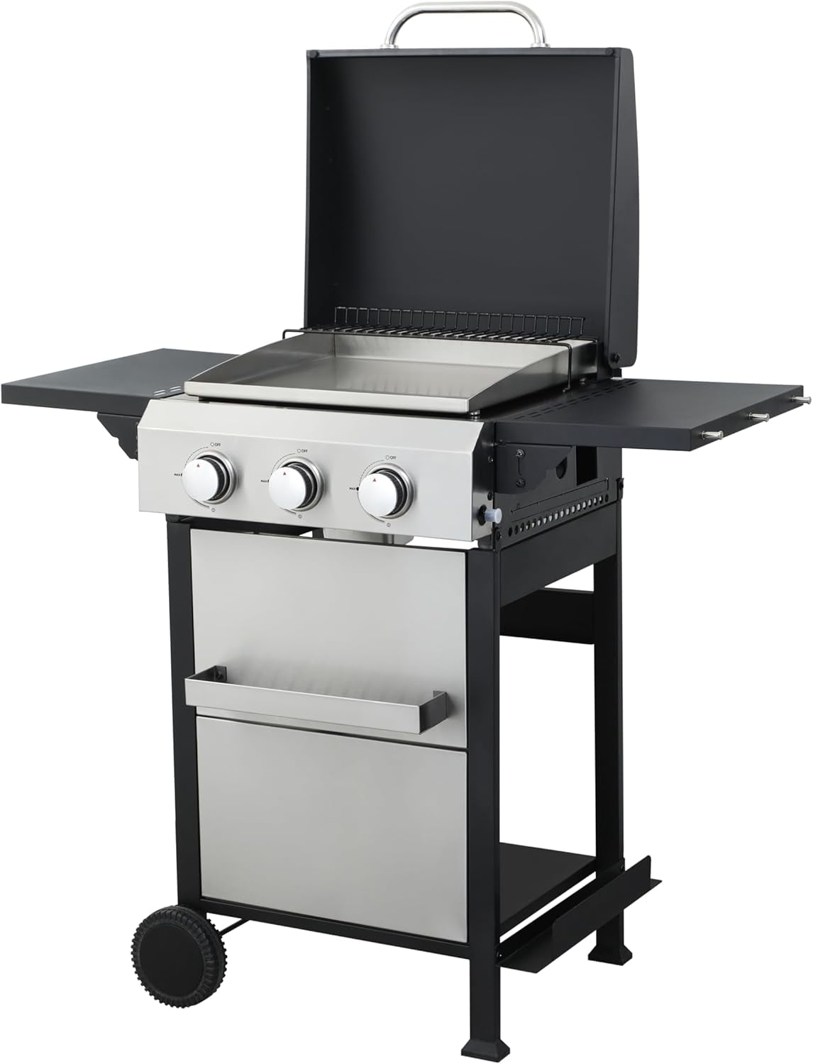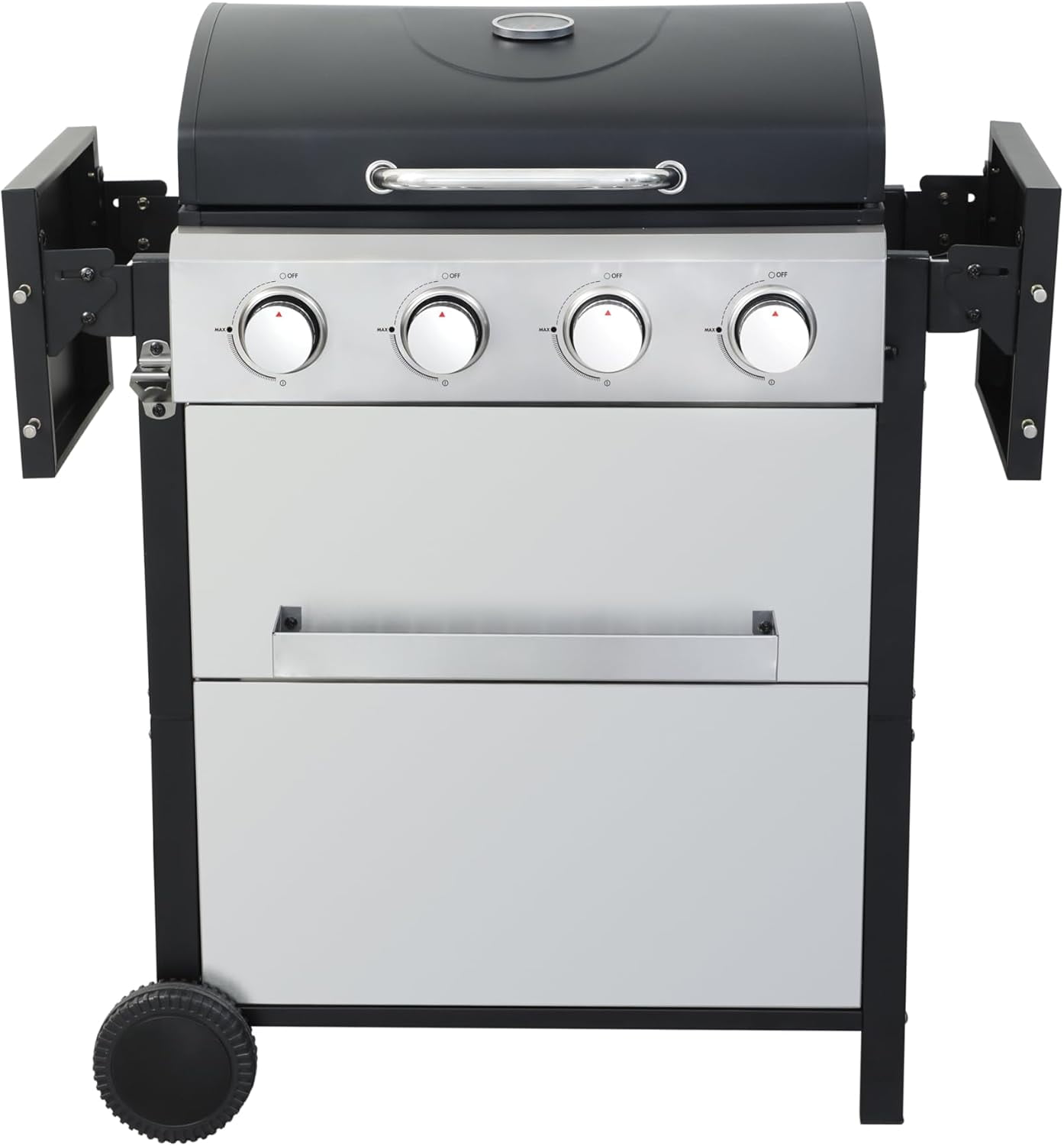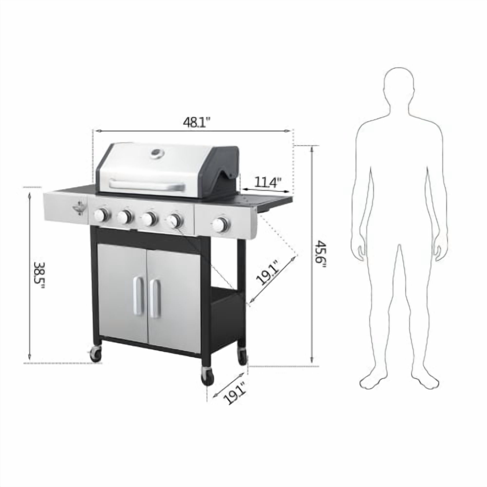 - 【Thoughtful Design】The Gas Grill with Small Storage Cabinet easily stores small gas canisters and provides space for grilling accessories; Powder coated steel finish for increased style and durability; Built-in thermometer monitors temperature in real-time(100-800F); 10.2″W x 13.8″D In. foldable powder coated steel finish side tables and 4 Hooks provides ample space; The bottle opener gives you you the convenience of having a drink whenever you want.